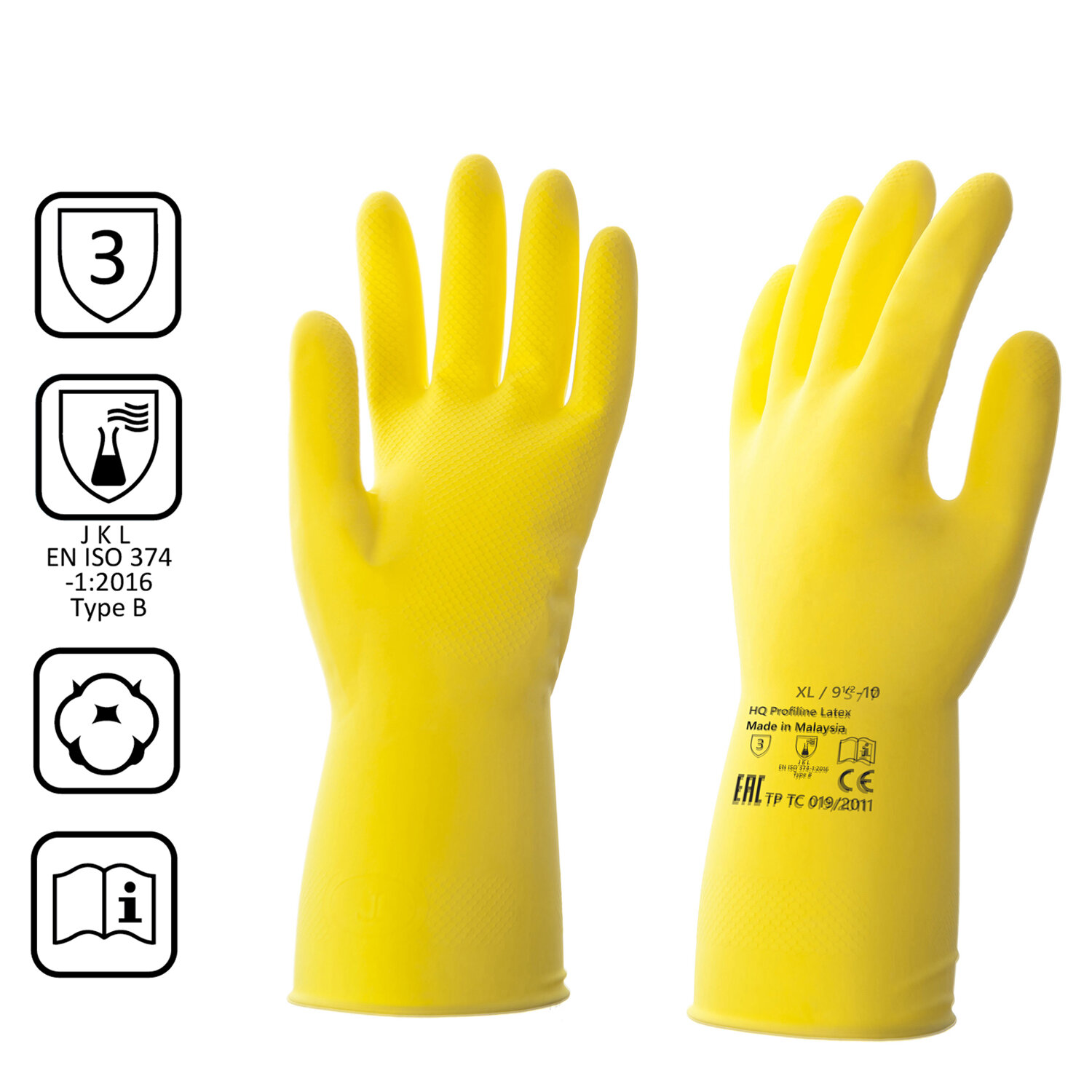 Перчатки латексные КЩС, сверхпрочные, плотные, хлопковое напыление, размер 9,5-10, XL (очень большой), желтые, HQ Profiline Код товара: 608752 204,13 ₽ Купить Производитель:HQ Profiline Универсальные латексные перчатки КЩС с хлопковым напылением, прочные на растяжение и прокол. Подходят для ежедневной уборки, в том числе с использованием химии и дезинфектантов (согласно инструкции по применению). Рельефная поверхность в области захвата. Химически стойкие. Предназначены для защиты от химических воздействий и общих производственных загрязнений. Внутреннее покрытие из хлопка обеспечивает комфорт во время работы. Перчатки защищают руки от загрязнений, воздействия растворов моющих средств на основе щелочей и кислот и прочих раздражителей. Степень защиты от кислот – 80%, степень защиты от щелочей – 40%.Производство: МалайзияЗащита от: химических воздействийРазмер: 9-10 (XL)Размер производителя: 9,5-10 (XL)Вид: КЩСМатериал основы: латексПокрытие внешнее: нетПодкладка: хлопковое напылениеСерия: КЩССтепень защиты от кислот: 80%Степень защиты от щелочей: 40%Поверхность области захвата: рельефнаяКоличество в комплекте: 1 парДлина: 310 ммТолщина: 0.35 ммЦвет: желтыйВес: 70 грРазмер упаковки: 1.2 × 19.8 × 13 смОбъём: 0.0002 м3Промежуточная упаковка: 50 штТранспортная упаковка: 50 штШтрих-код: 4606066235903 Файлы Сертификат-1.jpg Сертификат-2.jpg Сертификат-3.jpg Сертификат-4.jpg
