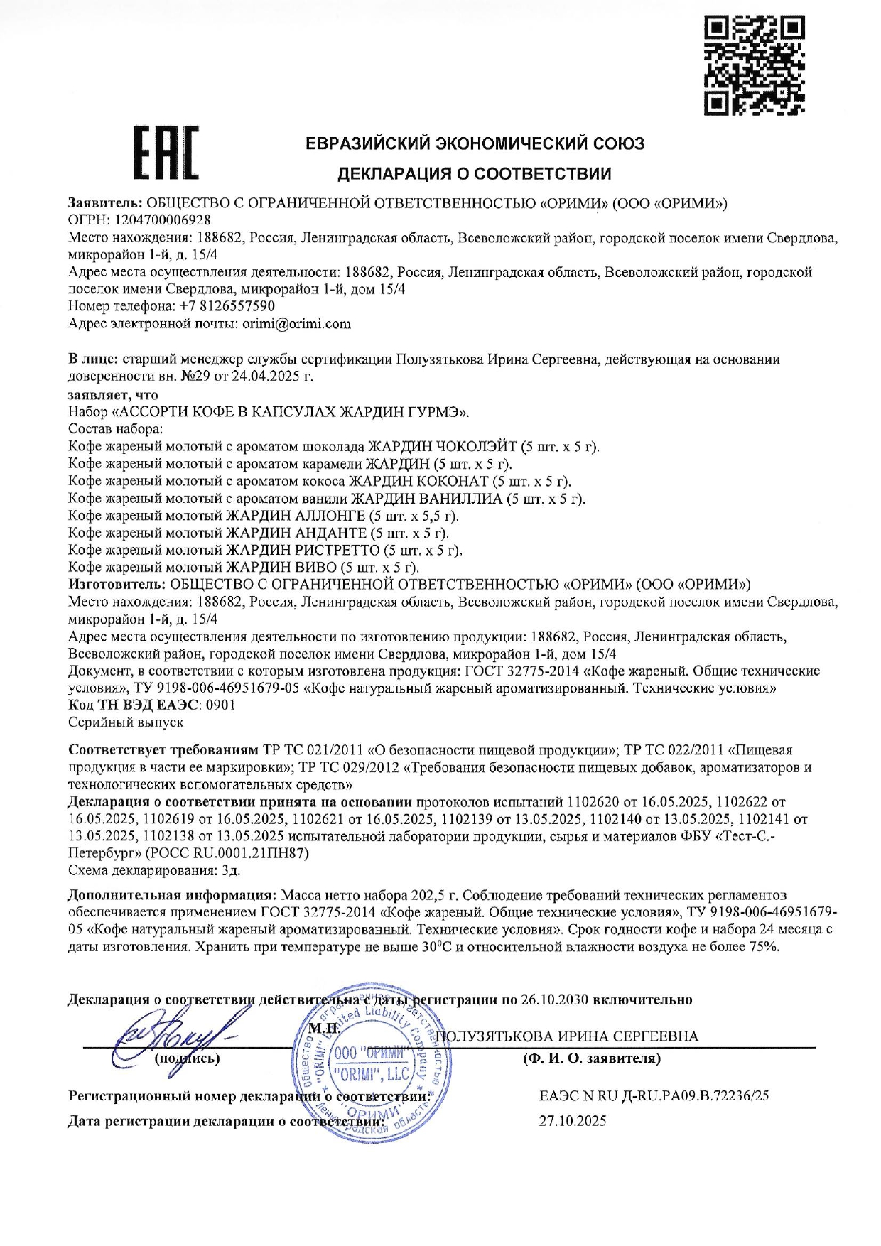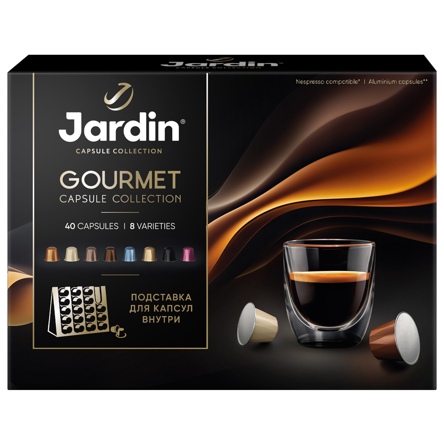 Кофе в капсулах 40 капсул, 8 вкусов, для Nespresso, JARDIN "Grand Capsule Collection" Код товара: 624761 1 568,62 ₽ Купить Производитель:JARDIN Ассорти алюминиевых капсул JARDIN "Grand Capsule Collection" – дегустационный сет для тех, кто хочет найти свой вкус в коллекции кофейных капсул. Условия хранения: хранить в защищенном от прямых солнечных лучей месте при температуре не выше +30 °С. Состав: кофе жареный молотый, ароматизаторы. Где пригодится: - дома: чтобы каждый день начинать с нового вкуса; - в офисе: для разнообразия кофейного меню и встреч с коллегами; - в подарок: любители кофе оценят продуманный набор; - для дегустаций; - в путешествиях с портативной кофемашиной Nespresso.Производство: РоссияВид капсульной системы: NespressoВид напитка: кофе в капсулахСтепень обжарки: ассортиКоличество кофейных капсул в упаковке: 40 шт.Количество шоколадных капсул в упаковке: 8 шт.Количество молочных капсул в упаковке: 0 шт.Тип кофе: в капсулахВкус: ассорти из 8Вес кофейной капсулы: 5 гВес шоколадной капсулы: 5 гВес молочной капсулы: 0 гСрок годности: 24 мес.Фирма-производитель: Орими трейдСрок годности: 24 месВес: 501 грРазмер упаковки: 8.9 × 26.8 × 19.6 смОбъём: 0.0053 м3Промежуточная упаковка: 6 штТранспортная упаковка: 6 штШтрих-код: 4605246020803 Файлы Сертификат-1.jpg Сертификат-2.jpg Сертификат-3.jpg