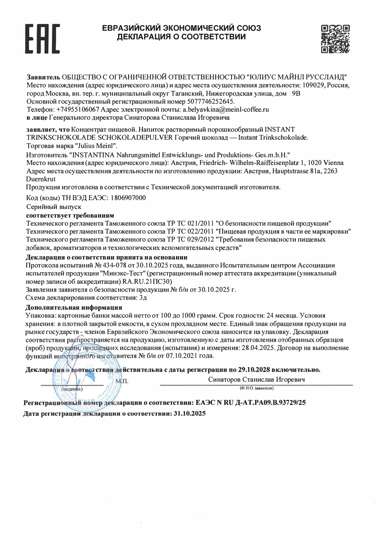 Горячий шоколад JULIUS MEINL "Trinkschokolade", банка 300 г, АВСТРИЯ Код товара: 622752 1 022,6 ₽ Купить Производитель:JULIUS MEINL Для любителей классики – согревающий горячий шоколад, чрезвычайно простой в приготовлении. Нежная структура напитка придется по душе и взрослым, и детям. Состав: сахар, какао порошок (32%), глюкоза, соль, ароматизатор (ванилин). Способ приготовления: 4-5 чайных ложек смеси на чашку 150 мл. Добавить горячее молоко или воду и тщательно перемешать.Производство: АвстрияМасса нетто: 300 гВид напитка: горячий шоколадУпаковка: банкаФирма-производитель: Julius Meinl Italia S.p.A.Срок годности: 24 мес.Вкус: КлассическийСрок годности: 24 месВес: 359 грРазмер упаковки: 10.5 × 13 × 10.5 смОбъём: 0.0015 м3Промежуточная упаковка: 12 штТранспортная упаковка: 12 штШтрих-код: 9000403796709 Сертификат-1.jpg Сертификат-2.jpg Сертификат-3.jpg