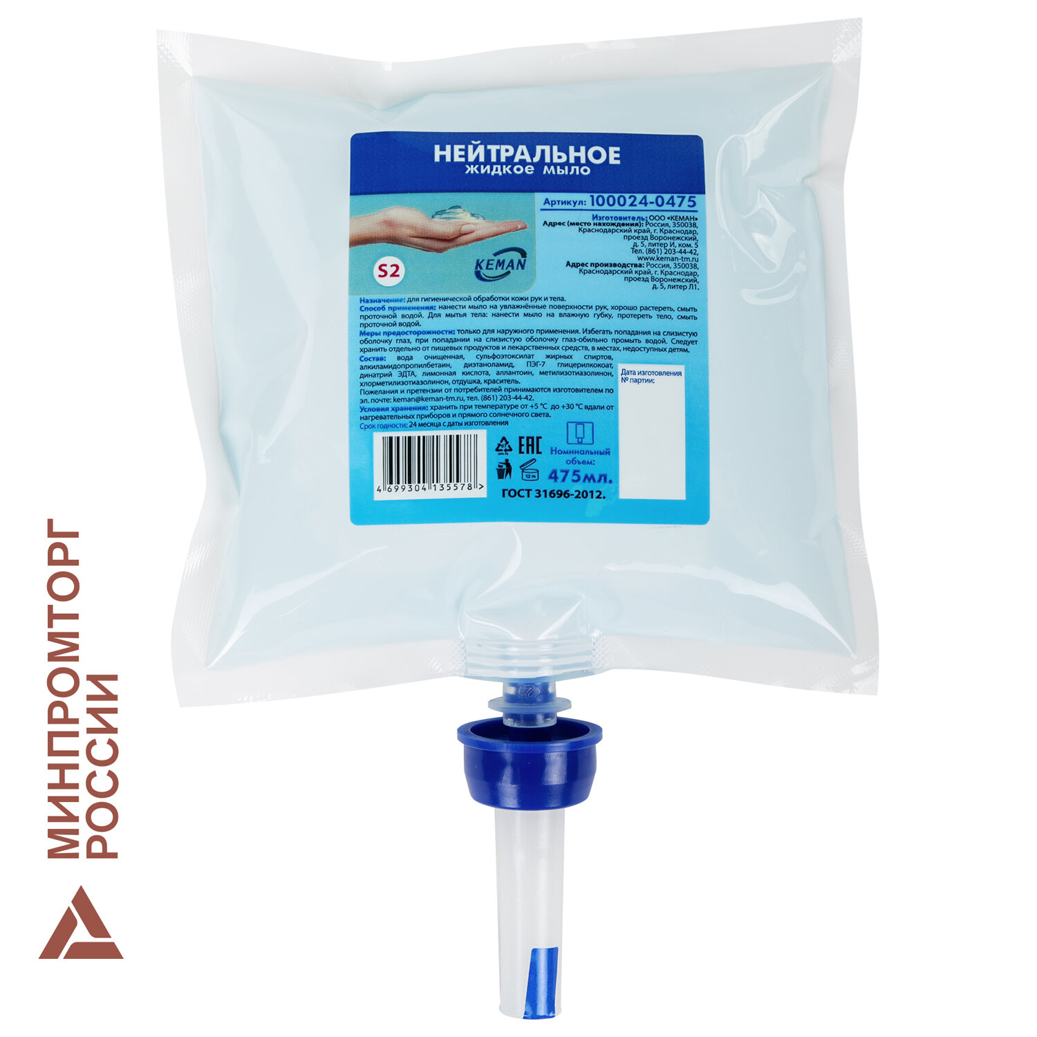 Картридж с жидким мылом одноразовый (Система S2) "Нейтральное", синее, 0,475 л, KEMAN Код товара: 607754 249,58 ₽ Купить Производитель:KEMAN Жидкое мыло KEMAN предназначено для гигиенической обработки кожи рук и тела. В состав мыла входят только высококачественные ингредиенты, полностью соответствующие европейским стандартам безопасности. Изготовлен по ГОСТу - 31696-2012. Условия хранения: от +5 до +30 вдали от нагревательных приборов и прямого солнечного света. Срок годности: 24 месяца с даты изготовления. В рецептуру заложены защищающие и смягчающие кожу рук компоненты, что обеспечивает сохранение здоровой кожи рук даже после многократного использования мыла в течение дня. Каждый картридж мыла герметично запечатан и снабжён одноразовым дозирующим устройством, что предотвращает риск перекрёстного загрязнения и препятствует попаданию бактерий внутрь картриджа. Меры предосторожности: только для наружного применения. Избегать попадания на слизистую оболочку глаз, при попадании - обильно промыть водой. Следует отдельно хранить от пищевых и лекарственных средств, в местах, недоступных детям. Способ применения: для мытья рук: нанести небольшое количество жидкого мыла на увлажнённые поверхности рук, смыть проточной водой. Для мытья тела: нанести мыло на влажную губку, протереть кожные покровы, смыть проточной водой.Производство: РоссияДиспенсерная система : S2Объем картриджа: 0.475 лАртикул: 100024-0475Вид мыла: жидкое мылоКоличество порций мыла: 475Одноразовый: даНазначение: для рукОтдушка: НейтральнаяЭффект от использования мыла: уходЦвет мыла: светло-голубойСрок годности: 24 месВес: 516 грРазмер упаковки: 3.4 × 23 × 16.1 смОбъём: 0.0013 м3Промежуточная упаковка: 6 штТранспортная упаковка: 6 штШтрих-код: 4699304135578 Файлы Приложение-1.pdf Приложение-2.jpg Приложение-3.pdf Приложение-4.jpg Приложение-5.pdf Приложение-6.pdf Сертификат-1.jpg Сертификат-2.jpg Сертификат-3.jpg