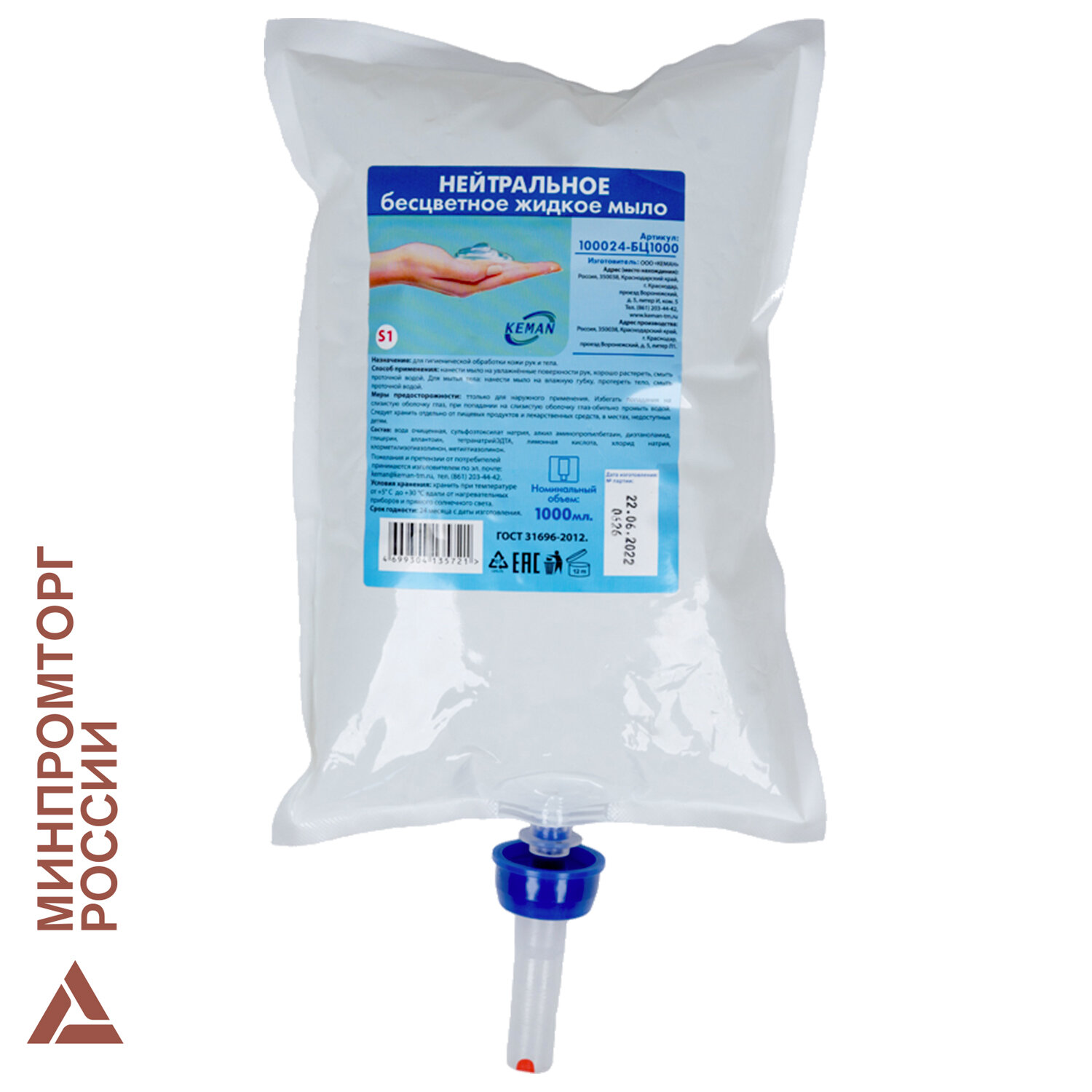 Картридж с жидким мылом одноразовый (Система S1) "Нейтральное", бесцветное, 1 л, KEMAN Код товара: 608333 319 ₽ Купить Производитель:KEMAN Нейтральное бесцветное жидкое мыло KEMAN предназначено для гигиенической обработки кожи рук и тела. В состав мыла входят только высококачественные ингредиенты, полностью соответствующие европейским стандартам безопасности. Картридж объемом 1000 мл предназначен для диспенсерной системы S1. В состав входят защищающие и смягчающие кожу компоненты, что обеспечивает сохранение здоровой кожи рук даже после многократного использования мыла в течение дня. Каждый картридж мыла герметично запечатан и снабжён одноразовым дозирующим устройством, что предотвращает риск перекрёстного загрязнения и препятствует попаданию бактерий внутрь картриджа. Меры предосторожности: только для наружного применения. Избегать попадания на слизистую оболочку глаз, при попадании – обильно промыть водой. Следует хранить отдельно от пищевых и лекарственных средств, в местах, недоступных детям. Способ применения: для мытья рук: нанести небольшое количество жидкого мыла на увлажнённые поверхности рук, смыть проточной водой. для мытья тела: нанести мыло на влажную губку, протереть кожные покровы, смыть проточной водой. Изготовлено по ГОСТу - 31696-2012. Условия хранения: от +5 до +30 °C вдали от нагревательных приборов и прямого солнечного света. Срок годности: 24 месяца с даты изготовления.Производство: РоссияДиспенсерная система : S1Объем картриджа: 1 лАртикул: 100024-БЦ1000Вид мыла: жидкое мылоКоличество порций мыла: 1000Одноразовый: даНазначение: для рук, для телаОтдушка: НейтральнаяЭффект от использования мыла: уходЦвет мыла: прозрачныйСрок годности: 24 месВес: 1,08 кгРазмер упаковки: 4.4 × 30.8 × 14.4 смОбъём: 0.0023 м3Промежуточная упаковка: 6 штТранспортная упаковка: 6 штШтрих-код: 4699304135721 Файлы Приложение-1.pdf Приложение-2.pdf Сертификат-1.jpg Сертификат-2.jpg Сертификат-3.jpg