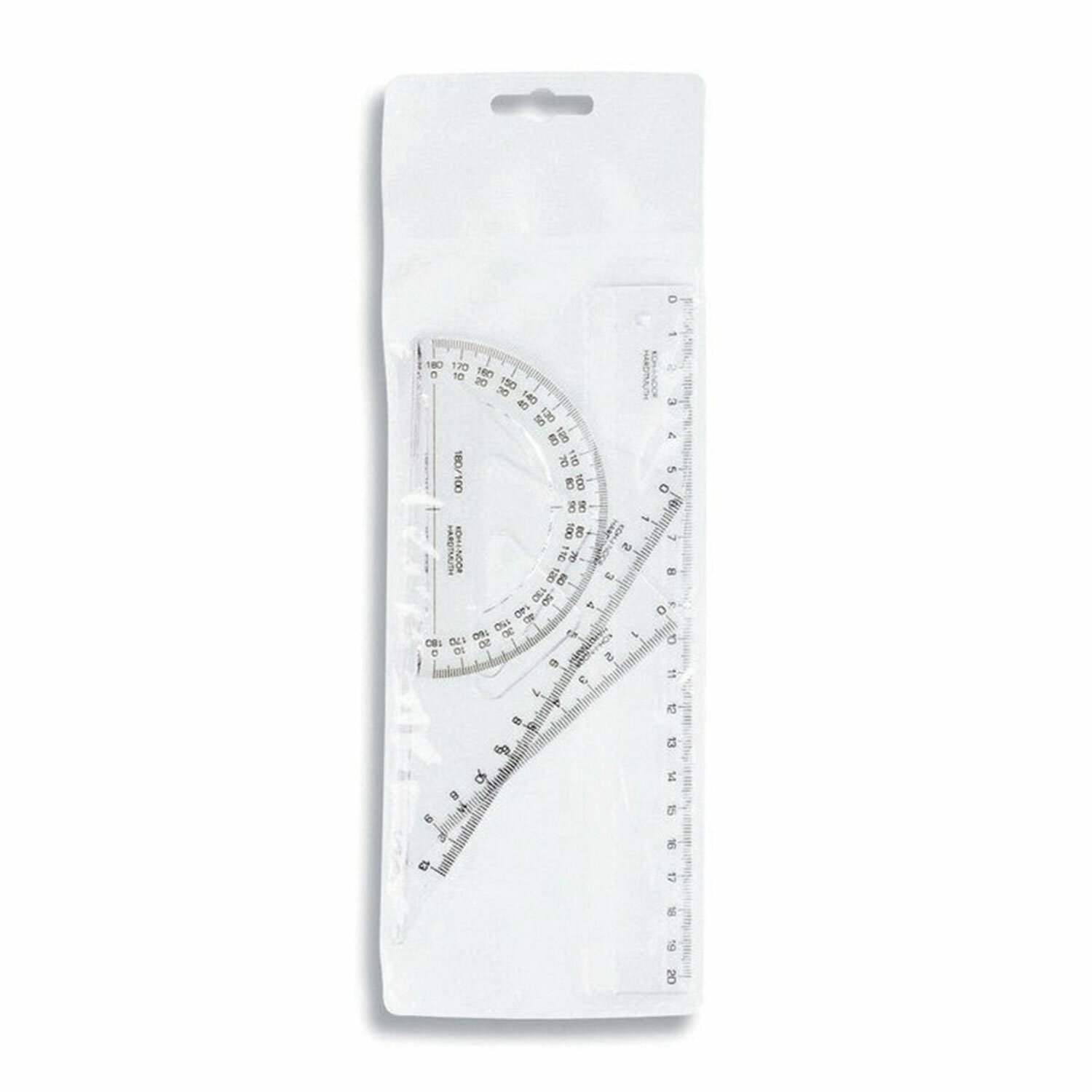 Набор чертежный малый KOH-I-NOOR (линейка 20 см, 2 треугольника, транспортир), прозрачный, европодвес, 750950 Код товара: 210858 437,59 ₽ Купить Производитель:KOH-I-NOOR В малый чертежный набор KOH-I-NOOR входят: линейка со шкалой 20 см; угольник с углами 30/60/90° и шкалой 13 см; угольник с углами 45/45/90° и шкалой 9 см; транспортир 180/100°. Геометрический набор KOH-I-NOOR включает все, что необходимо школьнику. Элементы геометрического набора KOH-I-NOOR изготовлены из высококачественного прозрачного полистирола. Шкалы печатаются с использованием точной технологии трафаретной печати. Печать устойчива к износу. Точность шкалы длины составляет 0,2% от длины. Изделия упакованы в полупрозрачный полипропиленовый футляр с европодвесом.Производство: ЧехияКоличество предметов в наборе: 4 шт.Максимальная длина разметки: 20 смКомплектация: большой треугольник, линейка, малый треугольник, транспортирМатериал: пластикПрозрачный: даЦвет: прозрачныйУпаковка: пакет с европодвесомВес: 48 грРазмер упаковки: 0.5 × 21.4 × 9 смОбъём: 0.0002 м3Промежуточная упаковка: 20 штТранспортная упаковка: 20 штШтрих-код: 8593540111920 Сертификат-1.jpg Сертификат-2.jpg Сертификат-3.jpg