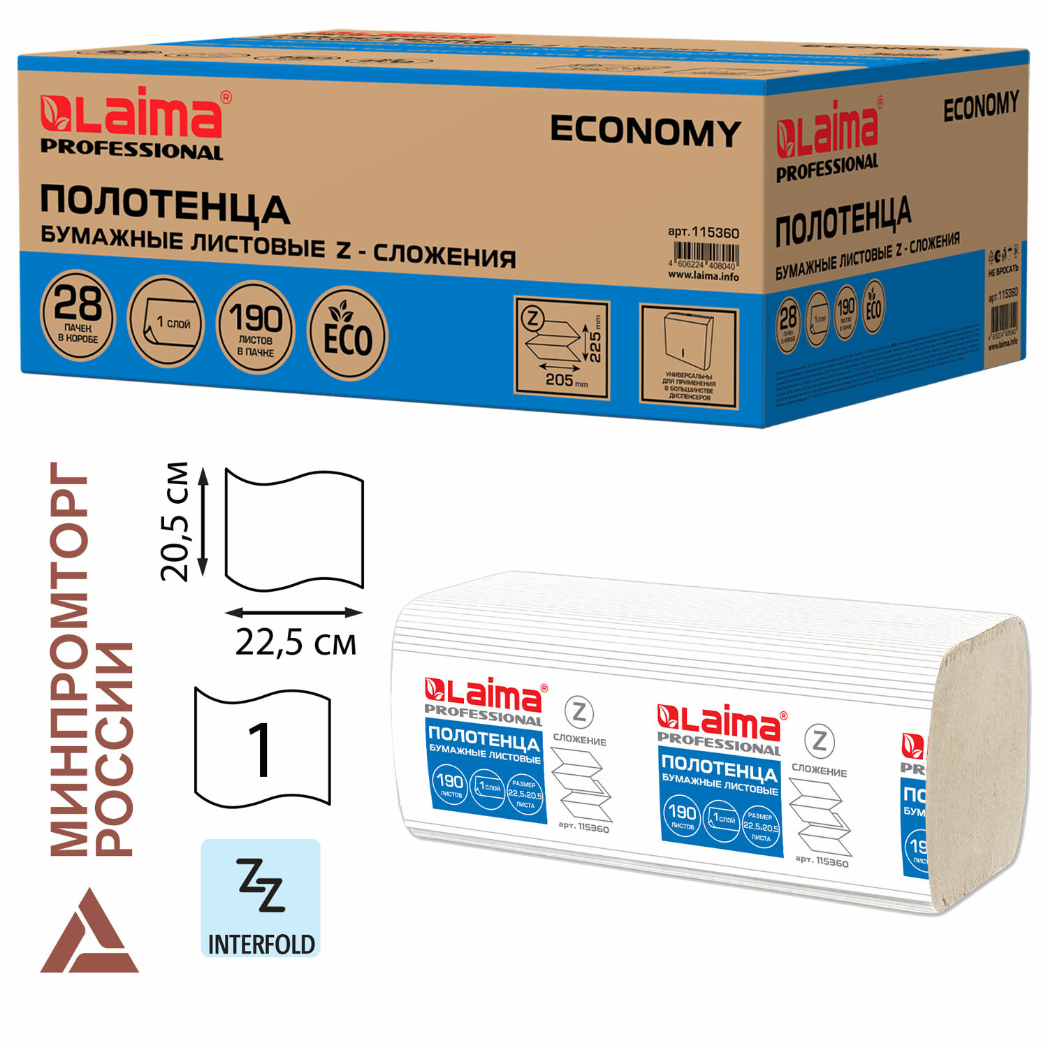 Полотенца бумажные 190 шт., КОМПЛЕКТ 28 пачек, LAIMA ECONOMY (H2), Z-сложение, натуральный цвет, 22,5х20,5 см Код товара: 115360 2 133,2 ₽ Купить Производитель:LAIMA Бумажные полотенца LAIMA – лучший способ поддержания высокого уровня гигиены. Отлично удаляют жир, впитывают масла, воду и другие загрязнения. Подходят для использования дома и в общественных заведениях, оптимальны для мест с большой проходимостью. Полотенца из макулатуры с типом сложения Z имеют один слой с тиснением. Подходят для диспенсеров системы H2 и совместимы с большинством диспенсеров. Расход – 2-3 листа за одно посещение. Размер листа – 22,5х20,5 см. Упаковка вмещает 190 полотенец. 28 штук в спайке. Произведены с использованием вторичного сырья. С заботой о сохранении природных ресурсов.Производство: РоссияДиспенсерная система: H2Тип сложения: Z-сложение (Multifold)Количество слоев: 1Сырье: макулатураЦвет бумаги: натуральныйТиснение: даДоля вторичного сырья: 100 %Перфорация: отдельные листыКоличество в спайке: 28 шт.Количество листов: 190 шт.Ширина листа: 22.5 смДлина листа: 20.5 смШирина пачки/рулона: 20.5 смВысота пачки/рулона: 7.5 смГлубина пачки/рулона: 10.5 смСочетаются с оборудованием других производителей: даАртикул: 115360Серия: EconomyВес: 6,97 кгРазмер упаковки: 21.9 × 55.8 × 41.4 смОбъём: 0.0506 м3Промежуточная упаковка: 1 штТранспортная упаковка: 1 штШтрих-код: 4606224408040 Файлы Сертификат-1.jpg Сертификат-2.jpg Сертификат-3.jpg Сертификат-4.jpg