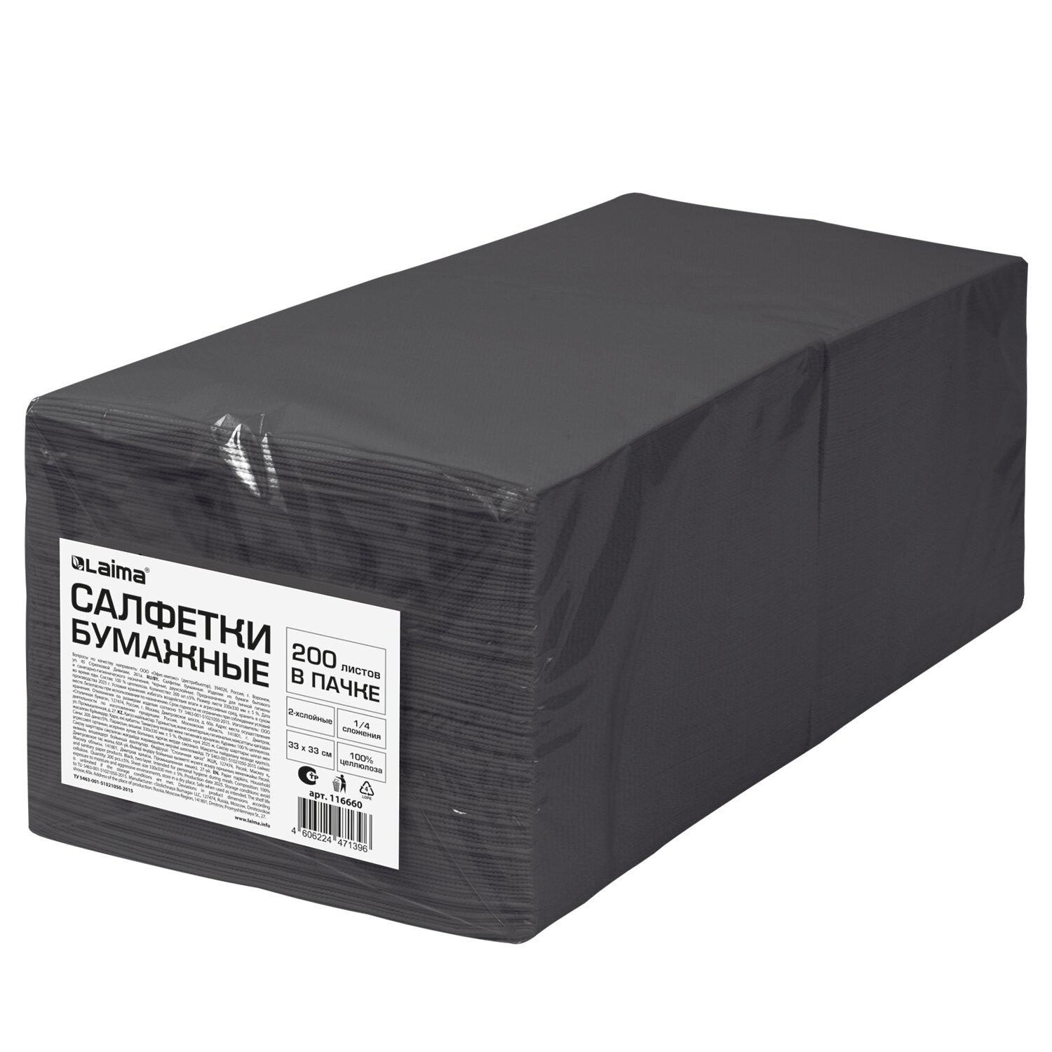 Салфетки бумажные 2-х слойные, 33x33 см, 200 штук в упаковке, 1/4 сложение, LAIMA, черные Код товара: 116660 573,9 ₽ Купить Производитель:LAIMA Бумажные салфетки LAIMA идеальны для повседневного использования не только в офисе и дома, но и в ресторанах, столовых, кофейнях. Прекрасно подходят для сервировки стола на деловом ужине, корпоративной вечеринке. Упаковка содержит 200 салфеток размером 33х33 см. Двухслойные салфетки 1/4 сложения выполнены в классическом черном цвете. Тиснение придает изделию привлекательный внешний вид. Изготовлены из 100% целлюлозы, что обеспечивает прочность и повышенную впитываемость.Производство: РоссияКоличество в комплекте: 200 шт.Длина: 33 смШирина: 33 смКоличество слоев: 2Форма салфетки: квадратнаяСложение салфетки: 1/4Серия: PremiumТиснение: даМатериал: 100% целлюлозаДоля вторичного сырья: 0 %Цвет: черныйВес: 758 грРазмер упаковки: 9.9 × 33.9 × 16.8 смОбъём: 0.006 м3Промежуточная упаковка: 8 штТранспортная упаковка: 8 штШтрих-код: 4606224471396 Сертификат-1.jpg Сертификат-2.jpg Сертификат-3.jpg