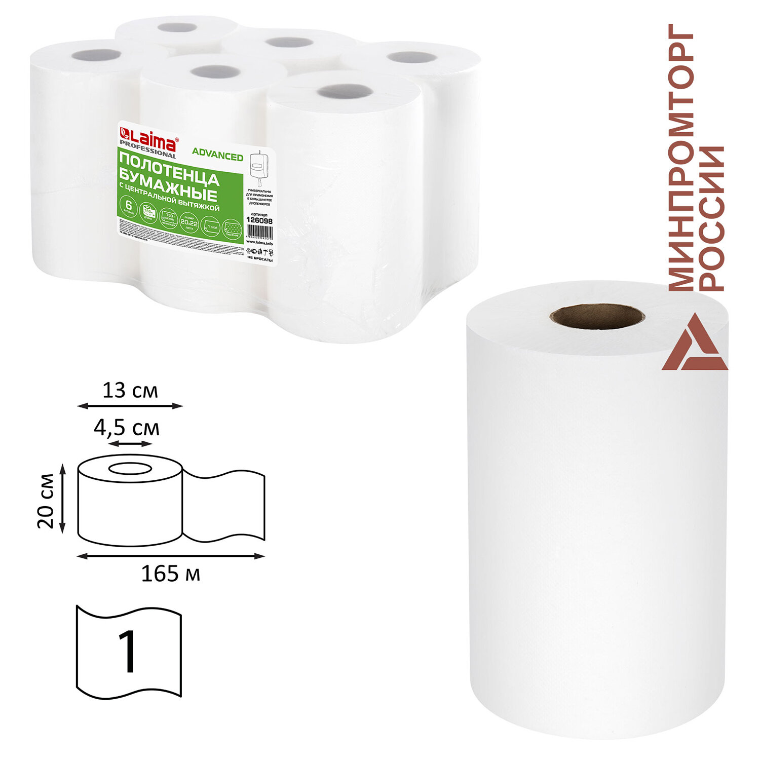 Полотенца бумажные с центральной вытяжкой 165 м, LAIMA (M1/M2) ADVANCED, 1-слойные, белые, КОМПЛЕКТ 6 рулонов Код товара: 126098 1 912,5 ₽ Купить Производитель:LAIMA Однослойные бумажные полотенца LAIMA – лучший способ поддержания высокого уровня гигиены в офисе, местах общественного питания, различных организациях и на предприятиях. Бумажные полотенца в рулонах с центральной вытяжкой арт.126098, позволяют осуществлять по-листовой отбор после удаления центральной картонной втулки. Втулка имеет перфорацию для контролируемого вытягивания из рулона. Данный продукт подходит для диспенсеров системы М1 и M2, но также возможно их применение в диспенсерах системы REFLEX (М3 и М4). Бумага с тиснением для достижения большей мягкости и перфорацией на отдельные листы. Оптимальны для применения на предприятиях общественного питания, в столовых, на кухнях, везде, где требуется уборка столов, столешниц, поверхностей для приготовления пищи. Изготовлены из 100% целлюлозы. Цвет – белый. Длина намотки – 165 м (750 листов). Размер рулона – 13х20х13 см. 6 рулонов в комплекте. Это товар эконом-сегмента, поэтому он отличается привлекательной ценой. Товар обладает базовым набором характеристик и простой упаковкой, при этом полностью соответствует основным требованиям потребителей.Производство: РоссияДиспенсерная система: M2Тип сложения: рулон с центральной вытяжкойКоличество слоев: 1Сырье: 100% целлюлозаЦвет бумаги: белыйДоля вторичного сырья: 0 %Перфорация: даКоличество в спайке: 6 шт.Длина намотки: 165 мКоличество листов: 750 шт.Ширина листа: 20 смДлина листа: 22 смШирина пачки/рулона: 13 смВысота пачки/рулона: 20 смГлубина пачки/рулона: 13 смВнутренний диаметр втулки: 4.5 смСочетаются с оборудованием других производителей: даАртикул: 126098Серия: AdvancedВес: 4,03 кгРазмер упаковки: 20.8 × 38.3 × 26.6 смОбъём: 0.0212 м3Промежуточная упаковка: 1 штТранспортная упаковка: 1 штШтрих-код: 4606224095479 Файлы Приложение-1.pdf Приложение-2.pdf Приложение-3.pdf Сертификат-1.jpg Сертификат-2.jpg