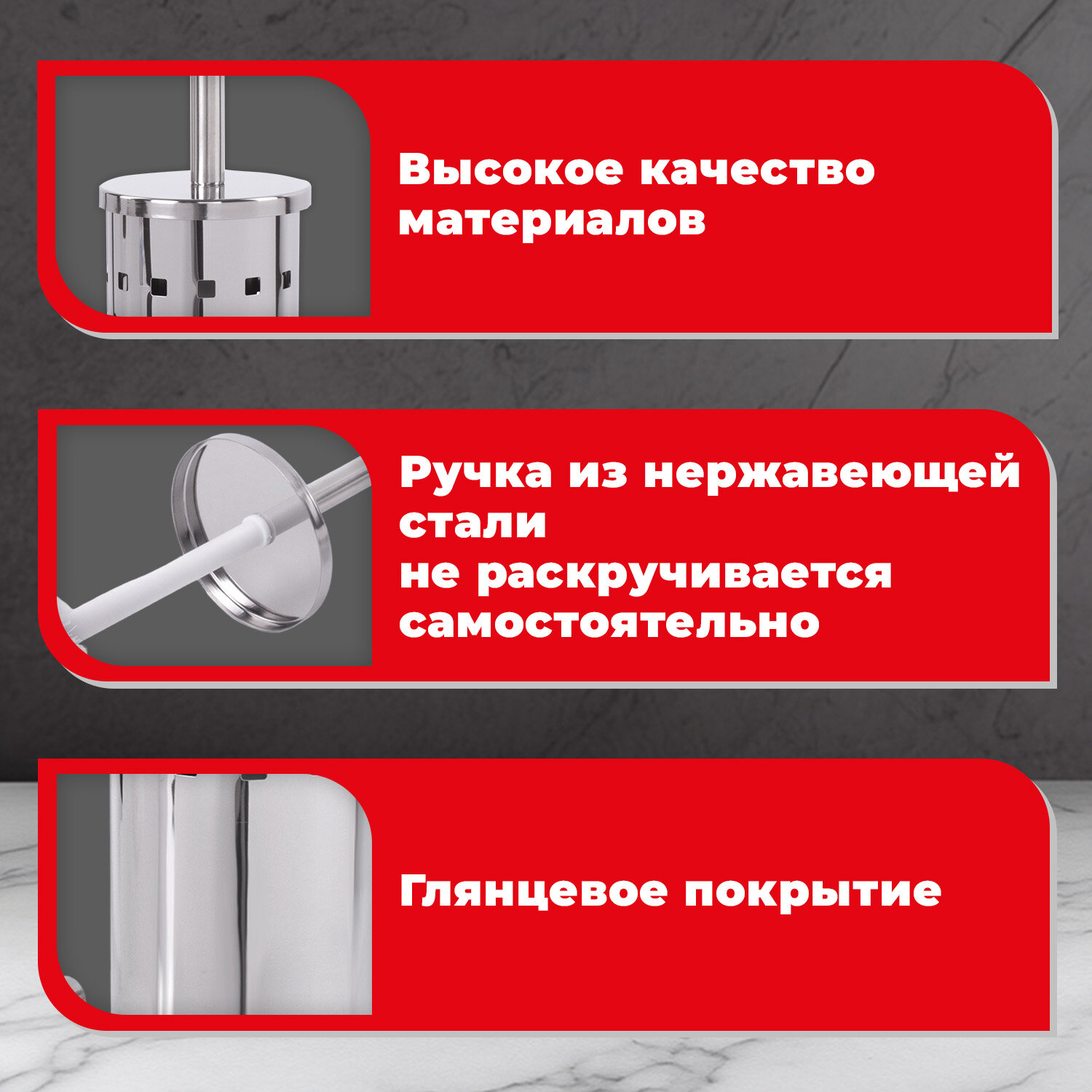 Ершик для унитаза с подставкой, нержавеющая сталь, зеркальный, LAIMA Код товара: 601616 871,33 ₽ Купить Производитель:LAIMA Ершик для унитаза с подставкой в форме колбы с перфорацией LAIMA предназначен для поддержания чистоты санузлов как дома, так и в офисах. Имеет внутренний пластиковый стакан для исключения протекания, защищая от коррозии. Изготовлен из зеркальной нержавеющей стали. Диаметр подставки – 9,5 см. Диаметр щетки – 7,5 см. Высота – 34 см. Конкурентное преимущество комплектов для туалета LAIMA состоит в том, что в них есть специальный герметичный стакан-подставка, который исключает протекание, не ржавеет, не оставляет царапин и следов ржавчины на поверхности. Комплекты отличаются качеством и прослужат долгие годы.Производство: КитайВысота: 34 смДиаметр щетки: 7.5 смНаличие подставки: даФорма подставки: цилиндр с колбойМатериал: металл с покрытиемЦвет: стальнойДиаметр подставки: 9.5 смВес: 405 грРазмер упаковки: 10.4 × 27.9 × 10.2 смОбъём: 0.0036 м3Промежуточная упаковка: 24 штТранспортная упаковка: 24 штШтрих-код: 4606224107219 Сертификат-1.jpg Сертификат-2.jpg Сертификат-3.jpg