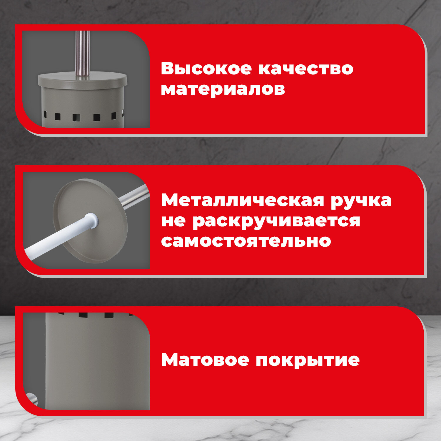 Ершик для унитаза с подставкой, металл, серый, матовый, LAIMA Код товара: 604961 1 143,6 ₽ Купить Производитель:LAIMA Ершик для унитаза с подставкой в форме колбы с перфорацией LAIMA предназначен для поддержания чистоты санузлов как дома, так и в офисах. Имеет внутренний пластиковый стакан для исключения протекания, защищая от коррозии. Изготовлен из металла с порошковым покрытием (серый). Диаметр подставки - 9,5 см. Диаметр щетки - 8 см. Высота - 34 см. Конкурентное преимущество комплектов для туалета LAIMA состоит в том, что в них есть специальный герметичный стакан-подставка, который исключает протекание, не ржавеет, не оставляет царапин и следов ржавчины на поверхности. Комплекты отличаются качеством и прослужат долгие годы.Производство: КитайВысота: 34 смДиаметр щетки: 8 смНаличие подставки: даФорма подставки: цилиндр с колбойМатериал: металл с покрытиемЦвет: серыйДиаметр подставки: 9.5 смВес: 402 грРазмер упаковки: 10.4 × 28 × 10.6 смОбъём: 0.0036 м3Промежуточная упаковка: 24 штТранспортная упаковка: 24 штШтрих-код: 4606224192314 Сертификат-1.jpg Сертификат-2.jpg Сертификат-3.jpg