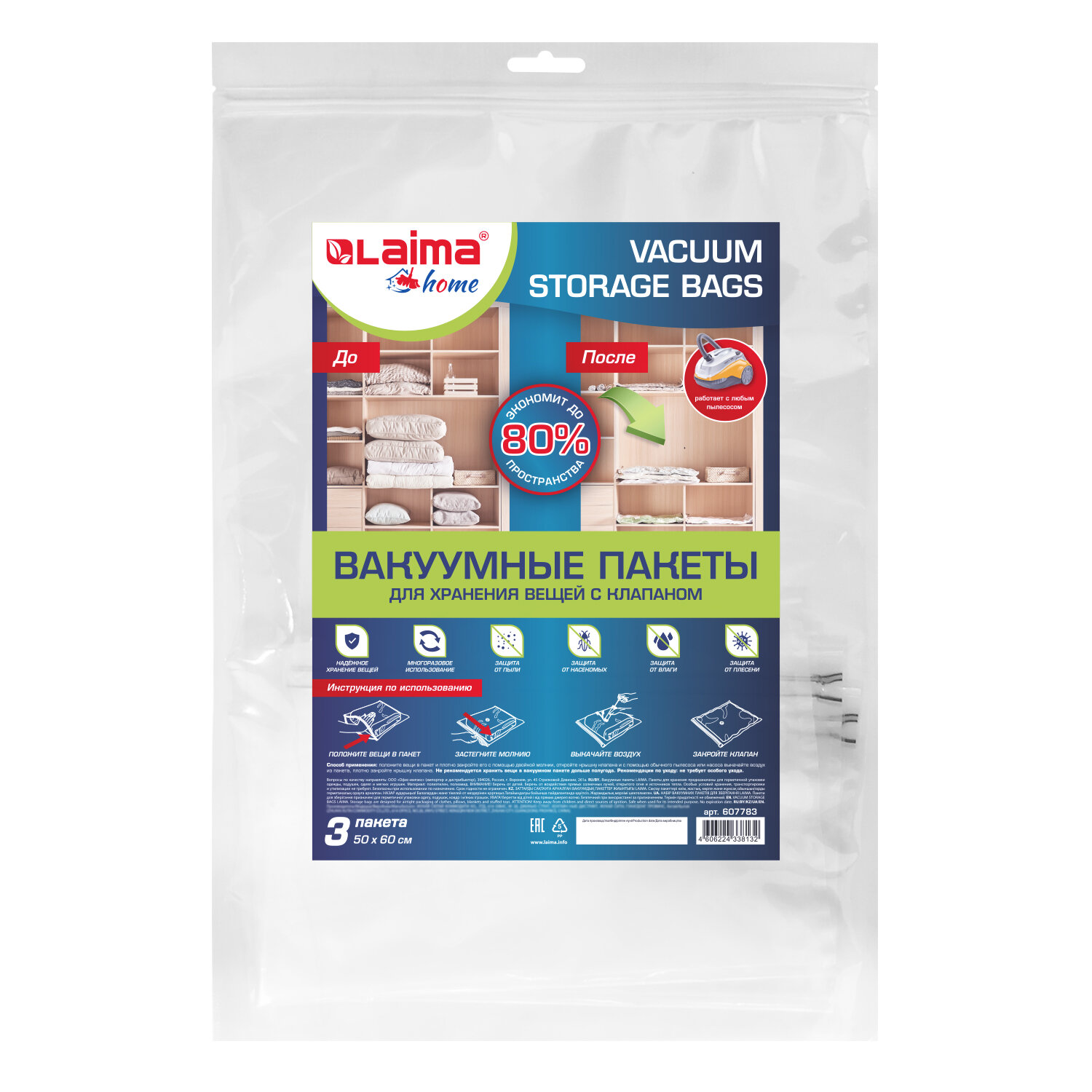 Вакуумный пакет с клапаном для хранения вещей 50х60 см, КОМПЛЕКТ 3 шт., LAIMA HOME Код товара: 607783 208,46 ₽ Купить Производитель:LAIMA Вакуумные пакеты с клапаном LAIMA HOME для хранения вещей предназначены для герметичной упаковки одежды, подушек, одеял и мягких игрушек. Помогут сэкономить до 80% места в шкафу, незаменимы при транспортировке вещей в путешествии и при переезде. Вакуумные пакеты с клапаном для хранения вещей герметичны и водонепроницаемы, защищают вещи от воздействия пыли, влаги, плесени, бактерий и насекомых. Прозрачный материал позволит легко ориентироваться в содержимом и быстро найти нужную вещь. Пакеты изготовлены из высококачественных материалов, обладающих улучшенными эксплуатационными свойствами и имеющих высокую стойкость к повреждениям и проколам. Прочность и эластичность материала, конструкция замка с двойной молнией и клапан с крышкой позволяют использовать пакет многократно. В комплект входят 3 пакета размером 50х60 см. Размер упаковки - 29х44 см.Производство: КитайНазначение: для хранения вещейСерия: HomeКоличество в упаковке: 3 шт.Размер (ШхВ): 50 х 60 смТолщина пакетов: 70 мкмС клапаном: даТип застежки: двойная молнияМатериал: полиэтилен, полиамидЦвет: прозрачныйУпаковка: пакет с европодвесомВес: 199 грРазмер упаковки: 3.2 × 26.3 × 19.4 смОбъём: 0.001 м3Промежуточная упаковка: 90 штТранспортная упаковка: 90 штШтрих-код: 4606224338132 Сертификат-1.jpg Сертификат-2.jpg Сертификат-3.jpg