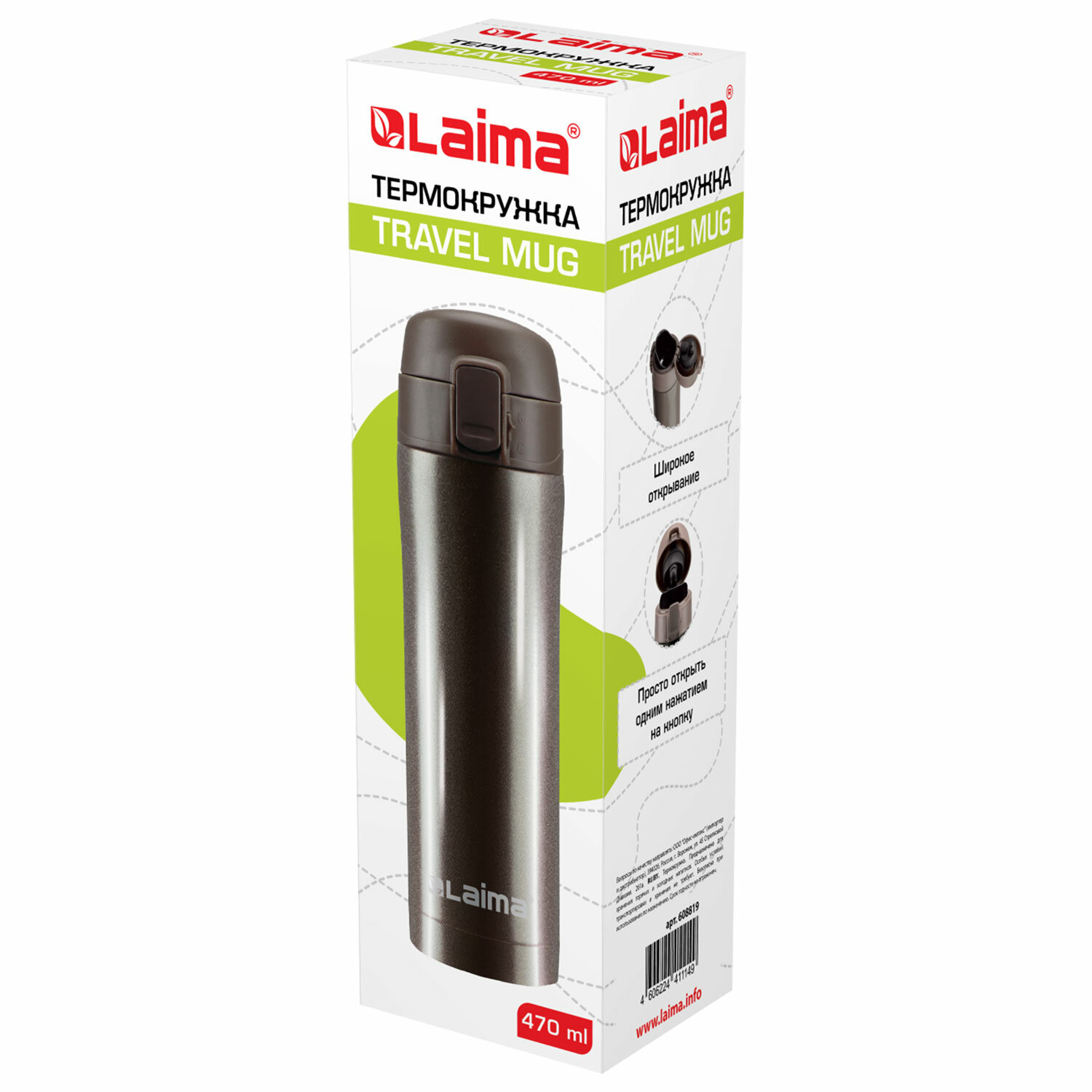 Термокружка 470 мл из нержавеющей стали SUS304, шоколадно-коричневый металлик, LAIMA, 608819 Код товара: 608819 578,04 ₽ Купить Производитель:LAIMA Термокружка LAIMA с двойной стальной стенкой изготовлена из нержавеющей стали марки 304 медицинского уровня. Сконструирована по вакуумной технологии. Термокружка обладает оптимальной формой для фиксации в держателе автомобиля, что позволяет использовать ее во время поездок. Термокружка снабжена откидывающейся крышкой с кнопкой, позволяющей с легкостью использовать ее одной рукой. Также, для защиты от непроизвольного нажатия кнопки, кружка имеет специальный защитный замок-предохранитель. Крышка обеспечивает герметичность и простоту использования. Избежать проливания напитка помогает специальный силиконовый клапан. Держит температуру до 18 ч (в зависимости от условий эксплуатации).Производство: КитайОбъем: 0.47 лОсновной цвет: шоколадныйВысота: 23.5 смДиаметр ободка: 6.5 смМатериал корпуса: нержавеющая стальУпаковка: картонная коробкаВес: 361 грРазмер упаковки: 7.8 × 24.6 × 8 смОбъём: 0.0018 м3Промежуточная упаковка: 12 штТранспортная упаковка: 12 штШтрих-код: 4606224411149 Сертификат-1.jpg Сертификат-2.jpg Сертификат-3.jpg