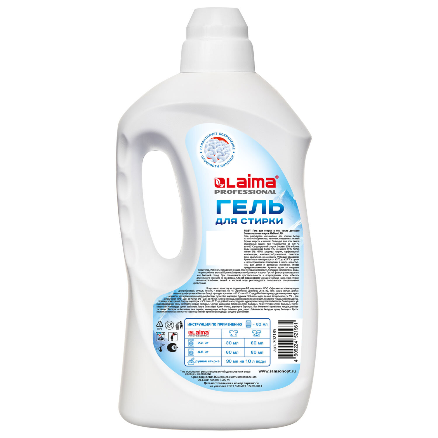 Гель для стирки всех видов тканей универсальный 1,5л LAIMA PROFESSIONAL "Альпийская Свежесть" Код товара: 702185 325,45 ₽ Купить Производитель:LAIMA Гель LAIMA PROFESSIONAL разработан специально для стирки белья из хлопчатобумажных, льняных, смешанных тканей (кроме шерсти и шелка). Эффективно очищает, но при этом полностью вымывается в процессе полоскания, не остаётся на вещах. При постоянном использовании средства вещи надолго сохраняют первоначальную яркость и насыщенность цвета. Подходит для всех типов стиральных машин при температуре от +30С до +60С и для ручной стирки. Состав: 30% и более: воды очищенной; более 5%, но менее 15%: АПАВ, менее 5%: НПАВ, хлорида натрия, парфюмерной композиции, комплексообразователя, пеногасителя, красителя, консерванта. Способ применения: При ручной стирке развести 60 мл средства для стирки в 10 л воды. Замочить на 30 мин, затем постирать и прополоскать в проточной воде. При машинной стирке загрузить 60 мл средства для стирки на 4-5 кг сухого белья в соответствии с инструкцией к стиральной машинке. Хранить при температуре от +5 С до +25 С в сухом и проветриваемом помещении в месте недоступном для детей и домашних животных. Объём: 1,5 л. Соответствует требованиям ГОСТ 2479-2013.Производство: РоссияТип: автоматОбъем/Вес: 1500 мл/гВид средства: гельНазначение: для всех видов тканей, кроме шерсти и шелкаОтдушка: альпийская свежестьКоличество бункеров: 0 шт.Серия: LAUNDRYLIQUIDВид упаковки: бутыльСрок годности: 36 месРазмер упаковки: 28 × 12.5 × 8 смОбъём: 0.0031 м3Промежуточная упаковка: 9 штТранспортная упаковка: 9 штШтрих-код: 4606224521961 Файлы Сертификат-1.jpg Сертификат-2.jpg