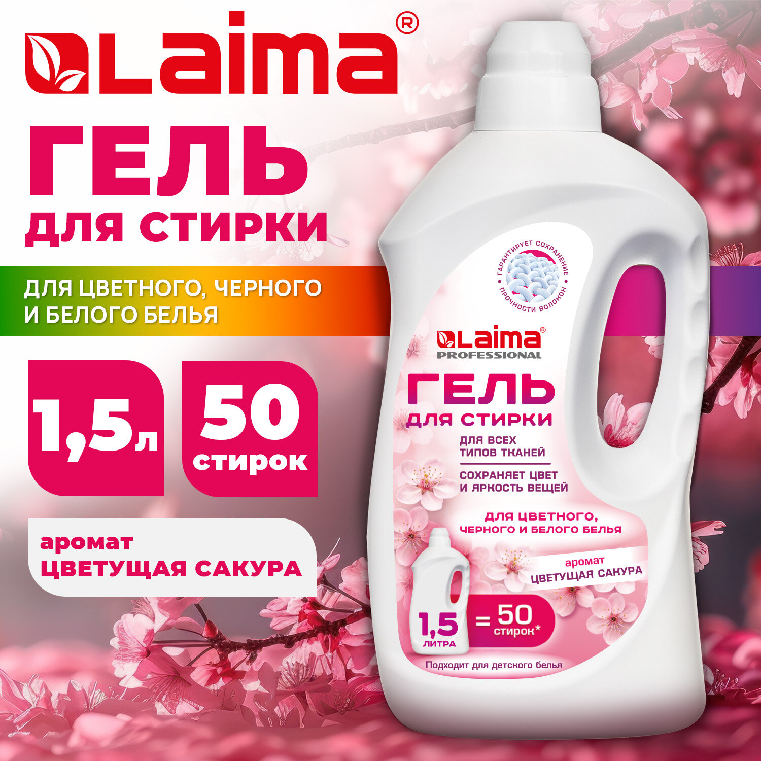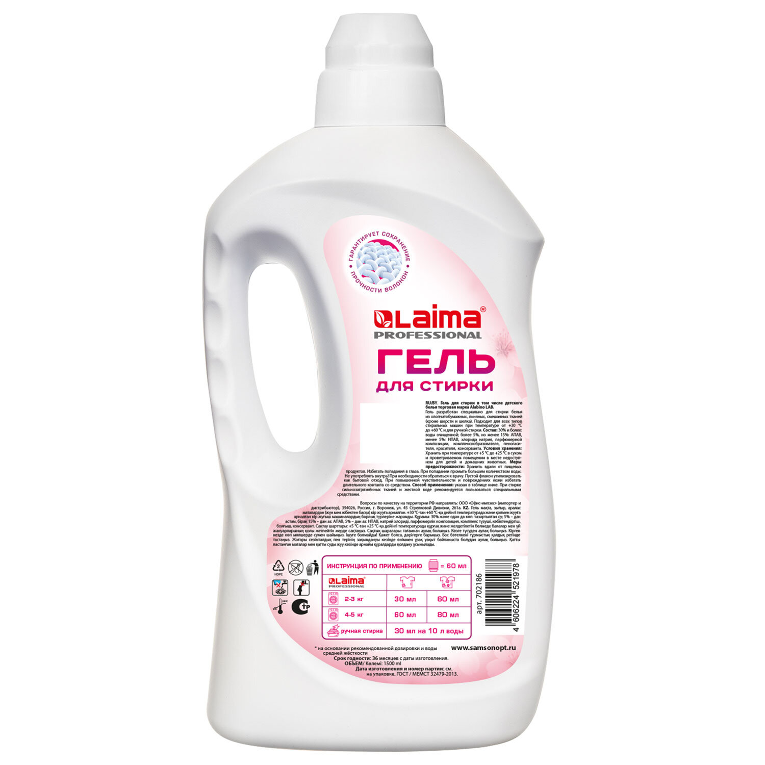 Гель для стирки всех видов тканей универсальный 1,5л LAIMA PROFESSIONAL "Цветущая сакура" Код товара: 702186 325,45 ₽ Купить Производитель:LAIMA Гель LAIMA PROFESSIONAL разработан специально для стирки белья из хлопчатобумажных, льняных, смешанных тканей (кроме шерсти и шелка). Эффективно очищает, но при этом полностью вымывается в процессе полоскания, не остаётся на вещах. При постоянном использовании средства вещи надолго сохраняют первоначальную яркость и насыщенность цвета. Подходит для всех типов стиральных машин при температуре от +30С до +60С и для ручной стирки. Состав: 30% и более: воды очищенной; более 5%, но менее 15%: АПАВ, менее 5%: НПАВ, хлорида натрия, парфюмерной композиции, комплексообразователя, пеногасителя, красителя, консерванта. Способ применения: При ручной стирке развести 60 мл средства для стирки в 10 л воды. Замочить на 30 мин, затем постирать и прополоскать в проточной воде. При машинной стирке загрузить 60 мл средства для стирки на 4-5 кг сухого белья в соответствии с инструкцией к стиральной машинке. Хранить при температуре от +5 С до +25 С в сухом и проветриваемом помещении в месте недоступном для детей и домашних животных. Объём: 1,5 л. Соответствует требованиям ГОСТ 2479-2013.Производство: РоссияТип: автоматОбъем/Вес: 1500 мл/гВид средства: гельНазначение: для всех видов тканей, кроме шерсти и шелкаОтдушка: цветущая сакураКоличество бункеров: 0 шт.Серия: LAUNDRYLIQUIDВид упаковки: бутыльСрок годности: 36 месРазмер упаковки: 28 × 12.5 × 8 смОбъём: 0.0031 м3Промежуточная упаковка: 9 штТранспортная упаковка: 9 штШтрих-код: 4606224521978 Файлы Сертификат-1.jpg Сертификат-2.jpg