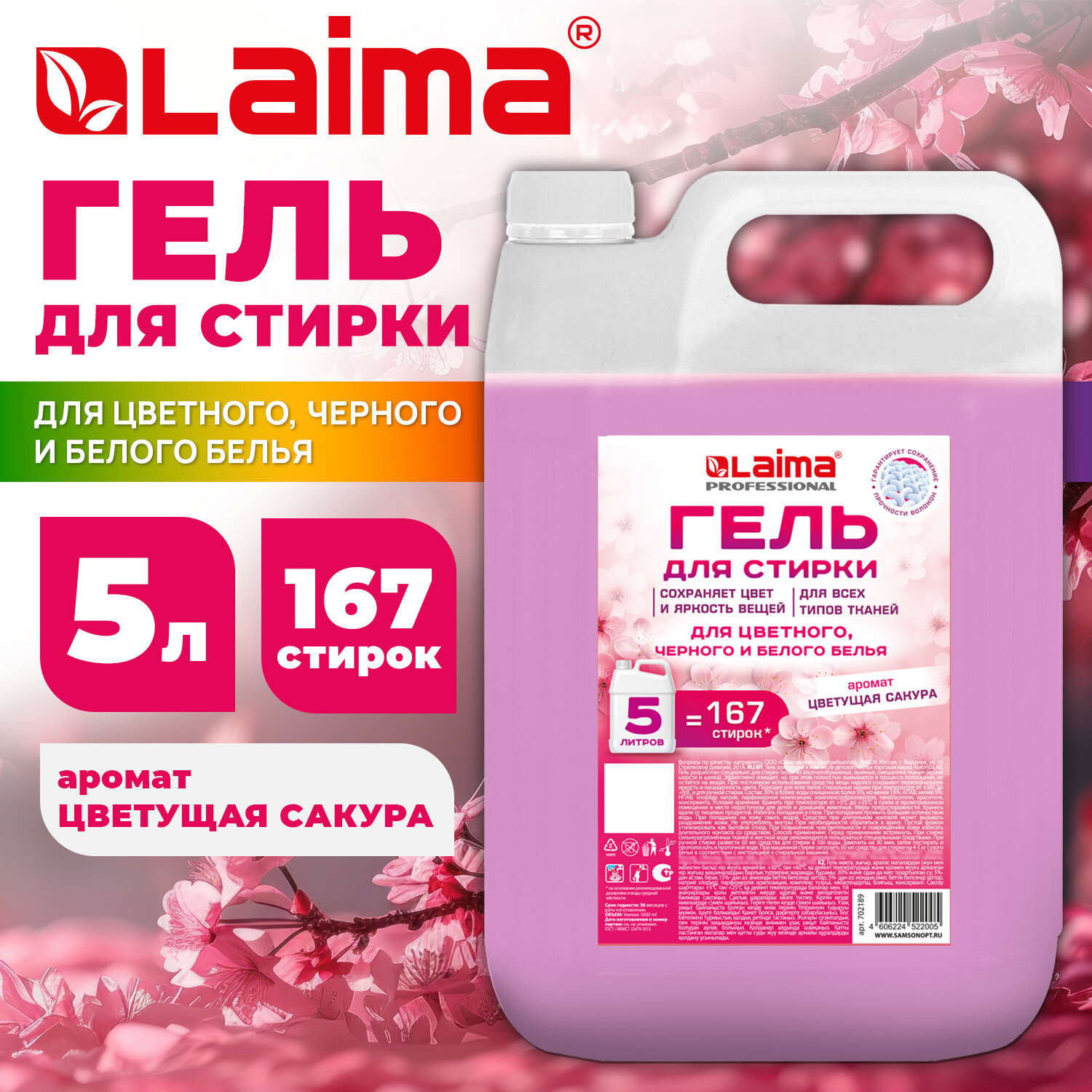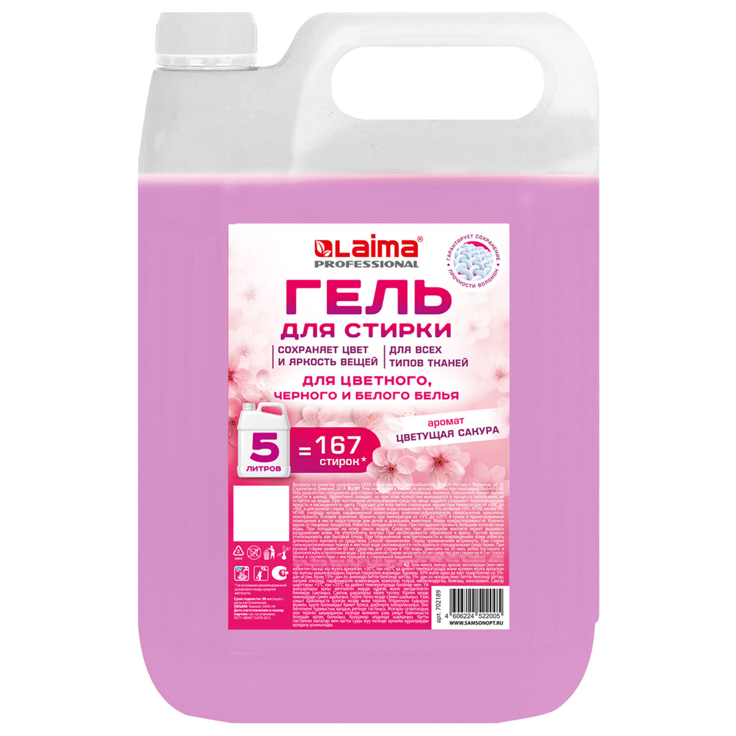 Гель для стирки всех видов тканей универсальный 5л LAIMA PROFESSIONAL "Цветущая сакура" Код товара: 702189 654,74 ₽ Купить Производитель:LAIMA Гель LAIMA PROFESSIONAL разработан специально для стирки белья из хлопчатобумажных, льняных, смешанных тканей (кроме шерсти и шелка). Эффективно очищает, но при этом полностью вымывается в процессе полоскания, не остаётся на вещах. При постоянном использовании средства вещи надолго сохраняют первоначальную яркость и насыщенность цвета. Подходит для всех типов стиральных машин при температуре от +30С до +60С и для ручной стирки. Состав: 30% и более: воды очищенной; более 5%, но менее 15%: АПАВ, менее 5%: НПАВ, хлорида натрия, парфюмерной композиции, комплексообразователя, пеногасителя, красителя, консерванта. Способ применения: При ручной стирке развести 60 мл средства для стирки в 10 л воды. Замочить на 30 мин, затем постирать и прополоскать в проточной воде. При машинной стирке загрузить 60 мл средства для стирки на 4-5 кг сухого белья в соответствии с инструкцией к стиральной машинке. Хранить при температуре от +5 С до +25 С в сухом и проветриваемом помещении в месте недоступном для детей и домашних животных. Объём: 5 л. Соответствует требованиям ГОСТ 2479-2013.Производство: РоссияТип: автоматОбъем/Вес: 5000 мл/гВид средства: гельНазначение: для всех видов тканей, кроме шерсти и шелкаОтдушка: цветущая сакураКоличество бункеров: 0 шт.Серия: LAUNDRYLIQUIDВид упаковки: бутыльСрок годности: 36 месРазмер упаковки: 28.5 × 18.5 × 12.5 смОбъём: 0.0072 м3Промежуточная упаковка: 4 штТранспортная упаковка: 4 штШтрих-код: 4606224522005 Файлы Сертификат-1.jpg Сертификат-2.jpg