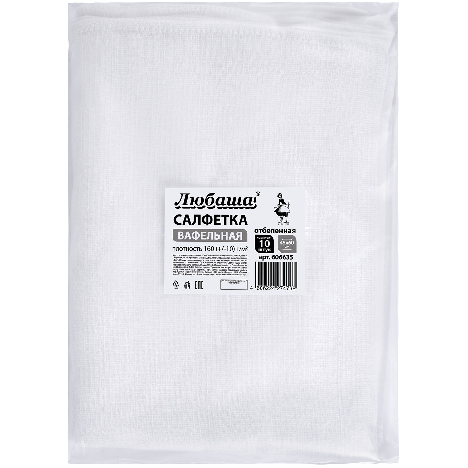 Салфетки ВАФЕЛЬНЫЕ отбеленные, 45х60 см, плотность 160(±10) г/м2, КОМПЛЕКТ 10 шт., ЛЮБАША Код товара: 606635 861 ₽ Купить Производитель:ЛЮБАША Вафельная салфетка ЛЮБАША незаменима в быту. Применяется для уборки, для ухода за автомобилем, в качестве кухонных принадлежностей, элементов декора. Изготовлена из натурального и экологически чистого отбеленного хлопка плотностью 160 (±10) г/м2. Повышенная плотность обеспечивает дополнительную износостойкость и продлевает срок службы изделия. Материал является гипоаллергенным, прекрасно переносит многочисленные стирки, контакт с бытовой химией, а также воздействие высоких температур при кипячении и обладает прекрасной впитывающей способностью. Размер – 45х60 см. 10 штук в комплекте.Производство: РоссияКоличество в упаковке: 10 шт.Материал: вафельная тканьПлотность: 160 г/м2Высота: 60 смШирина: 45 смЦвет: белыйДизайн: однотонныйУпаковка: плотный полиэтиленВес: 451 грРазмер упаковки: 3.8 × 31.1 × 23.5 смОбъём: 0.0026 м3Промежуточная упаковка: 15 штТранспортная упаковка: 15 штШтрих-код: 4606224274768 Файлы Сертификат-1.jpg Сертификат-2.jpg Сертификат-3.jpg Сертификат-4.jpg Сертификат-5.jpg Сертификат-6.jpg Сертификат-7.jpg Сертификат-8.jpg Сертификат-9.jpg Сертификат-10.jpg Сертификат-11.jpg Сертификат-12.jpg Сертификат-13.jpg Сертификат-14.jpg Сертификат-15.jpg Сертификат-16.jpg Сертификат-17.jpg Сертификат-18.jpg Сертификат-19.jpg Сертификат-20.jpg Сертификат-21.jpg Сертификат-22.jpg Сертификат-23.jpg Сертификат-24.jpg Сертификат-25.jpg Сертификат-26.jpg