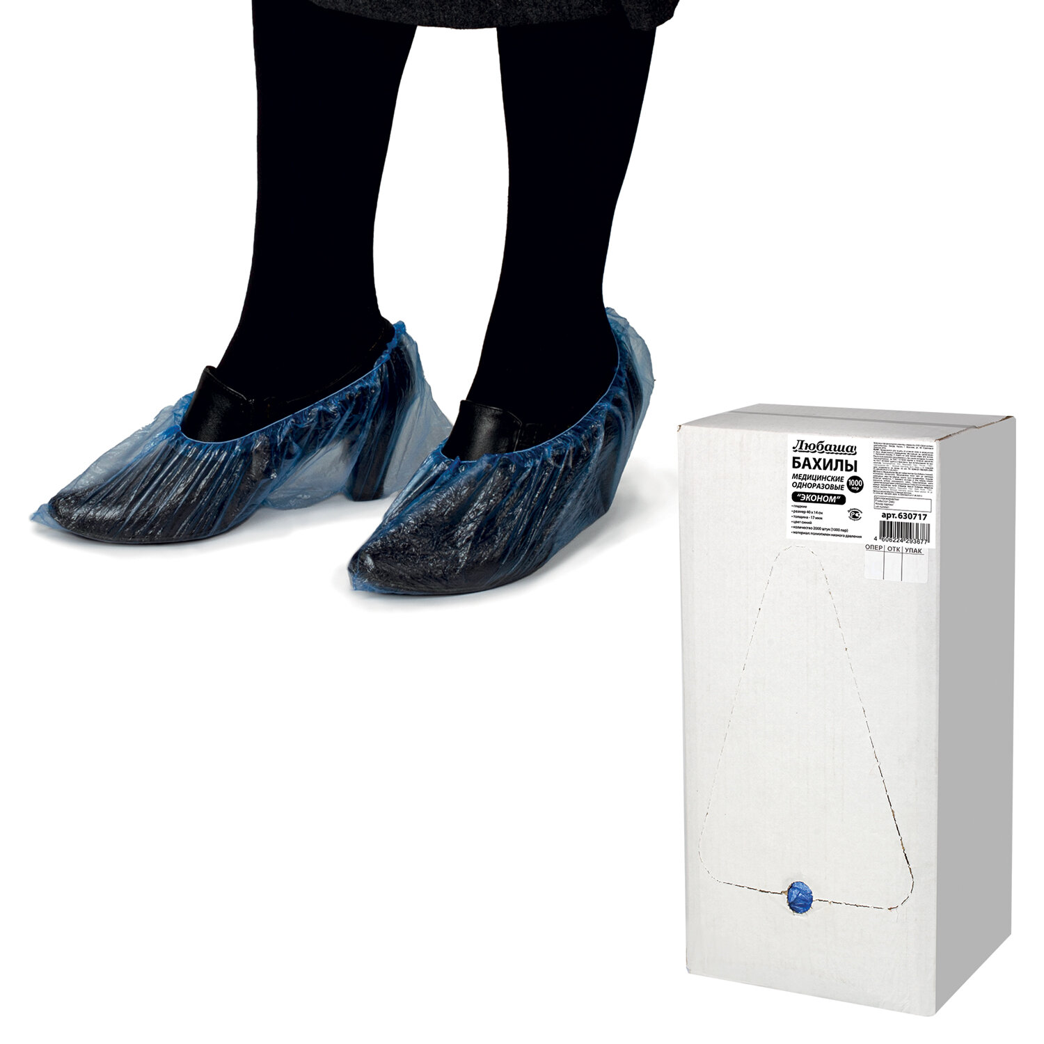 Бахилы КОМПЛЕКТ 2000 шт. (1000 пар) в упаковке, ЭКОНОМ, размер 40х14 см, 1,8 г, ПНД, ЛЮБАША Код товара: 630717 1 365,26 ₽ Купить Производитель:ЛЮБАША Бахилы ЛЮБАША – стандартный атрибут любого медицинского и фармацевтического учреждения, косметологических кабинетов, пищевых предприятий, особо чистых производств, лабораторий и других помещений. Одноразовые бахилы синего цвета обладают хорошими показателями плотности (17 мкм) и весом 1,8 г, а также надежностью. Бахилы из гладкой полиэтиленовой пленки низкого давления – прекрасное средство защиты полов и помещений от уличной грязи и пыли, так как они плотно сидят на обуви. Обладают универсальным размером 40х14 см. Поставляются в комплекте по 2000 штук (1000 пар). Толщина одной стенки бахил – 8,5 мкм. Допустимое отклонение технических характеристик: ±10%.Производство: РоссияКоличество в комплекте: 1000 парКоличество в комплекте: 2000 шт.Серия: ЭкономТолщина: 17 мкмДлина: 40 смВысота: 14 смПоверхность: гладкаяЦвет: синийМатериал: ПНД (полиэтилен низкого давления)Тип сырья: первичноеВес пары: 1.8 гВес: 1,91 кгРазмер упаковки: 16.5 × 42.4 × 20.2 смОбъём: 0.0153 м3Промежуточная упаковка: 6 штТранспортная упаковка: 6 штШтрих-код: 4606224293677 Файлы Приложение-1.pdf Приложение-2.pdf Приложение-3.pdf Сертификат-1.jpg Сертификат-2.jpg
