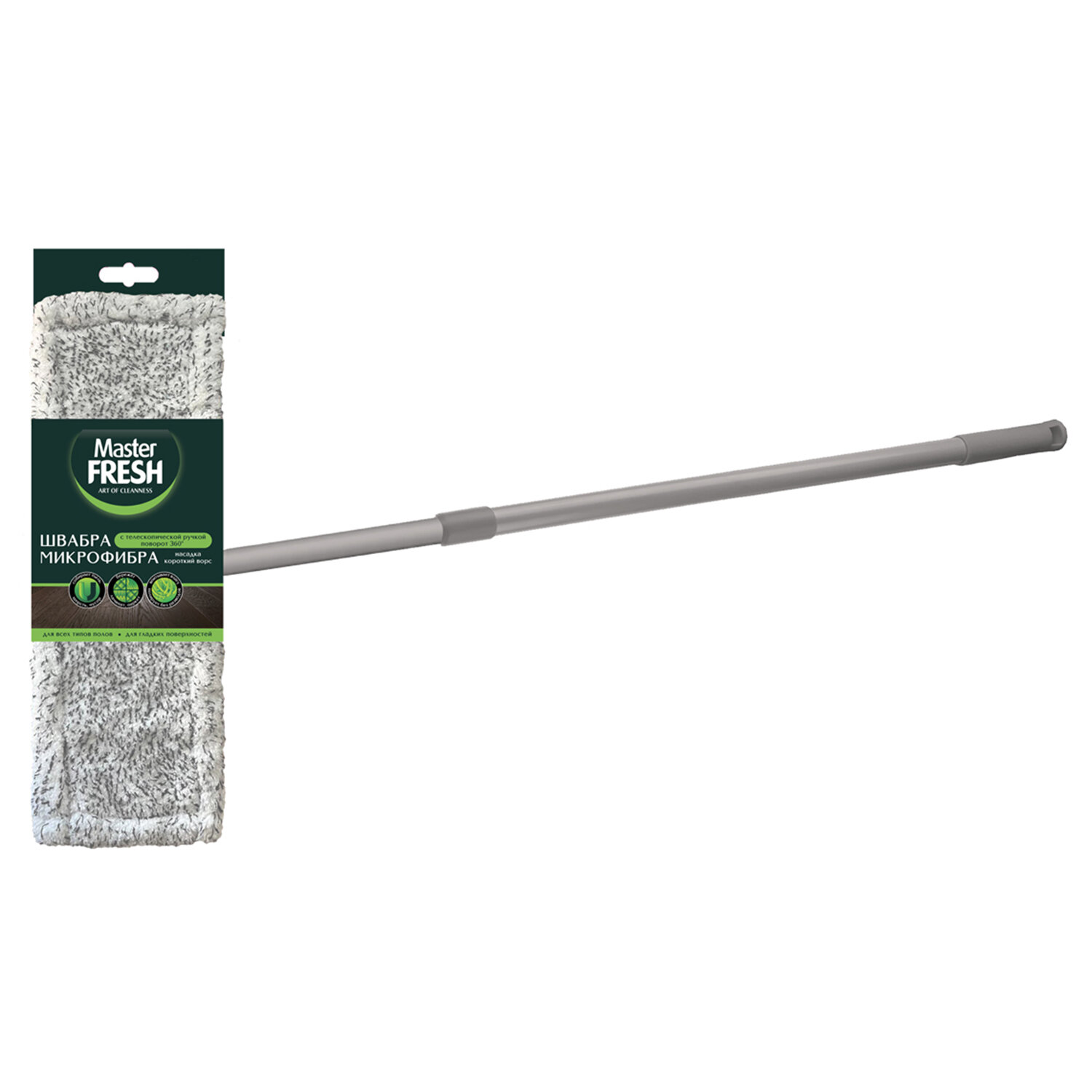 Швабра с флаундером 43 см с насадкой МОП микрофибра, черенок 71-112 см, Master FRESH, ШК4241 Код товара: 703026 782,31 ₽ Купить Производитель:Master FRESH Швабра Master FRESH с флаундером с насадкой МОП из микрофибры - это современный, доступный товар для уборки дома. Удобная регулируемая по длине ручка-телескоп от 71 до 112 см. Насадка из микрофибры с коротким ворсом идеально подходит для ламината, паркета, дерева – деликатных покрытий, с высокой гигроскопичностью, подверженных усыханию. Короткий ворс впитывает и распределяет по поверхности умеренное количество влаги. Это обеспечивает длительный срок службы и сохранение первоначального вида деревянных покрытий. Великолепно задерживает мелкий мусор и пыль, полирует, не оставляя разводов. Платформа имеет плоскую форму, поворачивается на 360 градусов, что позволяет проникать в труднодоступные места. Лёгкая, но крепкая ручка регулируется по длине, подходит для людей разного роста. Размеры платформы швабры и насадок стандартные и взаимозаменяемые.Производство: РоссияТип швабры: плоская (флаундер)Вид швабры: стандартМаксимальная длина черенка: 112 смМинимальная длина черенка: 71 смТелескопическая ручка: даМатериал насадки: микрофибраМатериал черенка: пластикВес: 352 грРазмер упаковки: 5.5 × 14 × 97 смОбъём: 0.0026 м3Промежуточная упаковка: 6 штТранспортная упаковка: 6 штШтрих-код: 4620739974241 Файлы