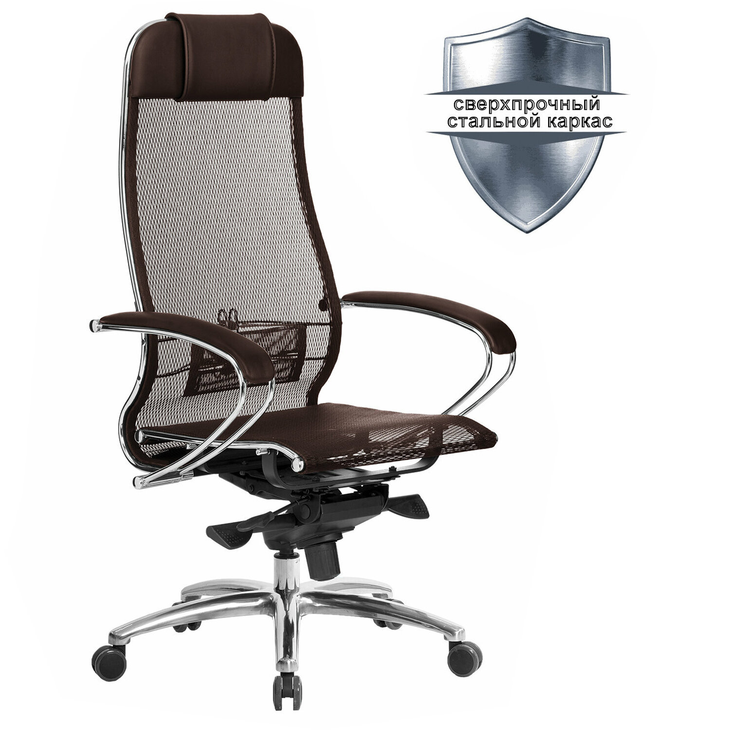 Сверхпрочный стальной каркас обеспечивает надежность кресла, а покрытие зеркальным хромом придает привлекательный вид.
