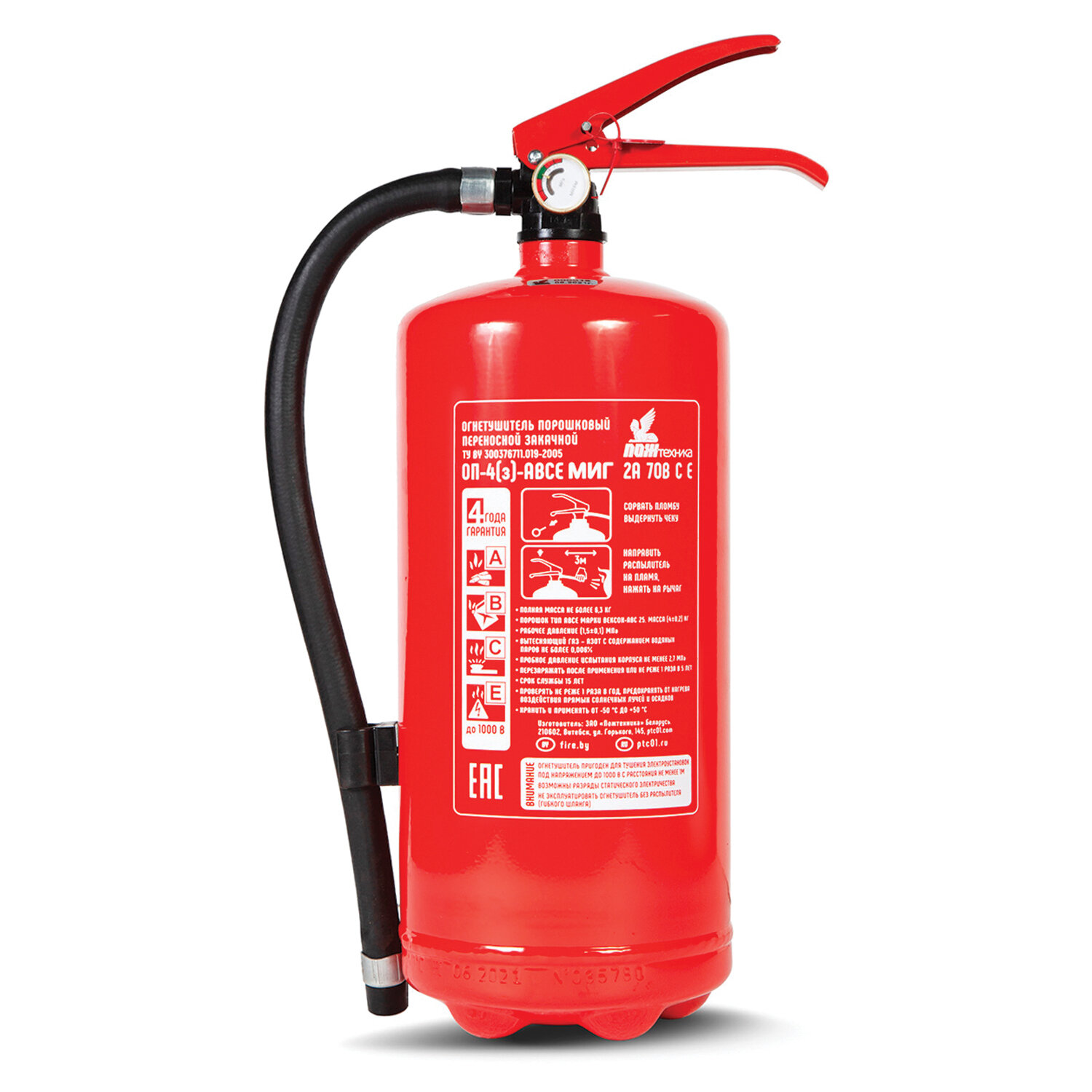 Масса заряда огнетушащего вещества - 4 кг. Ранг по модельным очагам: 2А, 55В, С, Е (до 1000В).