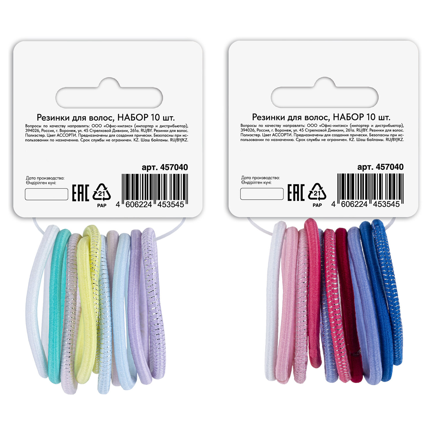 Резинки для волос НАБОР 10 шт., 0,4х14 см, разные цвета, с блестками АССОРТИ, MONTE VITA (МОНТЕ ВИТА), 457040 Код товара: 457040 87,3 ₽ Купить Производитель:MONTE VITA Резинки для волос MONTE VITA – идеальное решение для создания причёски. Они помогают поддерживать аккуратный вид волос и придают причёске завершённость. Резинки обеспечивают надёжную фиксацию, легко снимаются, не цепляют и не повреждают волосы. 10 резинок в ярких и пастельных оттенках – палитра для смелых экспериментов. Универсальный размер (0,4х14 см) подходит как для тонких, так и для густых волос, а износостойкий полиэстер гарантирует долговечность при ежедневном использовании.Производство: КитайТип товара: резинка для волосТип резинки: тонкиеЦвет: ассортиДекор: нетНабор: даКоличество в наборе: 10 шт.Размер: 0,4х14 смМатериал: полиэстерСерия: -Упаковка: картонная карточка с европодвесомВес: 18 грРазмер упаковки: 2.2 × 5.7 × 10.7 смОбъём: 0.0001 м3Промежуточная упаковка: 12 штТранспортная упаковка: 240 штШтрих-код: 4606224453545 Файлы Сертификат-1.jpg Сертификат-2.jpg Сертификат-3.jpg Сертификат-4.jpg