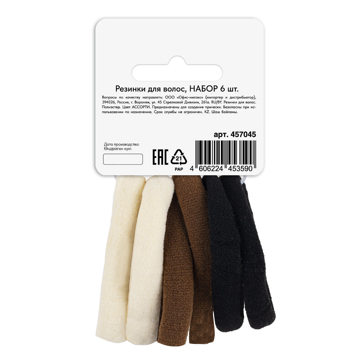 Резинки для волос НАБОР 6 шт., мягкие, большие, чёрный, коричневый, бежевый, MONTE VITA (МОНТЕ ВИТА), 457045 Код товара: 457045 91,06 ₽ Купить Производитель:MONTE VITA Резинки для волос MONTE VITA – идеальное решение для создания прически. Резинки помогают поддерживать волосы в аккуратном состоянии, придают прическе законченный вид. 6 широких резинок (4,5 см) из мягкого нейлона – выбор обладательниц густых волос. Большой размер надежно фиксирует объемные пучки и хвосты, а плотная текстура предотвращает спутывание. Резинки обеспечивают надежную фиксацию, удобно снимаются, не цепляют и не рвут волосыПроизводство: КитайТип товара: резинка для волосТип резинки: мягкиеЦвет: ассортиДекор: нетНабор: даКоличество в наборе: 6 шт.Размер: 4,5 смМатериал: нейлонСерия: -Упаковка: картонная карточка с европодвесомВес: 15 грРазмер упаковки: 3.3 × 11.4 × 6.8 смОбъём: 0.0001 м3Промежуточная упаковка: 12 штТранспортная упаковка: 240 штШтрих-код: 4606224453590 Файлы Сертификат-1.jpg Сертификат-2.jpg Сертификат-3.jpg Сертификат-4.jpg
