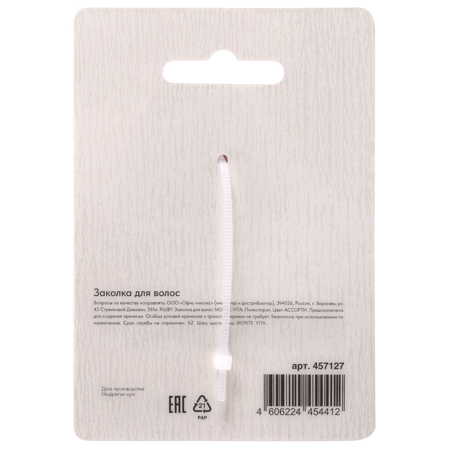 Заколка для волос, для хвоста и пучка, диаметр 6 см, soft-touch, АССОРТИ, MONTE VITA (МОНТЕ ВИТА), 457127 Код товара: 457127 143,24 ₽ Купить Производитель:MONTE VITA Заколка MONTE VITA – это украшение для волос. Она обеспечивает надежную фиксацию локонов. Это стильный аксессуар, который поможет создать причёску для неповторимого образа. Заколка с мягким покрытием для мгновенного создания пучка. Диаметр 6 см подходит для средних и длинных волос, а гибкая основа сможет захватить пучок любого объема.Производство: КитайТип товара: заколка для волосЦвет: ассортиТип покрытия: soft-touchТип заколки: зажимДекор: нетКоличество в наборе: 1 шт.Размер: 6 смМатериал: полистиролСерия: -Упаковка: картонная карточка с европодвесомВес: 30 грРазмер упаковки: 4.9 × 11.2 × 7.8 смОбъём: 0.0003 м3Промежуточная упаковка: 12 штТранспортная упаковка: 240 штШтрих-код: 4606224454412 Файлы Сертификат-1.jpg Сертификат-2.jpg Сертификат-3.jpg Сертификат-4.jpg