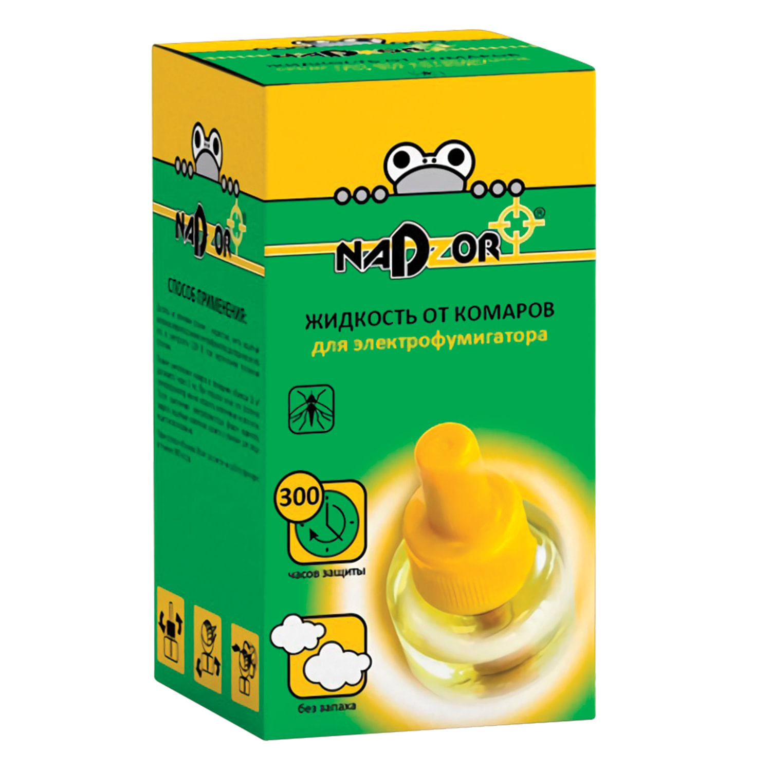 Средство от насекомых жидкость для фумигатора NADZOR (Надзор), 30 ночей Код товара: 604917 105,99 ₽ Купить Производитель:NADZOR Инсектицидное средство предназначено для уничтожения комаров в помещениях. Эффективно действует уже через 10-15 минут. Для использования необходим фумигатор. Способ применения: достать из упаковки флакон с раствором, снять защитный колпачок, ввернуть флакон в электрофумигатор до упора и включить его в электросеть на 220В при вертикальном положении флакона. Полное уничтожение комаров достигается примерно за 1 час. При открытых окнах или форточках электрофумигатор можно оставлять включенным на всю ночь. После выключения электрофумигатора, флакон вывинтить из электрофумигатора, закрыть защитным колпачком и сохранять до последующего использования. Один флакон объемом 30 мл рассчитан на работу в течение примерно 360 часов.Преимущества: - универсальность – подходят для любых моделей фумигаторов; - безопасны для человека и домашних животных; - экономичный расход – флакона хватит на месяц использования.Производство: РоссияСредство от насекомых: комарыТип средства: жидкостьБез запаха: даОбъем: 30 млВид средства: инсектицидноеКомплектация: жидкостьУпаковка: картонная коробкаСрок годности: 60 месВес: 52 грРазмер упаковки: 5 × 8.7 × 5 смОбъём: 0.0003 м3Промежуточная упаковка: 24 штТранспортная упаковка: 24 штШтрих-код: 4680059986423 Сертификат-1.jpg