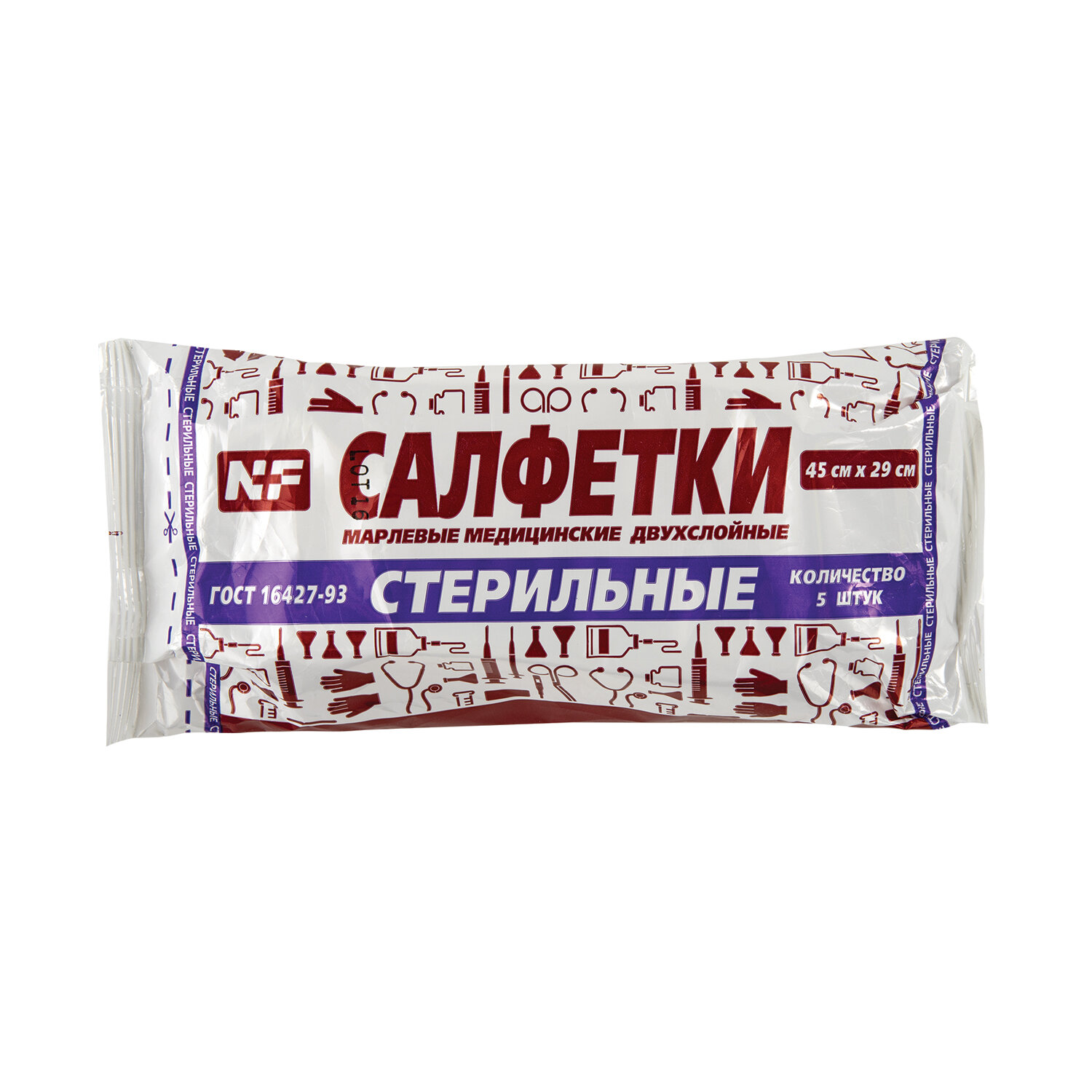 Салфетка марлевая стерильная NF КОМПЛЕКТ 5 шт., 2 слоя, 45х29 см, плотность 28 (±2) г/м2 Код товара: 630600 61,34 ₽ Купить Производитель:NF Стерильные марлевые салфетки изготовлены из отбеленной хлопчатобумажной медицинской марли плотностью 28 г/м2 путем сложения в 2 слоя. Салфетки сложены индивидуально и упакованы по 5 штук. Применяются для использования в качестве готовых операционно-перевязочных средств, для наложения повязок, осушения ран, при перевязках и операциях, для тампонады с целью остановки кровотечения и дренирования, закрепления перевязочного материала, давления на какую-нибудь часть тела (в основном, для остановки кровотечения), предупреждения отека тканей, а также для защиты раны или измененной поверхности кожи от воздействия внешней среды.Салфетки на ране фиксируются бинтом или медицинским пластырем. Для обеспечения полной безопасности края салфеток сложены внутрь.Производство: РоссияТип: салфетка марлеваяРазмер: 45х29 смКоличество слоев: 2Плотность: 28 г/м2Количество в комплекте: 5 шт.Срок годности: 60 месВес: 39 грРазмер упаковки: 5.1 × 13.2 × 6.1 смОбъём: 0.0005 м3Промежуточная упаковка: 140 штТранспортная упаковка: 140 штШтрих-код: 4612741480513 Файлы Приложение-1.pdf Сертификат-1.jpg Сертификат-2.jpg Сертификат-3.jpg Сертификат-4.jpg