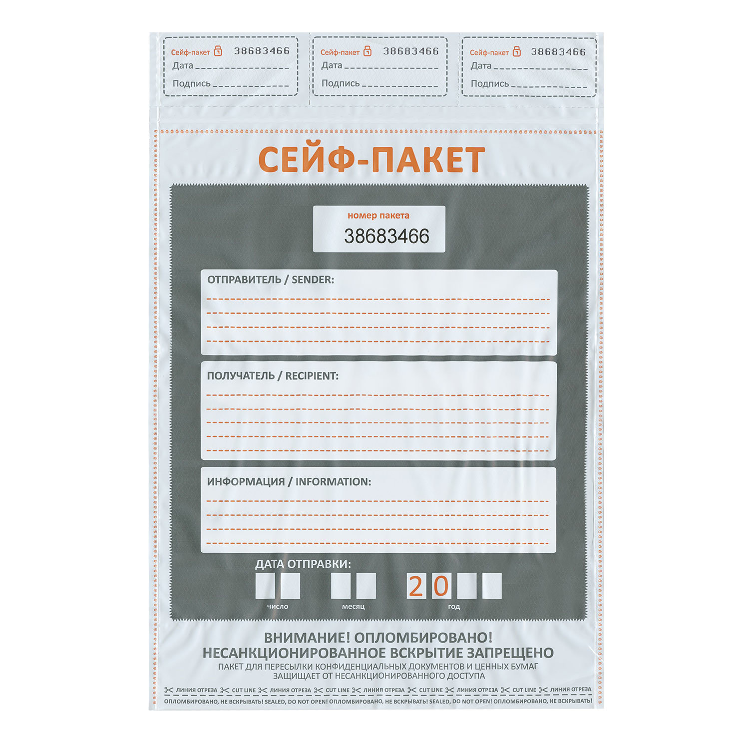 Сейф-пакеты полиэтиленовые (243х320+40 мм), до 100 листов формата А4, КОМПЛЕКТ 100 шт., индивидуальный номер Код товара: 127065 2 291,42 ₽ Купить Производитель:NO NAME Сейф-пакеты изготовлены из непрозрачного, влагонепроницаемого материала, исключающего возможность просмотра вложений и воздействия окружающей среды. Предназначен для пересылки и транспортировки ценных бумаг, договоров, денег и драгоценных металлов. Производство: РоссияРазмер: 243х320 ммВысота отрывной квитанции: 40 ммТолщина: 60 мкмОсобенности: индивидуальный номер, карман для сопроводительных документов, красная сейф-лента с термоиндикацией, подсказ «Куда-Кому», штрихкодКоличество в комплекте: 100 шт.Серия: SECURITYМатериал: полиэтилен (непрозрачная пленка)Способ заклеивания: самоклеящаяся сейф-лентаКоличество отрывных квитанций: 3 шт.Упаковка: полиэтиленВес: 1,17 кгРазмер упаковки: 4.4 × 36.1 × 25.8 смОбъём: 0.0041 м3Промежуточная упаковка: 5 штТранспортная упаковка: 5 штШтрих-код: 4607144471589 Файлы Приложение-1.pdf Сертификат-1.jpg Сертификат-2.jpg Сертификат-3.jpg Сертификат-4.jpg Сертификат-5.jpg Сертификат-6.jpg Сертификат-7.jpg Сертификат-8.jpg Сертификат-9.jpg Сертификат-10.jpg Сертификат-11.jpg Сертификат-12.jpg Сертификат-13.jpg Сертификат-14.jpg Сертификат-15.jpg Сертификат-16.jpg Сертификат-17.jpg Сертификат-18.jpg Сертификат-19.jpg Сертификат-20.jpg Сертификат-21.jpg Сертификат-22.jpg Сертификат-23.jpg Сертификат-24.jpg Сертификат-25.jpg Сертификат-26.jpg