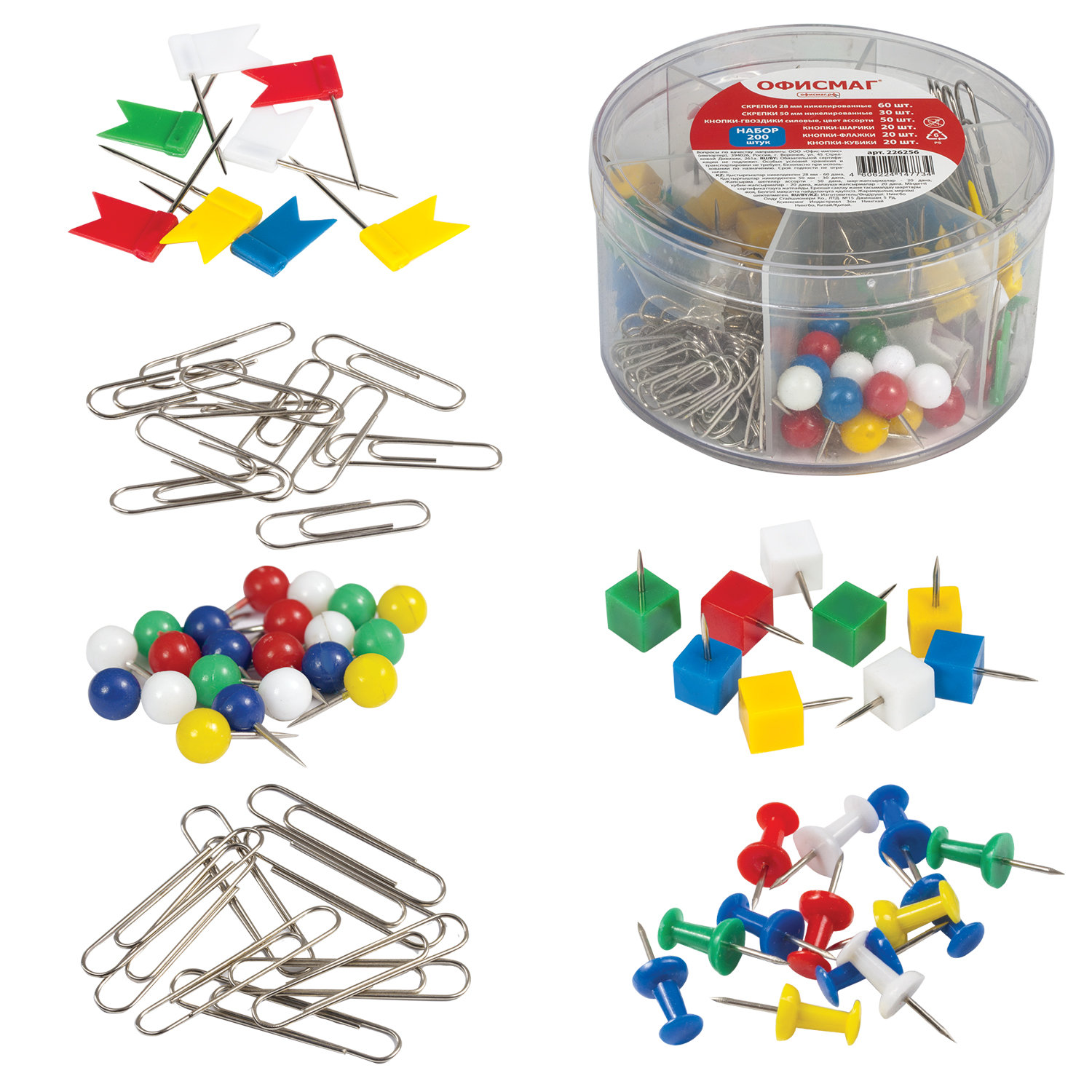 Набор ОФИСМАГ, скрепки 28 мм/60 шт., 50 мм/30 шт, гвоздики 50 шт., шарики, кубики, флажки по 20 шт., цилиндр Код товара: 226256 272,18 ₽ Купить Производитель:ОФИСМАГ Набор канцелярских мелочей ОФИСМАГ объединяет в себе кнопки-гвоздики, кнопки-кубики, кнопки-флажки, кнопки-шарики, скрепки 28 мм, скрепки 50 мм. Упаковка одновременно является и органайзером для хранения канцелярских мелочей на столе. В наборе: - кнопки-гвоздики, цветные (ассорти) - 50 шт.; - кнопки-кубики, цветные (ассорти) - 20 шт.; - кнопки-флажки, цветные (ассорти) - 20 шт.; - кнопки-шарики, цветные (ассорти) - 20 шт.; - скрепки 28 мм, никелированные - 60 шт.; - скрепки 50 мм, цветные (ассорти) - 30 шт. Общее количество предметов - 200 шт. Поставляются в пластиковом цилиндре с отделениями для каждого вида товара.Производство: КитайКоличество предметов в наборе: 200 шт.Комплектация: кнопки-гвоздики, кнопки-кубики, кнопки-флажки, кнопки-шарики, скрепки 28 мм, скрепки 50 ммСерия: KitЗажимы для бумаг 19 мм: 0 шт.Зажимы для бумаг 25 мм: 0 шт.Кнопки: 0 шт.Кнопки-гвоздики: 50 шт.Кнопки-кубики: 20 шт.Кнопки-флажки: 20 шт.Кнопки-шарики: 20 шт.Резинки для денег: 0 шт.Скрепки 28 мм: 60 шт.Скрепки 50 мм: 30 шт.Цвет: ассортиТип упаковки: пластиковый цилиндр с отделениямиВес: 187 грРазмер упаковки: 5.3 × 10.1 × 10.1 смОбъём: 0.0008 м3Промежуточная упаковка: 12 штТранспортная упаковка: 48 штШтрих-код: 4606224147734 Файлы Сертификат-1.jpg Сертификат-2.jpg Сертификат-3.jpg Сертификат-4.jpg Сертификат-5.jpg Сертификат-6.jpg Сертификат-7.jpg Сертификат-8.jpg Сертификат-9.jpg Сертификат-10.jpg Сертификат-11.jpg Сертификат-12.jpg Сертификат-13.jpg Сертификат-14.jpg Сертификат-15.jpg Сертификат-16.jpg Сертификат-17.jpg Сертификат-18.jpg Сертификат-19.jpg Сертификат-20.jpg Сертификат-21.jpg Сертификат-22.jpg Сертификат-23.jpg Сертификат-24.jpg Сертификат-25.jpg Сертификат-26.jpg