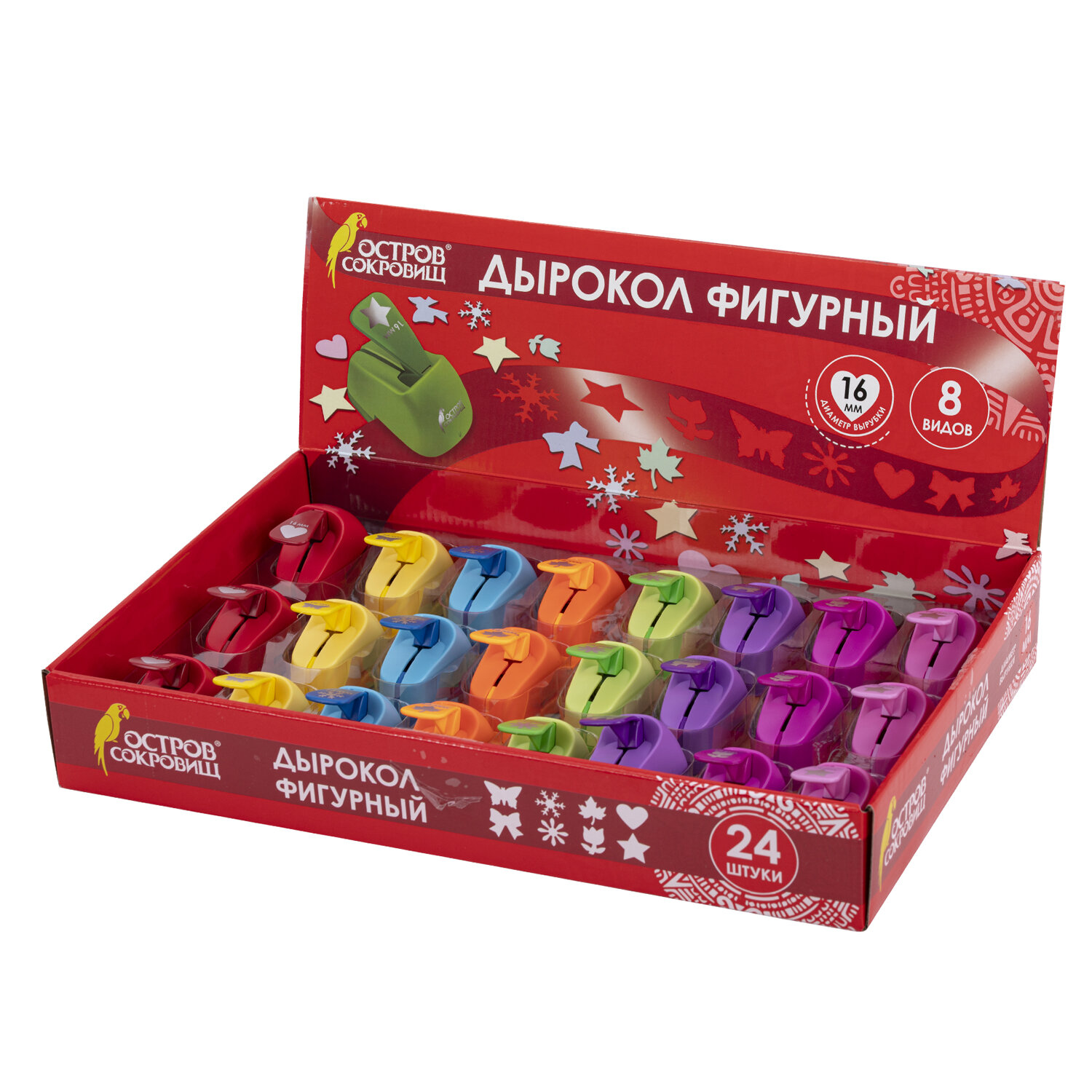 Дырокол фигурный 1 шт., диаметр вырубки 16 мм, 8 видов ассорти, ОСТРОВ СОКРОВИЩ Код товара: 665225 198,87 ₽ Купить Производитель:ОСТРОВ СОКРОВИЩ Незаменимые и очень простые инструменты для детского и взрослого творчества. Используются для создания аппликаций, оформления открыток, альбомов, пригласительных, а также для изготовления конфетти. Фигурные дыроколы ОСТРОВ СОКРОВИЩ предназначены для декорирования изделий путем создания четкой и красивой перфорации разной формы. Дырокол компактный и удобный в применении, размер - 6х8,5х13,6 см. Диаметр пробиваемого отверстия - 16 мм, формы вырубки: сердце, бантик, звезда, бабочка, ромашка, тюльпан, снежинка, кленовый листок. Один дырокол делает одну форму вырубки. В дисплее 8 видов дыроколов, по 4 дырокола каждого вида. Режущие части, изготовленные из высококачественного металла, защищены пластмассовым корпусом, что делает дырокол ОСТРОВ СОКРОВИЩ безопасным для детей. Дыроколом можно работать по бумаге, картону и пористой резине плотностью от 80 до 200 г/м2.Производство: КитайФорма вырубки: ассорти, 8 видов.Диаметр вырубки: 16 ммЦвет: ассортиВысота: 13.6 смШирина: 6 смГлубина: 8,5 смТип товара: дырокол фигурныйВес: 81 грРазмер упаковки: 4.3 × 6.8 × 5.6 смОбъём: 0.0005 м3Промежуточная упаковка: 24 штТранспортная упаковка: 96 штШтрих-код: 4606224398020 Файлы Сертификат-1.jpg Сертификат-2.jpg Сертификат-3.jpg Сертификат-4.jpg Сертификат-5.jpg Сертификат-6.jpg Сертификат-7.jpg Сертификат-8.jpg Сертификат-9.jpg Сертификат-10.jpg Сертификат-11.jpg Сертификат-12.jpg Сертификат-13.jpg Сертификат-14.jpg Сертификат-15.jpg Сертификат-16.jpg Сертификат-17.jpg Сертификат-18.jpg Сертификат-19.jpg Сертификат-20.jpg Сертификат-21.jpg Сертификат-22.jpg Сертификат-23.jpg Сертификат-24.jpg Сертификат-25.jpg Сертификат-26.jpg