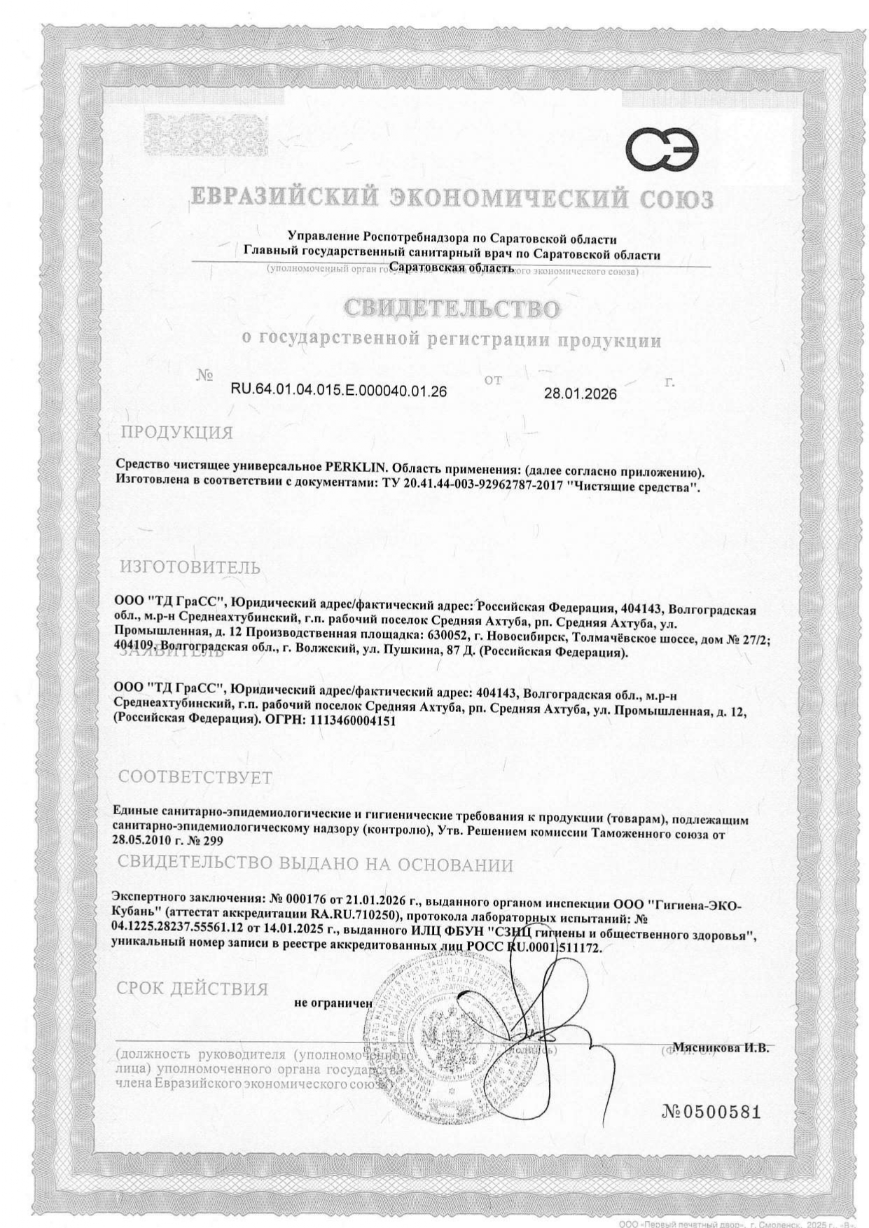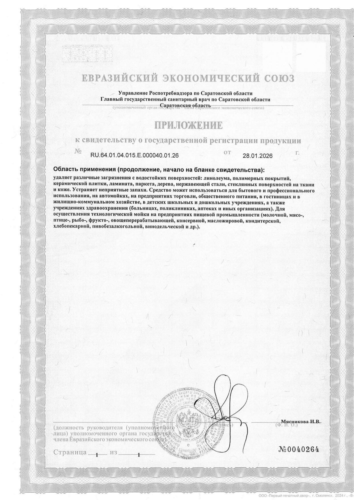 Универсальный пенный ОЧИСТИТЕЛЬ для любых поверхностей 600мл PERKLIN АНТИПЯТНА Код товара: 702407 175,28 ₽ Купить Производитель:PERKLIN Универсальное чистящее средство PERKLIN АНТИПЯТНА обладает широким спектром действия. Эффективно удаляет загрязнения с большинства поверхностей, не повреждая их структуру. Универсальное чистящее средство PERKLIN АНТИПЯТНА - моющее средство широкого спектра действия. Эффективно удаляет загрязнения с водостойких поверхностей: линолеума, полимерных покрытий, керамической плитки, ламината, паркета, дерева, нержавеющей стали, стеклянных поверхностей, а также изделий из ткани, кожи, не повреждая волокон ткани. Эффективное средство для регулярной уборки, подходит и для сильно загрязненных объектов. Не оставляет разводов. Устраняет неприятные запахи. Cпособ применения: 1. Распылите средство на пятно или загрязненную поверхность. 2. Подождите 30–60 секунд. Для сложных пятен на ткани можно потереть щеткой. 3. Протрите влажной микрофиброй или губкой. При очистке ткани — промокните чистой влажной салфеткой, не допуская излишнего намокания. Состав: очищенная вода, анионные ПАВ, неионогенные ПАВ, соль ЭДТА, органический растворитель, d-лимонен.Производство: РоссияФорма выпуска: жидкостьСерия: АНТИПЯТНАОбъем/вес: 600 мл/гЭффект от использования: очищение поверхности, удаление жира и въевшейся грязиПодходит для поверхностей: дерево, кафель, линолеум, пластикОсобенности: универсальноеОтдушка: ЛимонСодержит: кислотуРазрешено для детских учреждений: даОбласть применения: бытовое использование, пищевая промышленность, предприятия общественного питания, производственные компании, санаторно-курортные учреждения, сфера услуг, торговые учреждения, учреждения образования (школьные, дошкольные, средние, высшие)pH: 11Дозатор: распылительУпаковка: флаконСрок годности: 36 месВес: 695 грРазмер упаковки: 4.6 × 29.4 × 9.2 смОбъём: 0.0015 м3Промежуточная упаковка: 8 штТранспортная упаковка: 8 штШтрих-код: 4670113627584 Файлы Сертификат-1.jpg Сертификат-2.jpg Сертификат-3.jpg Сертификат-4.jpg Сертификат-5.jpg Сертификат-6.jpg Сертификат-7.jpg Сертификат-8.jpg Сертификат-9.jpg Сертификат-10.jpg Сертификат-11.jpg Сертификат-12.jpg Сертификат-13.jpg Сертификат-14.jpg Сертификат-15.jpg Сертификат-16.jpg Сертификат-17.jpg Сертификат-18.jpg Сертификат-19.jpg Сертификат-20.jpg Сертификат-21.jpg Сертификат-22.jpg Сертификат-23.jpg Сертификат-24.jpg Сертификат-25.jpg Сертификат-26.jpg Сертификат-27.jpg