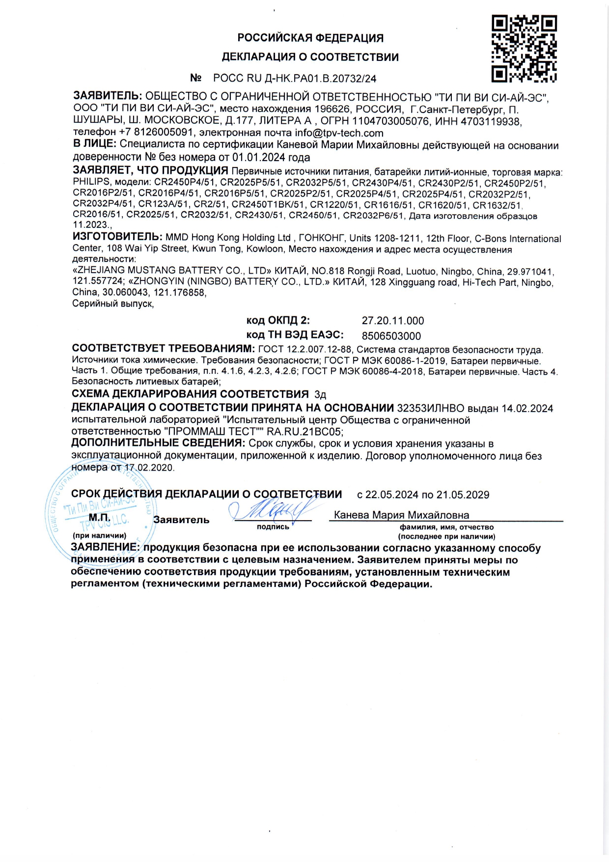 Батарейки литиевые PHILIPS Lithium CR2016, таблетки, дисковые, кнопочные, КОМПЛЕКТ 2 шт., в блистере Код товара: 458296 285,21 ₽ Купить Производитель:PHILIPS Литиевые батарейки для электронных устройств PHILIPS Lithium CR2016. Технология высшего качества для миниатюрных устройств. Долгий срок службы в повседневных портативных электронных устройствах Основные характеристики: • Надежное, долгосрочное использование. • Батарея остается годной для использования в течение 10 лет. • Безопасная упаковка с защитой от детей. • Батарейки Minicells не содержат ртуть. • Конструкция с защитой от протечек. • Широкий диапазон рабочих температур. • Тип элемента питания: батарея-"пуговица" / литиевая. • Напряжение батареи – 3 В. • Химический состав – литиевая. • Щелочные батареи PHILIPS содержат 0% кадмия, ртути и свинца. Вся информация на сайте о товарах носит справочный характер и не является публичной офертой в соответствии с пунктом 2 статьи 437 ГК РФ. Производитель оставляет за собой право изменять характеристики товара, его внешний вид и комплектность без предварительного уведомления продавца.Производство: КитайФорма батарейки: дисковые «монетки»Серия: LithiumТипоразмер: CR2016Технология: литиеваяНапряжение: 3 ВКоличество в упаковке: 2 шт.Упаковка: блистерСрок годности: 120 месВес: 13 грРазмер упаковки: 0.4 × 12 × 8.4 смОбъём: 0.0001 м3Промежуточная упаковка: 20 штТранспортная упаковка: 200 штШтрих-код: 4895229149434 Сертификат-1.jpg Сертификат-2.jpg Сертификат-3.jpg