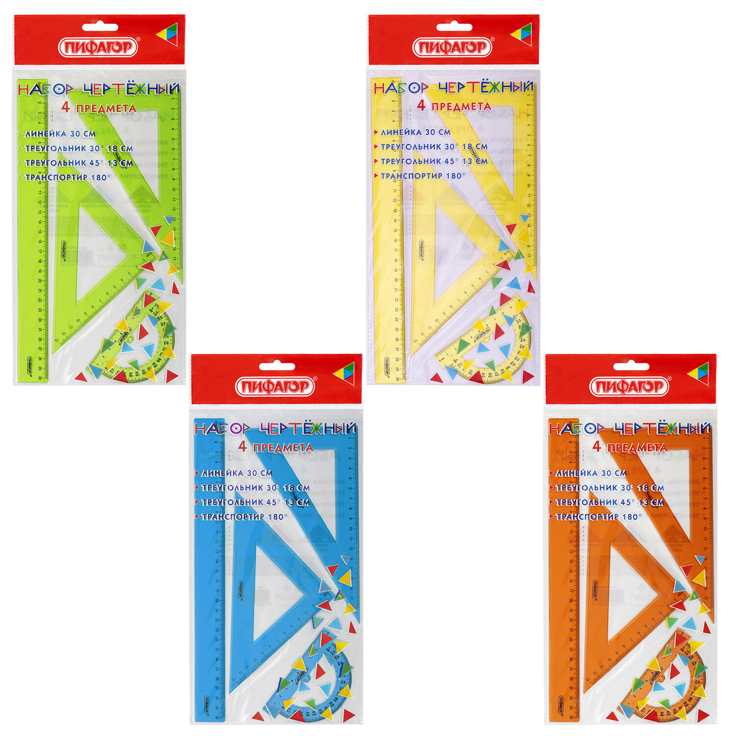 Набор чертежный большой ПИФАГОР (линейка 30 см, 2 треугольника, транспортир), прозрачный, неоновый, ассорти Код товара: 210856 117,45 ₽ Купить Производитель:ПИФАГОР Набор чертежный геометрический ПИФАГОР предназначен для выполнения чертежных работ. В набор входят: - линейка со шкалой 30 см; - угольник с углами 30°/60° и шкалой 18 см; - угольник с углами 45°/45° и шкалой 13 см; - транспортир 180° и шкалой 10 см. Изготовлен из прочного прозрачного пластика. Цвет - ассорти. Поставляется в цветном пакете с европодвесом.Производство: КитайКоличество предметов в наборе: 4 шт.Максимальная длина разметки: 30 смКомплектация: большой треугольник, линейка, малый треугольник, транспортирМатериал: пластикПрозрачный: даЦвет: неоновый ассортиСерия: GeometricalУпаковка: пакет с европодвесомВес: 61 грРазмер упаковки: 0.2 × 31 × 17.5 смОбъём: 0.0002 м3Промежуточная упаковка: 24 штТранспортная упаковка: 288 штШтрих-код: 4606224465913 Сертификат-1.jpg Сертификат-2.jpg Сертификат-3.jpg