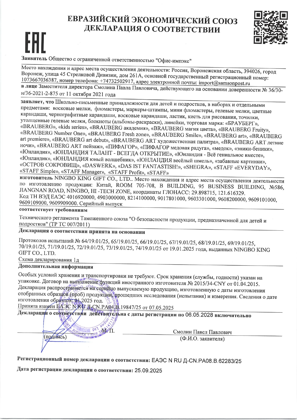 Ластик фигурный ПИФАГОР "Смайлики", 28x28x6 мм, цвет ассорти Код товара: 226610 9,11 ₽ Купить Производитель:ПИФАГОР Фигурный ластик ПИФАГОР "Смайлики" отлично подойдет для удаления надписей, сделанных чернографитным карандашом. Ластик в форме смайлика в дизайне ассорти (без возможности выбора). Размер каждого ластика - 28х28х6 мм.Производство: КитайКоличество в упаковке: 1 шт.Материал: термопластичная резинаФорма: круглаяСтираемые письменные принадлежности: чернографитные карандашиЦвет: ассортиСерия: СмайликиНе оставляет бумажной пыли: даРазмер: 28x28x6 ммУпаковка: пластиковая банкаВес: 6 грРазмер упаковки: 0.6 × 2.6 × 2.6 смПромежуточная упаковка: 150 штТранспортная упаковка: 1800 штШтрих-код: 4606224156064 Сертификат-1.jpg Сертификат-2.jpg Сертификат-3.jpg