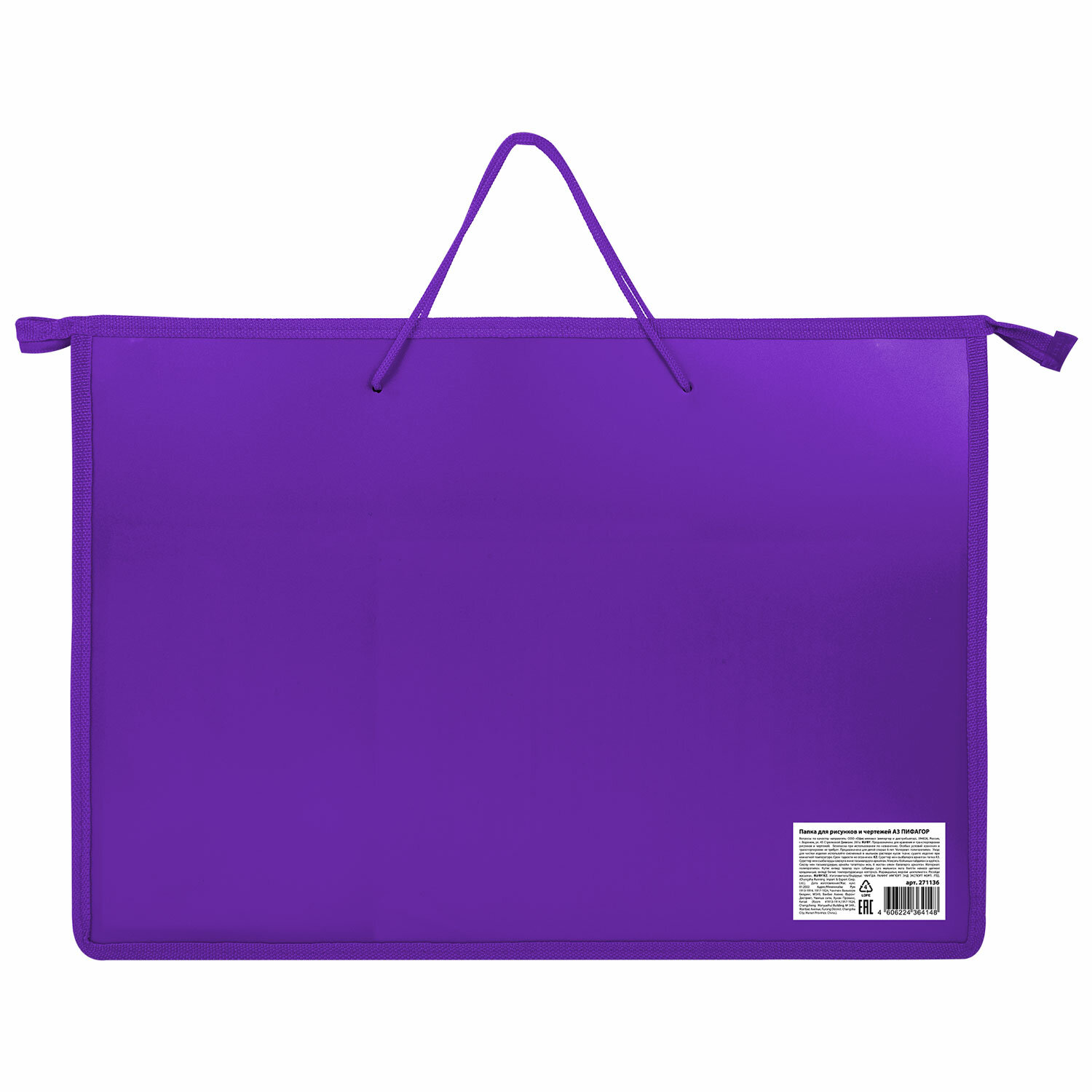 Папка для рисунков и чертежей ПИФАГОР А3, пластик, фиолетовая Код товара: 271136 217,3 ₽ Купить Производитель:ПИФАГОР Папка ПИФАГОР предназначена для хранения чертежей, рисунков и других художественных изображений формата А3. Выполнена из пластика, по краям имеет тканевую окантовку. Одно отделение. Застежка-молния расположена по верхнему краю папки. Практичная папка на молнии с ручками надежно защитит чертежи, рисунки и другие художественные изображения от замятий и повреждений. Для удобства переноски папка снабжена ручками. Внизу и по бокам имеется вставка из прочного полиэстера,которая позволяет увеличить объем папки.Производство: КитайФормат: А3Серия: FORMAT A3Застежка: молнияМатериал: пластикКоличество отделений: 1Наличие ручки: даЦвет: фиолетовыйВысота: 335 ммШирина: 465 ммГлубина: 50 ммУпаковка: пакетВес: 265 грРазмер упаковки: 1.2 × 48.3 × 34 смОбъём: 0.0014 м3Промежуточная упаковка: 30 штТранспортная упаковка: 30 штШтрих-код: 4606224364148 Сертификат-1.jpg Сертификат-2.jpg