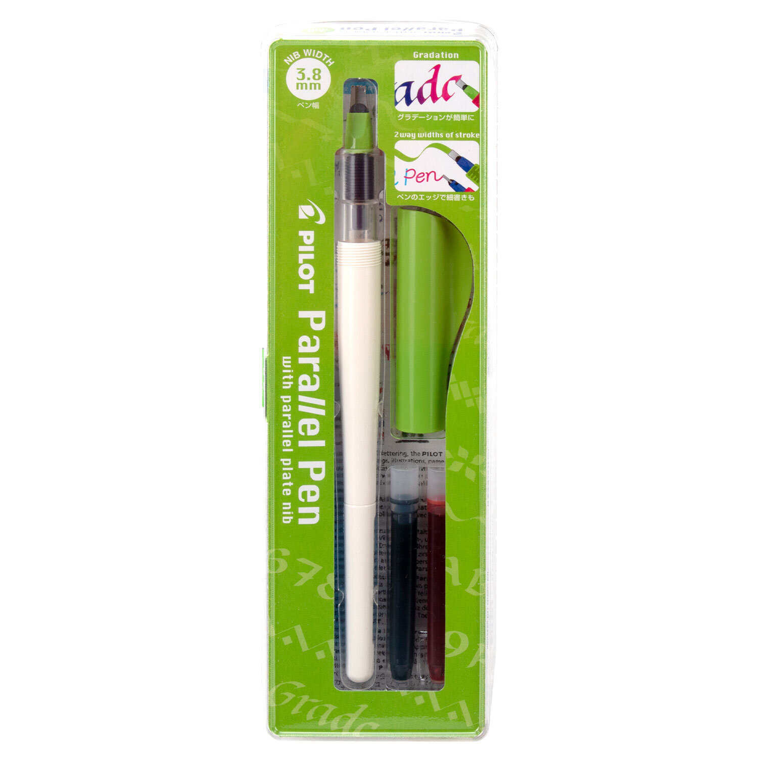 Ручка перьевая для каллиграфии PILOT Parallel Pen, перо 3,8 мм, 2 картриджа, блистер Код товара: 144709 1 057,02 ₽ Купить Производитель:PILOT Перьевая ручка с картриджами - это практичное решение, особенно для тренировок и оттачивания навыков каллиграфа. Кроме того, она незаменима для работы с большими объемами текстов. Особая конструкция пера представляет собой две параллельные пластины, что позволяет получать более гармоничный и отточенный штрих по сравнению с аналогами. Пишущий узел снабжен инновационной системой High Controller (Ink Regulator). Система подачи чернил High Controller (Ink Regulator) регулирует поступление чернил в пишущий узел, задерживая излишки и обеспечивая равномерность их подачи до последней капли. Можно писать всем срезом пера (широкий штрих) или углом пера (тонкий штрих). Уникальный состав чернил позволяет смешивать их, получая красивые градиентные переходы. В комплект входят: ручка, колпачок, плёнка для очистки пера от остатков чернил, два картриджа, конвертор-пипетка для промывки ручки от остатков чернил. Ширина пера – 3,8 мм.Производство: ЯпонияЦвет чернил*: красный, черныйЦвет чернил: черный/красныйЦвет корпуса: салатовыйКоличество сменных картриджей в комплекте: 2 шт.Форма корпуса: круглаяСерия: Parallel PenУпаковка: пластиковая коробкаСрок годности: 36 месВес: 40 грРазмер упаковки: 2 × 19.5 × 6.5 смОбъём: 0.0003 м3Промежуточная упаковка: 12 штТранспортная упаковка: 144 штШтрих-код: 4902505192388 Файлы Сертификат-1.jpg Сертификат-2.jpg Сертификат-3.jpg Сертификат-4.jpg