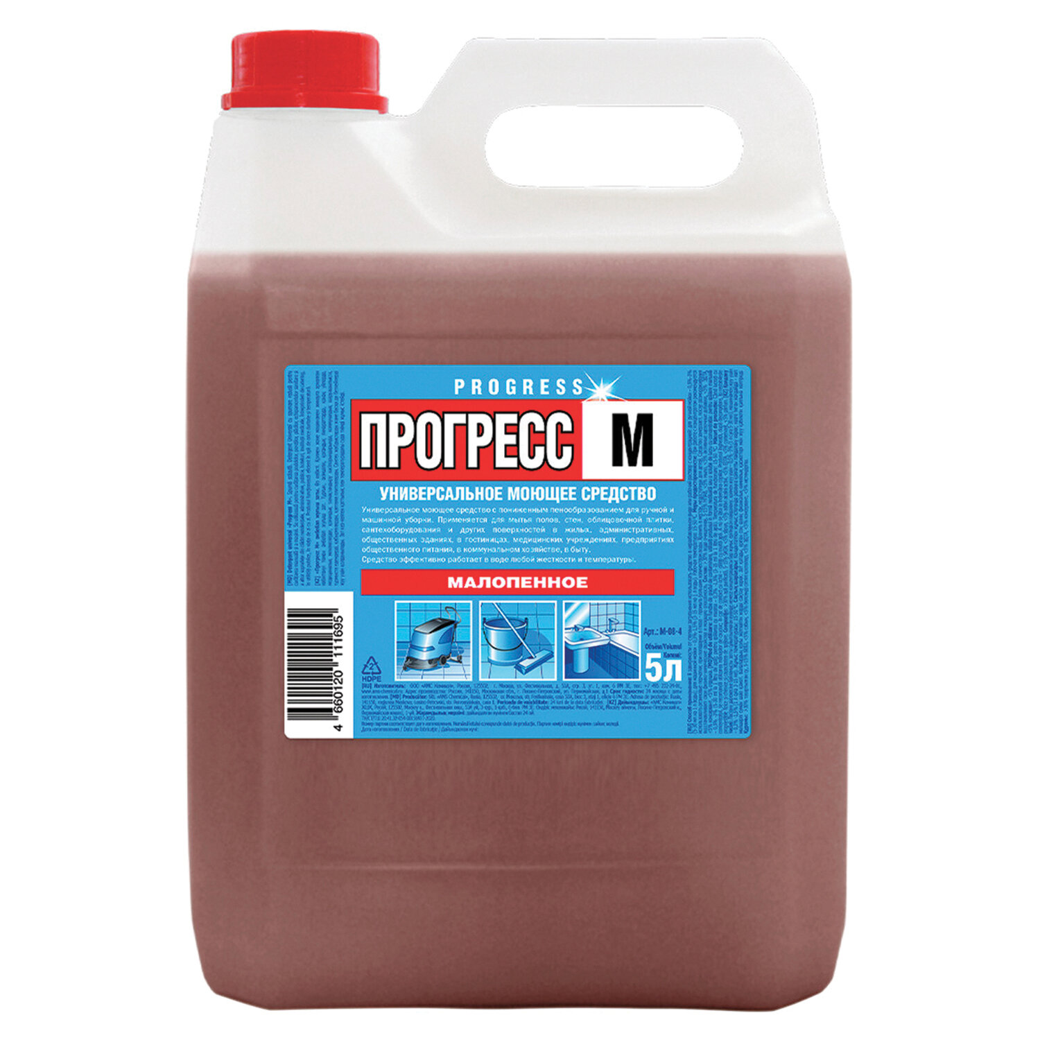Малопенное концентрированное, слегка загущенное универсальное моющее средство для ручной и машинной уборки ПРОГРЕСС М в формате 5 л. Представляет собой высокоактивную слабощелочную систему с пониженным пенообразованием. Предназначено для мытья полов, стен, облицовочной плитки, сантехоборудования и других твердых поверхностей. Работает в воде любой жесткости и температуры. Подходит для поломоечных машин.