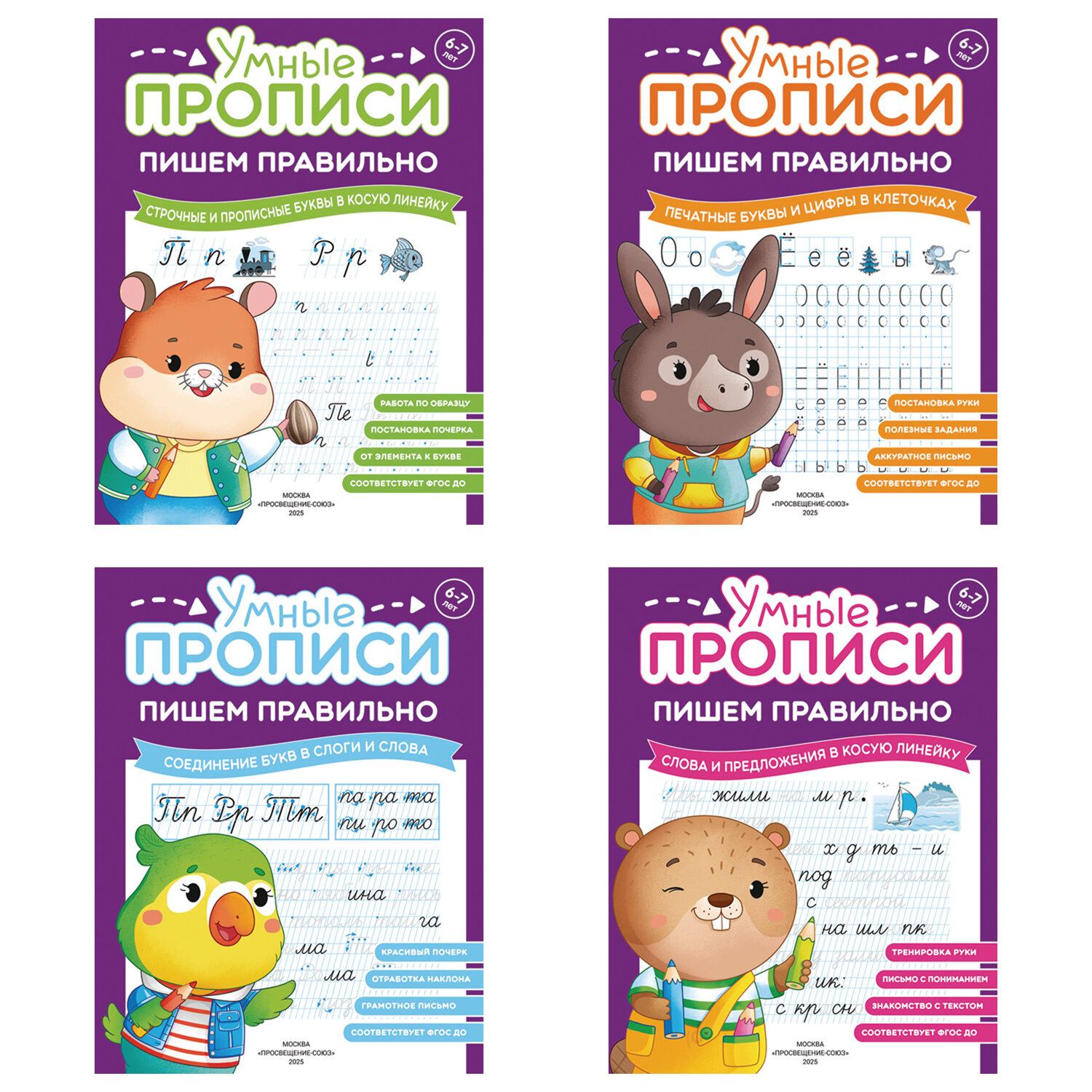 Прописи "Умные прописи ПИШЕМ ПРАВИЛЬНО", 6+, КОМПЛЕКТ 4шт, 64стр, 160x215, ПРОСВЕЩЕНИЕ,0417-01 Код товара: 691227 175,67 ₽ Купить Производитель:ПРОСВЕЩЕНИЕ-СОЮЗ Основная цель пособия — развить у ребёнка интеллект, познавательные способности, мелкую моторику. Книга адресована малышам, родителям и педагогам и может быть использована как на групповых занятиях, так и при домашнем обучении. Прописи комплекта «Пишем правильно» для детей 6-7 лет научат написанию букв русского алфавита и цифр, помогут выработать правильный и красивый почерк. Ребенок научится соединять буквы в слоги, слоги – в слова и даже справится с небольшими предложениями! В комплект входят 4 пособия: • Печатные буквы и цифры в клеточках • Строчные и прописные буквы в косую линейку • Слова и предложения в косую линейку • Соединение букв в слоги и слова Прописи включают развивающие задания, которые тренируют внимание и начальную грамотность. Пора браться за письмо!Производство: РоссияИздательство: ПросвещениеАвтор: нетСерия: Умные прописиТематика: Пишем правильноГод издания: 2025Формат: А5Количество страниц: 16Тип обложки: мягкаяЯзык издания: русскийВозрастное ограничение: от 6 летВес: 150 грРазмер упаковки: 0.6 × 16.5 × 21.5 смОбъём: 0.0003 м3Промежуточная упаковка: 46 штТранспортная упаковка: 46 штШтрих-код: 4630264781016 Файлы