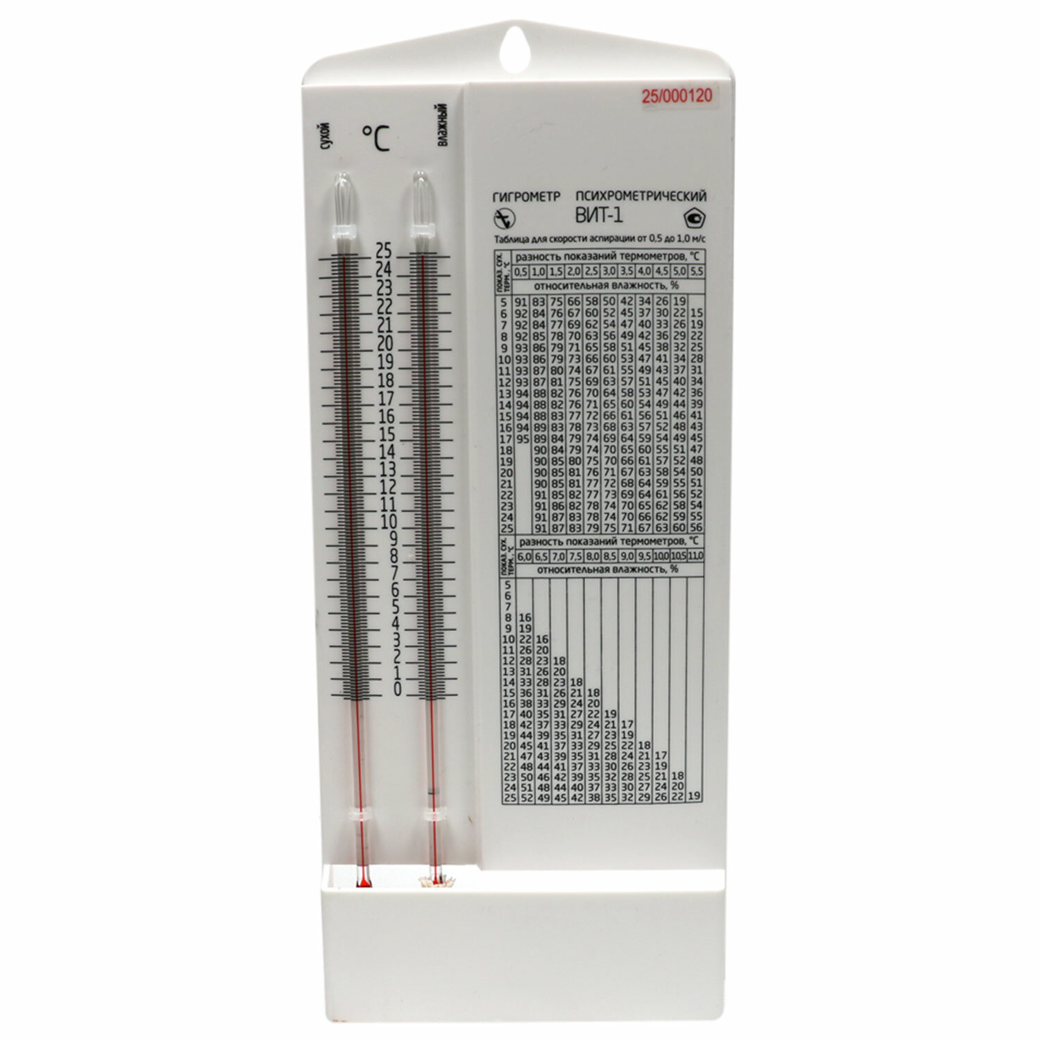Гигрометр психрометрический ВИТ-1 с поверкой РФ, диапазон: от 0 до +25 °С, ПТЗ Код товара: 671460 1 753,29 ₽ Купить Производитель:ПТЗ Гигрометр психрометрический ВИТ предназначен для измерения температуры и относительной влажности окружающей среды в помещениях при помощи психрометрической таблицы. Уровень влажности большинства производственных помещений должен быть строго определенным, соответственно, нужны приборы, которые смогут его измерять. Сегодня это гигрометры: их покупают и устанавливают на складах и полигонах испытаний, в лабораториях и бытовках. Гигрометры психрометрические состоят из пластмассового основания, к которому крепятся два термометра со шкалой, психрометрическая таблица, стеклянный питатель. Резервуар термометра с надписью "увлажненный" увлажняется водой с питателя с помощью батистового или шифонового фитиля. Метод измерения относительной влажности гигрометром психрометрическим основывается на зависимости между влажностью воздуха и психрометрической разницей – разницей показаний "сухого" и "увлажненного" термометров, что состоят в термодинамическом равновесии с окружающей средой. Способ применения: снять показания термометров и определить разность показаний. Затем по показаниям "сухого" термометра и разности показаний "сухого" термометра и "увлажненного" определить относительную влажность воздуха по психрометрической таблице. Прибор внесен в Государственный реестр средств измерений. Межповерочный интервал – 1 год. Поверка осуществляется в системе "Аршин" по номеру, указанному на приборе. Адрес сайта для проверки указан в руководстве по эксплуатации.Производство: РоссияТип товара: гигрометр психрометрическийНазначение: для помещенийДиапазон измерения: от 0 до +25Цена деления: 0,2 °CМатериал основания: пластикТермометрический элемент: толуолСпособ крепления: гвоздь, саморезОсобенности: психрометрическийТермометр: даДлина: 300 ммШирина: 125 ммВысота: 40 ммВес: 0.15 кгСрок годности: 12 месРазмер упаковки: 4.6 × 30 × 13.4 смОбъём: 0.0022 м3Промежуточная упаковка: 16 штТранспортная упаковка: 16 штШтрих-код: 4607157332600 Файлы Сертификат-1.jpg Сертификат-2.jpg Сертификат-3.jpg Сертификат-4.jpg Сертификат-5.jpg Сертификат-6.jpg Сертификат-7.jpg Сертификат-8.jpg