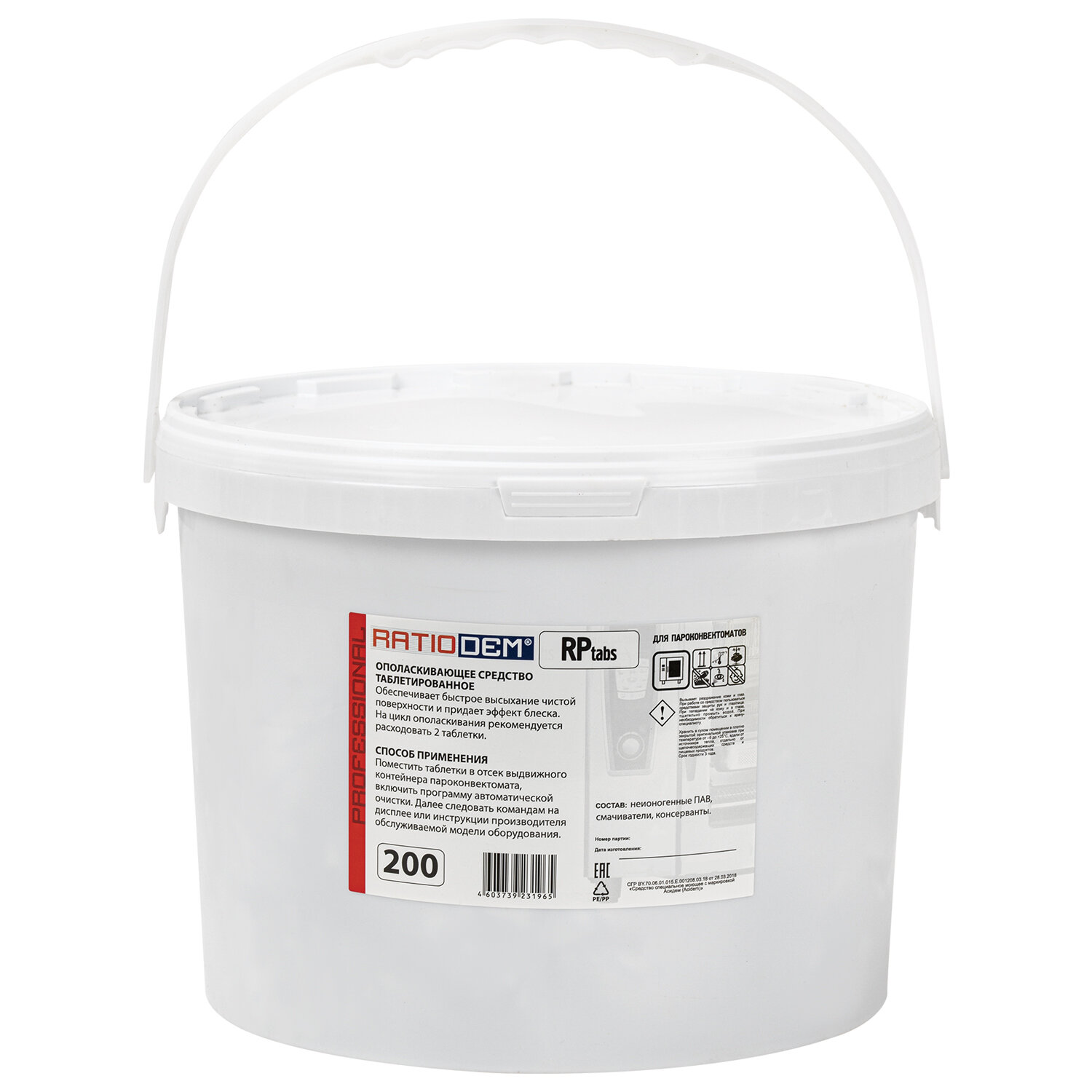Таблетки для пароконвектоматов ополаскивающие 200 шт., RatioDem RP, ведерко Код товара: 609128 4 524,98 ₽ Купить Производитель:RATIODEM Ополаскивающие таблетки для пароконвектоматов RatioDem RP предназначены для автоматического ополаскивания камеры пароконвектомата. Способ применения: Загрузить таблетку в отведенное для ополаскивателя место, согласно инструкции производителя пароконвектомата, после этого необходимо запустить режим автоматического ополаскивания пароконвектомата. Свойства: Обеспечивают быстрое высыхание чистой внутренней поверхности не оставляя разводов, придают эффект блеска. Нейтрализует остатки моющего щелочного средства. Не имеют запаха. Не содержат хлора и фосфатов. Технические характеристики: Внешний вид - таблетки белого цвета. Запах - легкий, характерный. рН 1%-го раствора в дистиллированной воде - 2,0. Плотность при +20 °C: 1,05-1,15 г/см.Производство: РоссияНазначение: для посудомоечных машин и пароконвектоматовОбъём/вес: 4000 мл/гФорма выпуска: таблеткиОтдушка: свежестьПодходит для поверхностей: металл, стеклокерамикаДозатор: нетСерия: RatioDem RPЭффект от использования: без разводов, придает блескБез хлора: даСрок годности: 36 месВес: 4,71 кгРазмер упаковки: 22.3 × 29 × 29 смОбъём: 0.0188 м3Промежуточная упаковка: 1 штТранспортная упаковка: 1 штШтрих-код: 4603739231965 Приложение-1.pdf Сертификат-1.jpg Сертификат-2.jpg