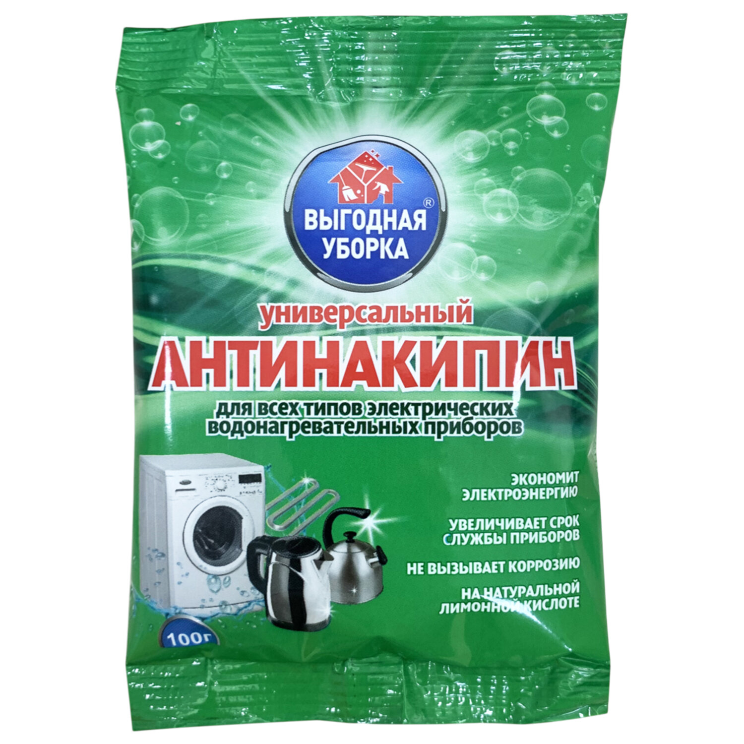 Антинакипин для стиральных машин 100 г, ВЫГОДНАЯ УБОРКА, РЕНЕССАНС КОСМЕТИК, МИНПРОМТОРГ Код товара: 702113 26,82 ₽ Купить Производитель:Ренессанс косметик Средство позволяет прочистить от известковых отложений части чайников, кофеварок, посудомоечных машин и прочей техники. Экономит электроэнергию благодаря повышению теплоотдачи нагревательных элементов. Оставляет после себя приятный свежий запах. • Основные особенности: - экономит электроэнергию, - увеличивает срок службы приборов, - не вызывает коррозию, - на натуральной лимонной кислоте. Состав: хлористый натрий (30% и более), органическая кислота (15% или более, но менее 30%). Способ применения: Для стиральных машин: при каждой стирке добавлять 25 г средства в дозирующий отсек дополнительно к стиральному порошку. Для других водонагревательных приборов: заполнить обрабатываемую посуду водой, высыпать содержимое из расчета 1/2 пакета на 2-2,5 л воды. Прокипятить 20 минут или довести до кипения, отключить и оставить на 2-3 часа. После обработки помыть посуду чистой водой. При необходимости процедуру повторить. Меры предосторожности: важно избегать попадания средства в глаза и на кожу, а также не вдыхать его пары или пыль. Условия хранения: температурный режим не ограничен. Хранить в сухом месте!Производство: РоссияФорма выпуска: порошокВес/Объем: 100 г/млОбласть применения: универсальныйУпаковка: пакетСрок годности: 36 месВес: 108 грРазмер упаковки: 2.9 × 9.8 × 9 смОбъём: 0.0003 м3Промежуточная упаковка: 20 штТранспортная упаковка: 20 штШтрих-код: 4680022435217 Сертификат-1.jpg
