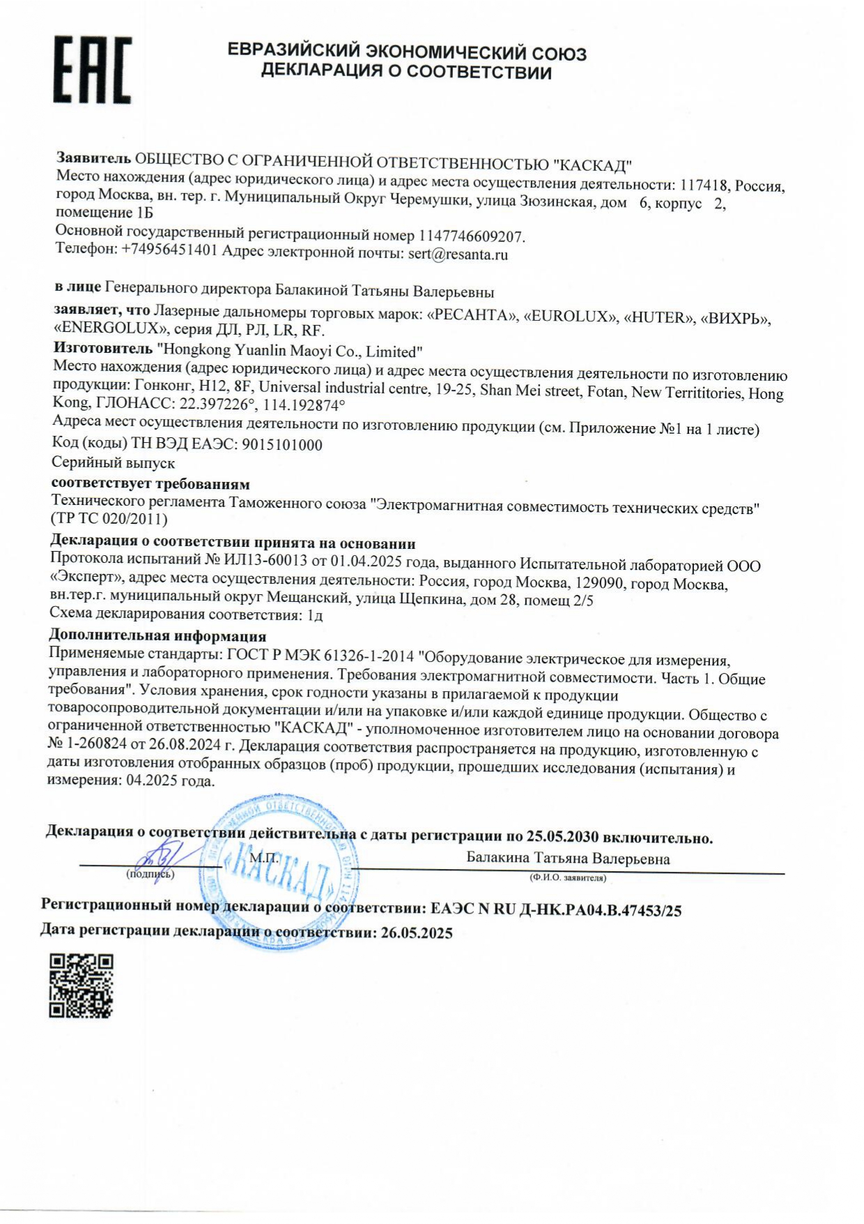 Дальномер лазерный, диапазон измерения от 0,05 м до 60 м, РЕСАНТА ДЛ-60 Код товара: 670420 2 590,01 ₽ Купить Производитель:РЕСАНТА Лазерный дальномер РЕСАНТА ДЛ-60 – компактный прибор, который помогает в максимально точных измерениях. Для него доступна дальность измерений от 0,05 м до 60 м при том, что показатель погрешности составляет ± 2 мм. Лазерный дальномер РЕСАНТА ДЛ-60 производится из надежных компонентов и отличается прекрасными характеристиками. Преимуществом станет прочный корпус, обеспечивающий защиту от механических воздействий. Максимальная дальность – 60 метров. Дальномер можно использовать во время строительных и ремонтных работ, он позволяет быстро узнать расстояние. Погрешность у этой модели незначительная и составляет всего ± 2 мм. Можно быть уверенным в высокой точности данных. В РЕСАНТА ДЛ-60 предлагается несколько единиц измерения. Можно использовать футы, дюймы, метры. Во встроенной памяти сохраняется 20 последних результатов для быстрого доступа к ним. У устройства есть дополнительные полезные функции. Среди них: расчет объема, площади помещения, формулы Пифагора. Результаты можно складывать или вычитать. Дальномер удобен для быстрых подсчетов. Работает автономно, от гальванических элементов типоразмера ААА, которые устанавливаются в выделенный отсек и обеспечивают продолжительное функционирование устройства.Производство: КитайДиапазон измерения - 0,05-60 м.Точность измерения - +/-2 мм.Наименьшая используемая единица измерения - 1 мм.Оптимальная рабочая температура - от -10 до +40 С.Класс лазера - 2.С подсветкой дисплея.Аккумулятор - 3хААА 1,5 В.Размер - 115х50х33 мм.Вес - 115 г.Вес: 198 грРазмер упаковки: 4.5 × 16.7 × 11.3 смОбъём: 0.0009 м3Промежуточная упаковка: 20 штТранспортная упаковка: 20 штШтрих-код: 4606059018858 Файлы Сертификат-1.jpg Сертификат-2.jpg Сертификат-3.jpg Сертификат-4.jpg