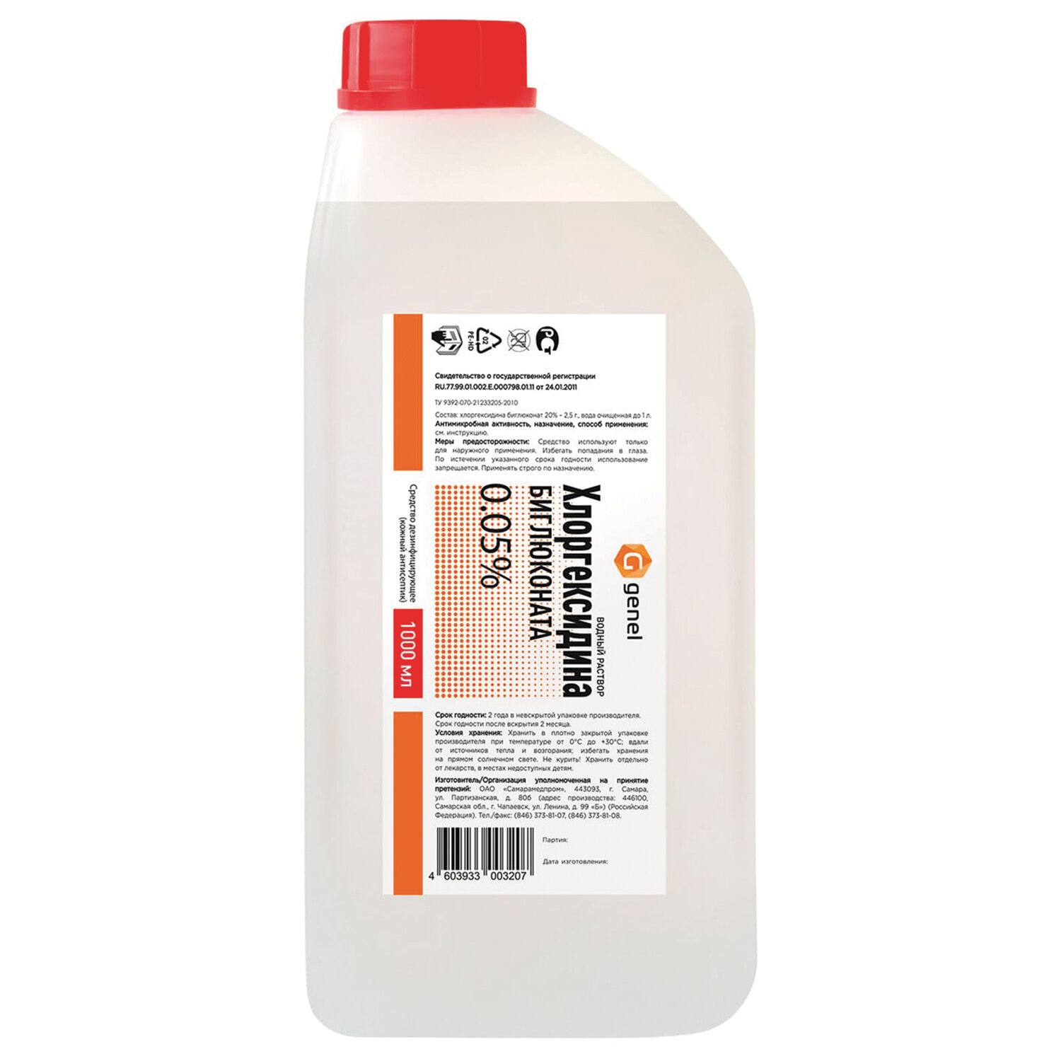 Средство дезинфицирующее Хлоргексидин водный 0,05%, пластиковый флакон, 1 л, Самарамедпром Код товара: 608299 176,4 ₽ Купить Производитель:САМАРАМЕДПРОМ Хлоргексидин водный раствор 0,05% - это универсальное антисептическое средство без запаха и резкого вкуса. Бережно и быстро очищает, дезинфицирует поверхность кожи. Состав: хлоргексидина биглюконат – 0,05%, вода очищенная. Водный раствор хлоргексидина может использоваться для гигиены рук и профилактической дезинфекции в период повышенной эпидемиологической угрозы. Основное применение раствора хлоргексидина заключается в обработке повреждений кожи, в том числе ожогов, при инфекциях, вызванных различными возбудителями (вирусы, бактерии, грибы). Пригоден для: - обеззараживания повреждений кожных покровов, в том числе ожоговых ран; - антисептической обработки рабочих поверхностей и инвентаря; - санитарной обработки рук медперсонала до и после врачебных манипуляций, в том числе, обеззараживание одноразовых перчаток во время хирургических вмешательств; - обеззараживания поверхности кожи перед врачебными манипуляциями. Подходит для гигиенической обработки рук учащихся общеобразовательных учреждений, персонала детских дошкольных и школьных учреждений.Производство: РоссияФорма выпуска: жидкостьРежимы дезинфекции: дезинфекция кожных покровов, дезинфекция поверхностейОбласть применения: детские учреждения (детсады, школы и т.п.), коммунальные объекты (бани, бассейны, гостиницы, общественные туалеты и т.п.), курортные, спортивные и культурно-оздоровительные комплексы, лаборатории, ЛПУ, парикмахерские, косметические салоны и т.п., предприятия общественного питания, предприятия перерабатывающей промышленности, применение в быту, учреждения культуры, отдыха (кинотеатры, музеи, театры), учреждения соцобеспеченияКонцентрация: 0.05 %Объем: 1 лТип активности: бактерии, вирусы, патогенные грибыСодержит: хлоргексидинСерия: хлоргексидинСоответствует требованиям ГОСТа: ГОСТ 12.1.007-76 п.1.2, 1.3Подходит для использования в детских учреждениях: даНаличие СГР на дез. средство (кожный антисептик): даpH: 7Дозатор: нетУпаковка: флаконСрок годности: 36 месВес: 1,13 кгРазмер упаковки: 24.2 × 9.9 × 6.3 смОбъём: 0.0018 м3Промежуточная упаковка: 8 штТранспортная упаковка: 8 штШтрих-код: 4603933011486 Приложение-1.pdf Сертификат-1.jpg Сертификат-2.jpg