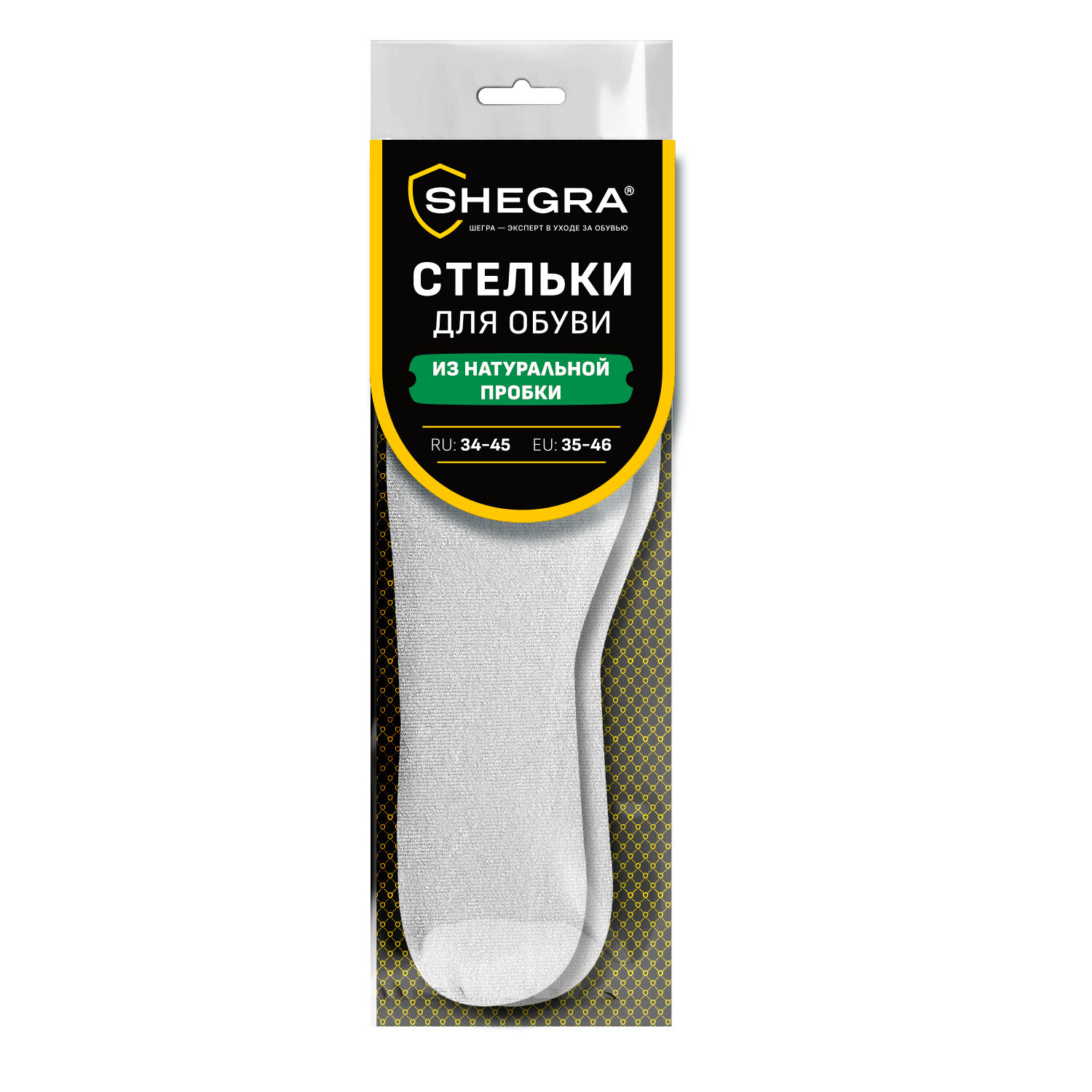 Стельки для обуви из НАТУРАЛЬНОЙ ПРОБКИ, УНИВЕРСАЛЬНЫЙ размер 34-45 / EU 35-46, с линиями выреза, SHEGRA (ШЕГРА) Код товара: 700734 129,36 ₽ Купить Производитель:SHEGRA Стельки для обуви SHEGRA из НАТУРАЛЬНОЙ ПРОБКИ отлично подойдут для любой обуви, обеспечат комфорт при ходьбе и оптимальный микроклимат. Стельки для обуви с российским размером RU 34-45, что соответствует европейскому размеру EU 35-46. На стельках указаны оба стандарта размера: RU и EU, а также нанесены линии выреза. Для удобства на упаковке приведена таблица соответствия размеров RU/EU. Натуральная пробковая основа стельки обеспечивает амортизацию стопы при ходьбе, эффективно снижая нагрузку на нее. Дышащее махровое покрытие отлично впитывает влагу и помогает надолго сохранять свежесть у вас в обуви. Верхний слой делает стельки мягкими и удобными для повседневной носки. Обрежьте стельку по нанесенному размеру вашей стопы или по размерам стельки, имеющейся у вас в обуви. Вложите стельку тканевой стороной вверх. В целях гигиены рекомендуется менять стельки раз в два месяцаПроизводство: КитайТип товара: стельки для обувиРазмер RU (российский): 34-45Размер EU (европейский): 34-46Стандарт размерной сетки на стельках: RU/EU (российский и европейский)Разметка для выреза на стельках: даТаблица соответствия размеров RU/EU на упаковке: даСерия: Basic lineОсобенность: из натуральной пробкиМатериал: натуральная пробка, махровая тканьВлаговпитывающее покрытие: даУпаковка: пакет с европодвесомВес: 42 грРазмер упаковки: 0.6 × 30.5 × 11.6 смОбъём: 0.0003 м3Промежуточная упаковка: 12 штТранспортная упаковка: 120 штШтрих-код: 4606224497846 Файлы Сертификат-1.jpg Сертификат-2.jpg Сертификат-3.jpg Сертификат-4.jpg Сертификат-5.jpg Сертификат-6.jpg Сертификат-7.jpg Сертификат-8.jpg Сертификат-9.jpg Сертификат-10.jpg Сертификат-11.jpg Сертификат-12.jpg Сертификат-13.jpg Сертификат-14.jpg Сертификат-15.jpg Сертификат-16.jpg Сертификат-17.jpg Сертификат-18.jpg Сертификат-19.jpg Сертификат-20.jpg Сертификат-21.jpg Сертификат-22.jpg Сертификат-23.jpg Сертификат-24.jpg Сертификат-25.jpg Сертификат-26.jpg