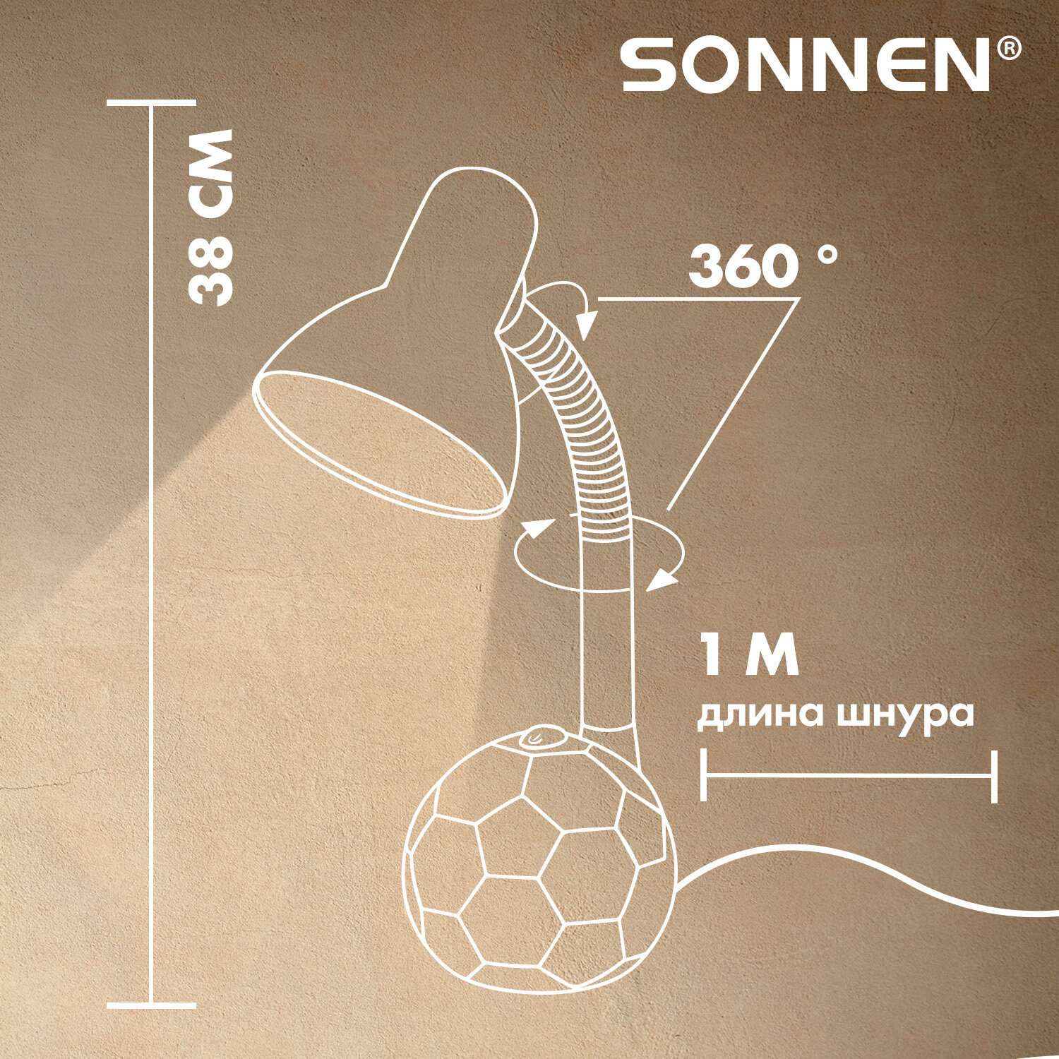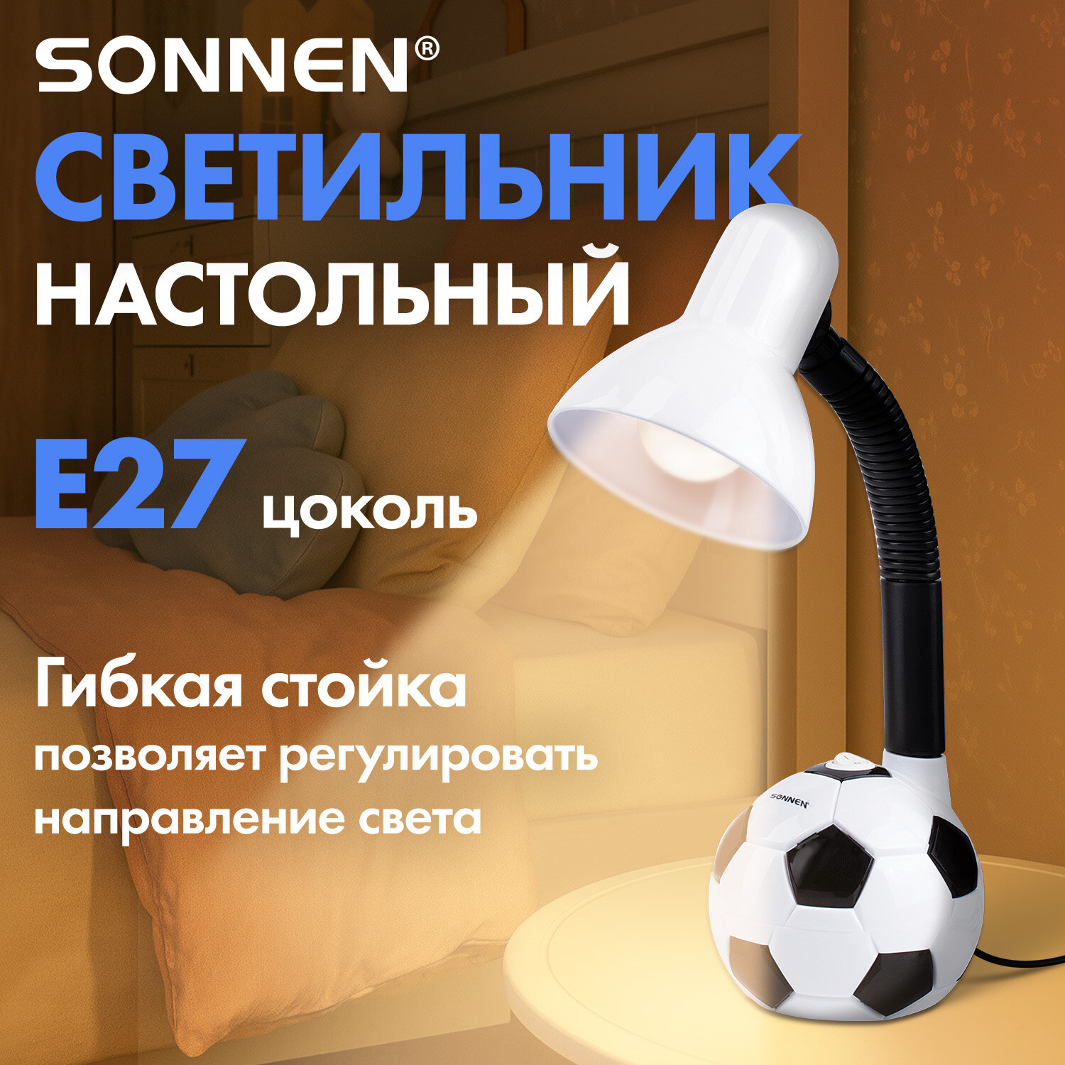 Настольная лампа / светильник SONNEN OU-503, на подставке, цоколь Е27, "Мяч", белый Код товара: 236675 1 057,18 ₽ Купить Производитель:SONNEN Настольный светильник SONNEN OU-503 - выбор настоящего футболиста! Легкость в управлении и гибкая стойка делают эксплуатацию светильника максимально комфортной. Для светильника высотой 38 см подходит любая технология бытовых ламп (накаливания, люминисцентная, светодиодная) с цоколем Е27, благодаря чему можно самостоятельно выбрать яркость и оттенок света. При использовании лампы накаливания, максимальная мощность не должна превышать 40 Вт. Яркий и стильный корпус из пластика добавит индивидуальности в организации Вашего рабочего и домашнего пространства. Поставляется в комплекте с подставкой. Лампочка в комплект не входит. Производитель сохраняет за собой право на внесение изменений в технические характеристики, комплектацию и конструкцию данной модели для улучшения эксплуатационных свойств без предварительного уведомления.Производство: КитайТип лампы: любаяТип крепления: подставкаМощность: 40 ВтЦоколь: Е27Назначение: детскийСерия: OU-503Кол-во режимов свечения: 1Источник света: сменная лампа накаливания / КЛЛ / LEDИсточник питания: сетьРасположение кнопки выключателя: на подставкеПроизвольная регулировка направления подсветки: даСкладная конструкция: даВысота: 38 смДлина шнура: 1 мМатериал корпуса: пластикЦвет корпуса: белыйВес: 1,05 кгРазмер упаковки: 13 × 23.4 × 20 смОбъём: 0.0068 м3Промежуточная упаковка: 20 штТранспортная упаковка: 20 штШтрих-код: 4606224171982 Файлы Приложение-1.pdf Сертификат-1.jpg Сертификат-2.jpg Сертификат-3.jpg Сертификат-4.jpg