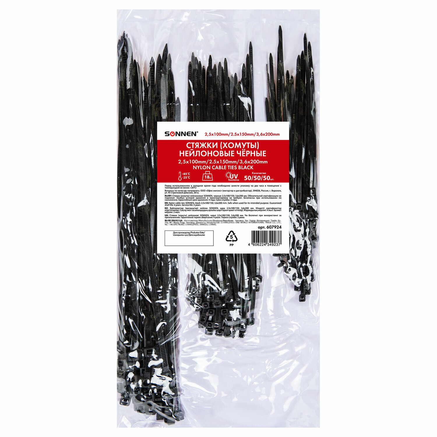 Стяжки (хомуты) нейлоновые сверхпрочные НАБОР 150 шт. (2,5х100/150 мм; 3,6х200 мм), черные, SONNEN Код товара: 607924 171,35 ₽ Купить Производитель:SONNEN Стяжки (хомуты) нейлоновые SONNEN используются при проведении электромонтажных работ для крепления кабелей, проводов и других предметов к несущей поверхности или для соединения между собой. Такие стяжки также используются для бытовых и хозяйственных нужд. Стяжки (хомуты) представляют собой тонкую, эластичную полоску из нейлона высокой прочности (PA 6.6) с замком на конце. Благодаря применению качественного нейлона стяжки (хомуты) сочетают высокую прочность и пластичность, стойкость к перепадам температурного режима и уровня влажности воздуха. В нашем ассортименте представлены стяжки (хомуты) различные по длине (от 100 до 300 мм) и ширине (2.5 и 3,6 мм). Также в наличии имеются стяжки (хомуты) белые, черные и цветные. Стяжки (хомуты) нейлоновые SONNEN обеспечивают надежное, быстрое и экономичное крепление. Они просты и удобны в использовании: большим пальцем левой руки прижмите замок к пучку, а правой рукой затяните петлю, вставьте конец затяжки в замок и затяните до полной фиксации, после чего отрежьте выступающую часть бандажа. Не рекомендуется перегибать бандаж при затяжке. Производитель сохраняет за собой право на внесение изменений в технические характеристики, комплектацию и конструкцию данной модели для улучшения эксплуатационных свойств без предварительного уведомления.Производство: КитайМатериал: нейлонРазмер (ШхД): 2,5х100; 2,5х150; 3,6х200 ммMin диаметр: 3 ммMax диаметр: 53 ммНабор хомутов: даРабочая температура: -25°C - +85°CМаксимальная рабочая нагрузка: 18 кгКоличество в упаковке: 150 шт.Серия: SetЦвет: черныйУпаковка: ПолибэгВес: 0.082 кгРазмер упаковки: 2.3 × 25 × 12.5 смОбъём: 0.0003 м3Промежуточная упаковка: 50 штТранспортная упаковка: 200 штШтрих-код: 4606224349237 Файлы Сертификат-1.jpg Сертификат-2.jpg Сертификат-3.jpg Сертификат-4.jpg Сертификат-5.jpg Сертификат-6.jpg Сертификат-7.jpg Сертификат-8.jpg Сертификат-9.jpg Сертификат-10.jpg Сертификат-11.jpg Сертификат-12.jpg Сертификат-13.jpg Сертификат-14.jpg Сертификат-15.jpg Сертификат-16.jpg Сертификат-17.jpg Сертификат-18.jpg Сертификат-19.jpg Сертификат-20.jpg Сертификат-21.jpg Сертификат-22.jpg Сертификат-23.jpg Сертификат-24.jpg Сертификат-25.jpg Сертификат-26.jpg