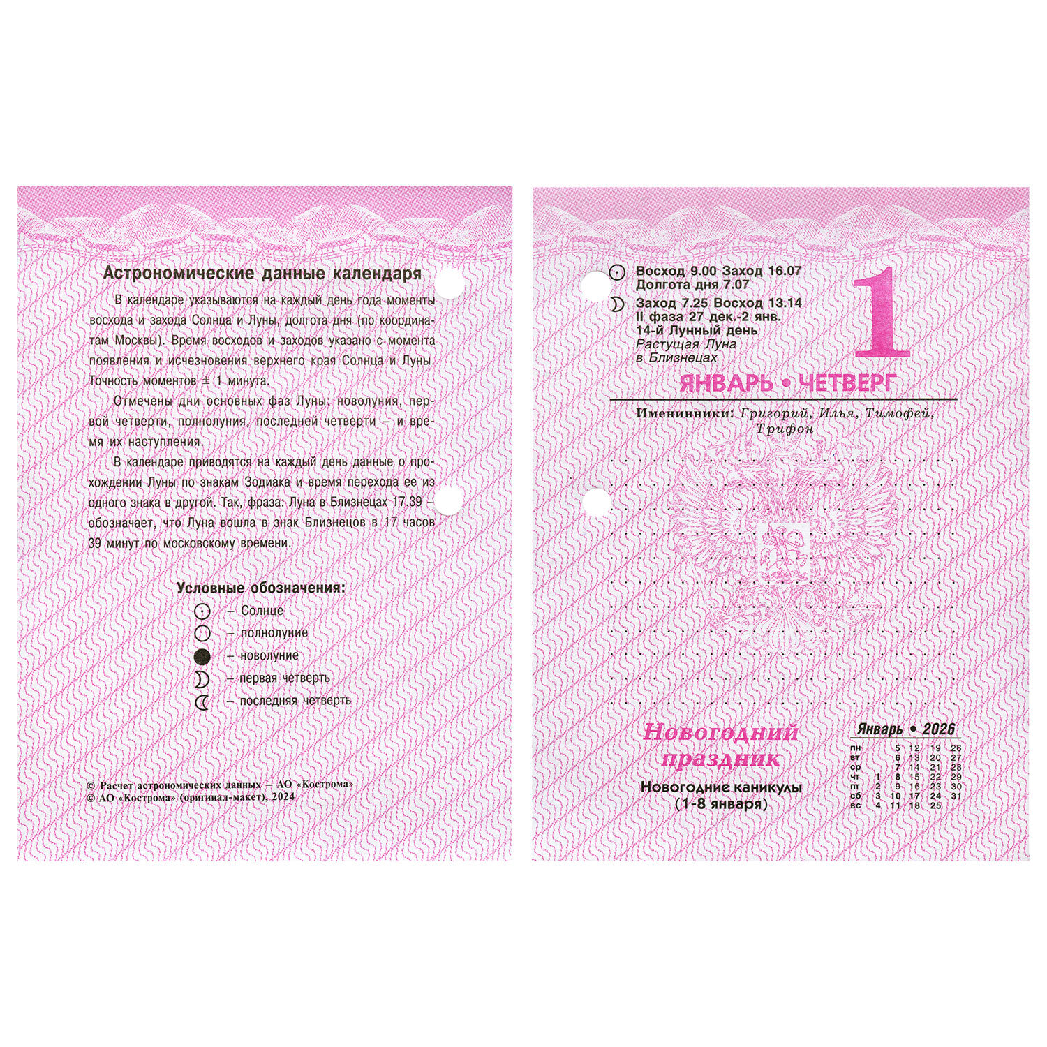 Календарь настольный перекидной на 2026 г., 160 л., блок офсет, цветной, 2 краски, STAFF, "СИМВОЛИКА" Код товара: 117431 158,42 ₽ Купить Производитель:STAFF Настольный перекидной календарь STAFF представляет собой сменный блок для календарной подставки. Предназначен для планирования событий в офисе, на предприятии или дома. Внимание! В комплект с календарем подставка не входит. Блок календаря на 2026 год напечатан на офсетной бумаге плотностью 60 г/м2 в две краски с выделением цветом выходных и праздничных дней. Справочная информация на 160 листах: календарь на текущий месяц, часы восхода и захода солнца, долгота дня, лунный календарь, праздники. Вертикальное расположение. Размер – 10х14 см. Поставляется в индивидуальной упаковке.Производство: РоссияТип календаря: настольный перекиднойГод: 2026Тематика: СИМВОЛИКАДизайн: ГоссимволикаТип скрепления: нетКоличество листов: 160 шт.Высота: 14 смШирина: 10 смВнутренний блок: офсет в 2 краскиПлотность внутреннего блока: 60 г/м2Расположение: вертикальноеИндивидуальная упаковка: даВес: 150 грРазмер упаковки: 1.4 × 14 × 10.2 смОбъём: 0.0002 м3Промежуточная упаковка: 20 штТранспортная упаковка: 20 штШтрих-код: 4606224491844 Файлы Сертификат-1.jpg Сертификат-2.jpg Сертификат-3.jpg Сертификат-4.jpg Сертификат-5.jpg Сертификат-6.jpg Сертификат-7.jpg Сертификат-8.jpg Сертификат-9.jpg Сертификат-10.jpg Сертификат-11.jpg Сертификат-12.jpg Сертификат-13.jpg Сертификат-14.jpg Сертификат-15.jpg Сертификат-16.jpg Сертификат-17.jpg Сертификат-18.jpg Сертификат-19.jpg Сертификат-20.jpg Сертификат-21.jpg Сертификат-22.jpg Сертификат-23.jpg Сертификат-24.jpg Сертификат-25.jpg Сертификат-26.jpg