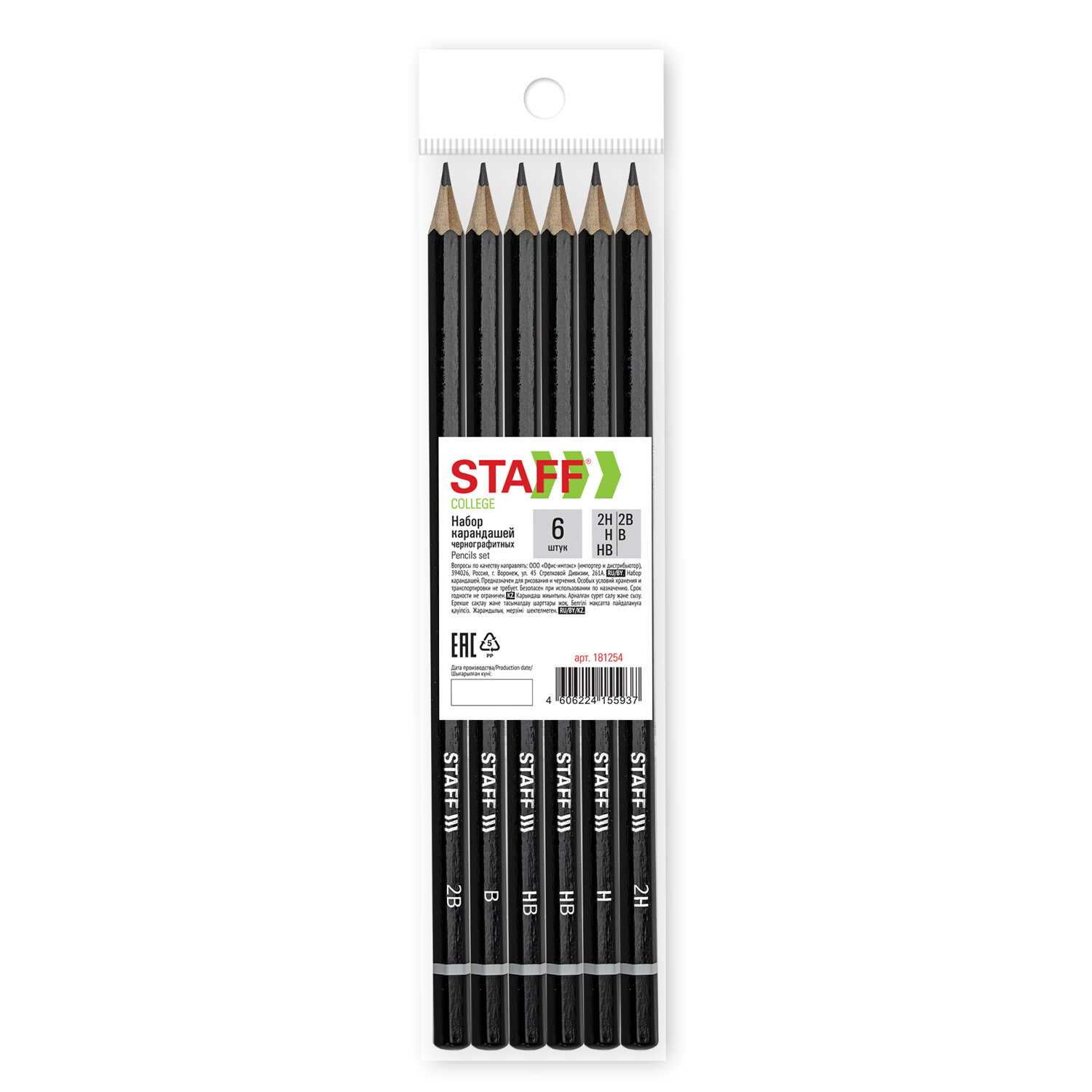 Карандаши чернографитные STAFF "College" BLP-254, НАБОР 6 шт., 2H-2B, черный корпус Код товара: 181254 260,33 ₽ Купить Производитель:STAFF Набор чернографитных карандашей STAFF "College" – универсален для дома, офиса и школы. Подходит для чертежей, письма и рисования. Карандаши изготовлены из дерева высокого качества. Имеют шестигранное сечение. Карандаши длиной 175 мм легко точатся и не крошатся. Набор состоит из карандашей различных степеней твердости: 2H – 1 штука, Н – 1 штука, НВ – 2 штуки, В – 1 штука и 2B – 1 штука. Диаметр грифеля – 2,2 мм. Выполнены в черном цвете. Поставляются заточенными.Производство: КитайТвердость: ассортиЗаточенный: даДиаметр грифеля: 2.2 ммКоличество карандашей в упаковке: 6 шт.Количество твердостей в наборе: 6Серия: CollegeФорма корпуса: шестиграннаяДлина карандаша: 175 ммМатериал корпуса: деревоЦвет корпуса: черныйДизайн: без дизайнаКоличество дизайнов в упаковке: 1 шт.Упаковка: ПП-пакетВес: 31 грРазмер упаковки: 0.7 × 17.4 × 4.1 смОбъём: 0.0001 м3Промежуточная упаковка: 120 штТранспортная упаковка: 480 штШтрих-код: 4606224155937 Сертификат-1.jpg Сертификат-2.jpg Сертификат-3.jpg