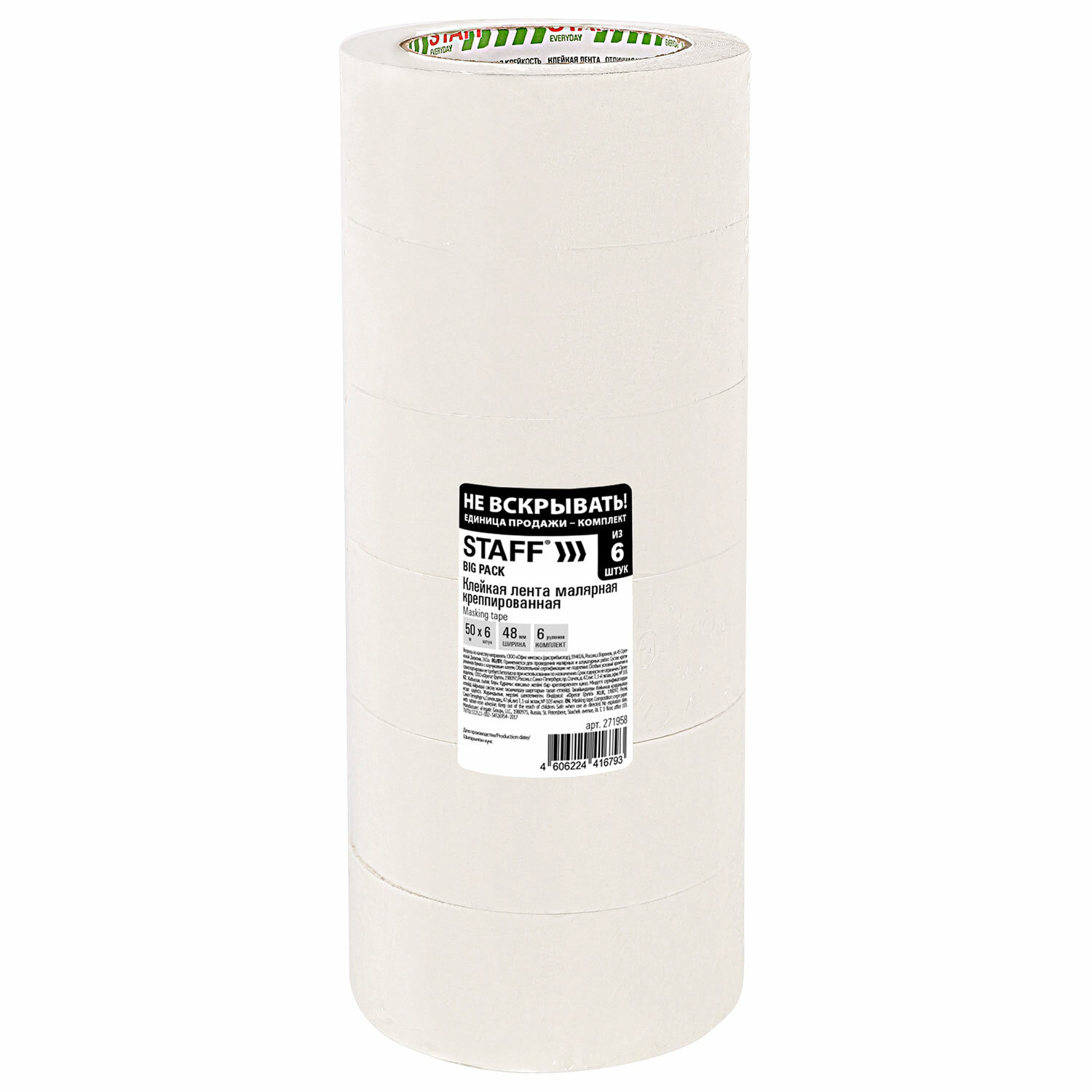 Клейкая лента малярная креппированная 48 мм x 50 м, КОМПЛЕКТ 6 шт., STAFF "BIG PACK2 Код товара: 271958 1 055,52 ₽ Купить Производитель:STAFF Малярная лента STAFF на бумажной основе находит широкое применение при проведении штукатурных и лакокрасочных работ, а также используется в быту для заклейки окон. Изготовлена из креппированной бумаги белого цвета толщиной 125 мкм. Малярная клейкая лента длиной 50 м и шириной 48 мм легко удаляется с поверхности, не оставляя следов. На поверхности ленты можно делать надписи. Легко отрывается без использования ножниц. Клеевой слой - натуральный каучук на основе растворителя. Малярная лента влагостойкая, обеспечивает отличную адгезию с разными типами поверхности. Рабочая температура: от +10 °С до +60 °С. Упакована в спайке из 6 малярных лент в термоусадочной пленкеПроизводство: РоссияВид: малярнаяДлина намотки: 50 мШирина: 48 ммТолщина: 125 мкмКоличество в упаковке: 6 шт.Основа ленты: бумагаВозможность делать надписи на поверхности ленты: даНе оставляет следов клея после удаления: даОснова клеевого слоя: натуральный каучукРабочая температура: от +10 до +60 °СЦвет: белыйУпаковка: термоусадочная пленка с этикеткойВес: 1,17 кгРазмер упаковки: 11.3 × 28.1 × 11.3 смОбъём: 0.0049 м3Промежуточная упаковка: 6 штТранспортная упаковка: 6 штШтрих-код: 4606224416793 Сертификат-1.jpg Сертификат-2.jpg Сертификат-3.jpg