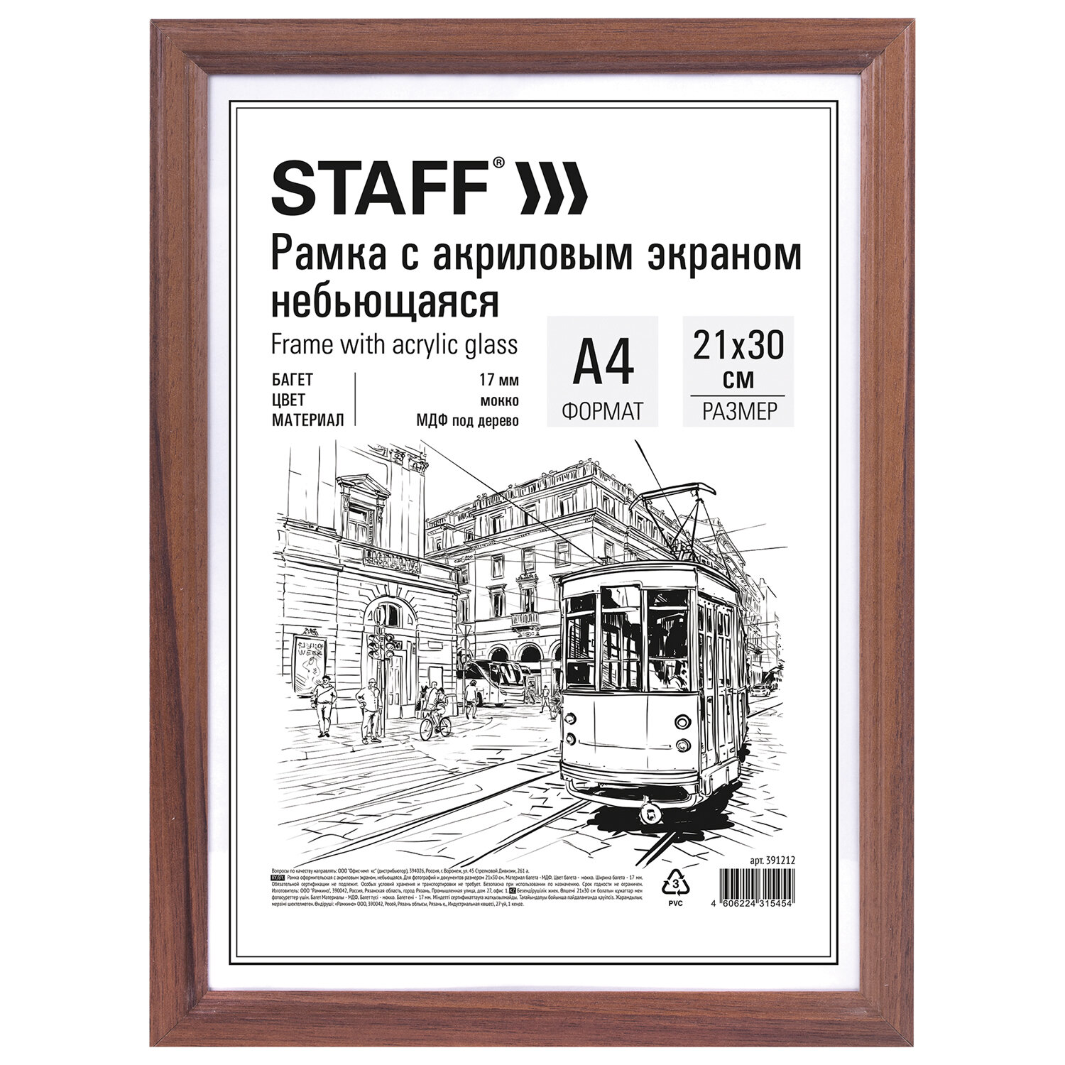 Рамка НЕБЬЮЩАЯСЯ 21х30 см, МДФ под дерево, багет 17 мм, мокко, акриловый экран, STAFF "Carven" Код товара: 391212 220,78 ₽ Купить Производитель:STAFF Рамка STAFF "Carven" для фотографий, дипломов, сертификатов, грамот и других ценных документов гармонично будет смотреться как в офисном, так и в домашнем интерьере, а также в салонах и предприятиях, в магазинах и различных учреждениях. Рамка формата А4 (21х30 см) выполнена из МДФ под дерево в цвете "мокко", за счет чего отлично впишется в домашний и деловой интерьер. Имеется возможность вертикального и горизонтального подвеса. Ширина багета - 17 мм. Благодаря экрану из акрилового стекла рамка является менее хрупкой. Микрогофрокартон обеспечивает плотное прилегание и отсутствие в будущем деформации содержимого в рамке. Поставляется в термоусадочной пленке, которая гарантирует сохранность рамки при транспортировке, отсутствие сколов и потертостей.Производство: РоссияРазмер: 21х30 смНазначение: для фотографий, для дипломов, сертификатов, грамот, для студийных и оформительских работСерия: CarvenДизайн: СовременныйМатериал рамки: МДФЦвет рамки: моккоНебьющаяся: даВозможность размещения: вертикальное, горизонтальноеШирина багета: 17 ммМатериал вставки: акриловое стеклоМатериал подложки: микрогофрокартонУпаковка: термоусадочная пленкаВес: 197 грРазмер упаковки: 1.2 × 32.9 × 24.3 смОбъём: 0.001 м3Промежуточная упаковка: 25 штТранспортная упаковка: 25 штШтрих-код: 4606224315454 Файлы Сертификат-1.jpg Сертификат-2.jpg Сертификат-3.jpg Сертификат-4.jpg Сертификат-5.jpg Сертификат-6.jpg Сертификат-7.jpg Сертификат-8.jpg Сертификат-9.jpg Сертификат-10.jpg Сертификат-11.jpg Сертификат-12.jpg Сертификат-13.jpg Сертификат-14.jpg Сертификат-15.jpg Сертификат-16.jpg Сертификат-17.jpg Сертификат-18.jpg Сертификат-19.jpg Сертификат-20.jpg Сертификат-21.jpg Сертификат-22.jpg Сертификат-23.jpg Сертификат-24.jpg Сертификат-25.jpg Сертификат-26.jpg