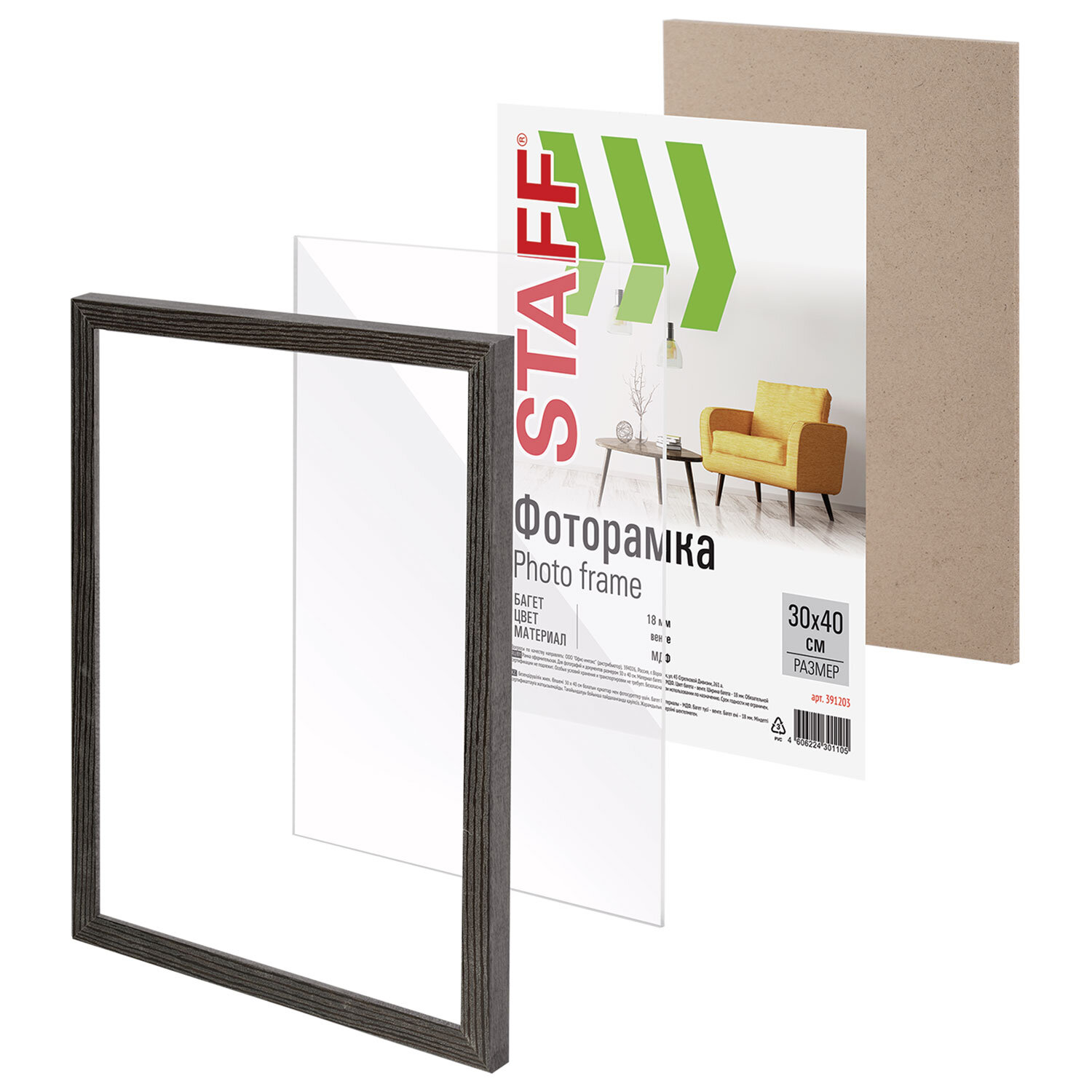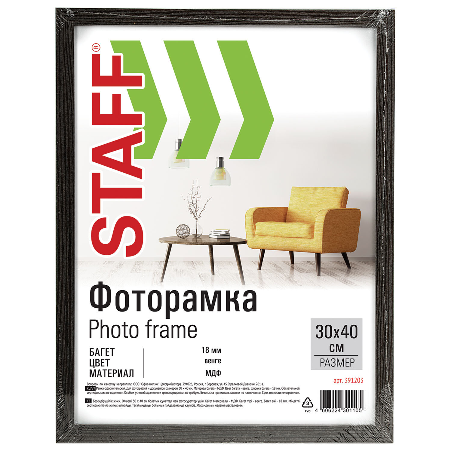 Рамка 30х40 см со стеклом, КОМПЛЕКТ 2 штуки, багет 18 мм МДФ, STAFF "Grand", цвет венге Код товара: 391336 610,2 ₽ Купить Производитель:STAFF Комплект из 2 рамок STAFF "Grand", которые помогут оформить фотографии, постеры, другие памятные композиции большого формата в едином стиле. Рамки будут эффектно смотреться в интерьере магазина, офиса и дома. Рамки формата А3 (30х40 см) выполнены из МДФ в цвете "венге", за счет чего отлично впишутся в домашний и деловой интерьер. Имеется возможность вертикального и горизонтального подвеса. Ширина багета каждой рамки – 18 мм. Аккуратный вид достигается благодаря стеклянной вставке. Переплетный картон обеспечивает плотное прилегание и отсутствие в будущем деформации содержимого в рамке. Каждая из рамок поставляется в термоусадочной пленке. Для дополнительной защиты от сколов и потертостей комплект упакован в индивидуальный трехслойный гофрокороб.Производство: РоссияРазмер: 30х40 смНазначение: для фотографий, для студийных и оформительских работСерия: Grand комплектДизайн: СовременныйМатериал рамки: МДФЦвет рамки: венгеНебьющаяся: даВозможность размещения: вертикальное, горизонтальноеШирина багета: 18 ммМатериал вставки: стеклоМатериал подложки: переплётный картонУпаковка: термоусадочная пленка, воздушно-пузырчатая пленка, гофрокоробВес: 1,44 кгРазмер упаковки: 2.9 × 44.5 × 34.4 смОбъём: 0.0055 м3Промежуточная упаковка: 6 штТранспортная упаковка: 6 штШтрих-код: 4606224418117 Файлы Сертификат-1.jpg Сертификат-2.jpg Сертификат-3.jpg Сертификат-4.jpg Сертификат-5.jpg Сертификат-6.jpg Сертификат-7.jpg Сертификат-8.jpg Сертификат-9.jpg Сертификат-10.jpg Сертификат-11.jpg Сертификат-12.jpg Сертификат-13.jpg Сертификат-14.jpg Сертификат-15.jpg Сертификат-16.jpg Сертификат-17.jpg Сертификат-18.jpg Сертификат-19.jpg Сертификат-20.jpg Сертификат-21.jpg Сертификат-22.jpg Сертификат-23.jpg Сертификат-24.jpg Сертификат-25.jpg Сертификат-26.jpg